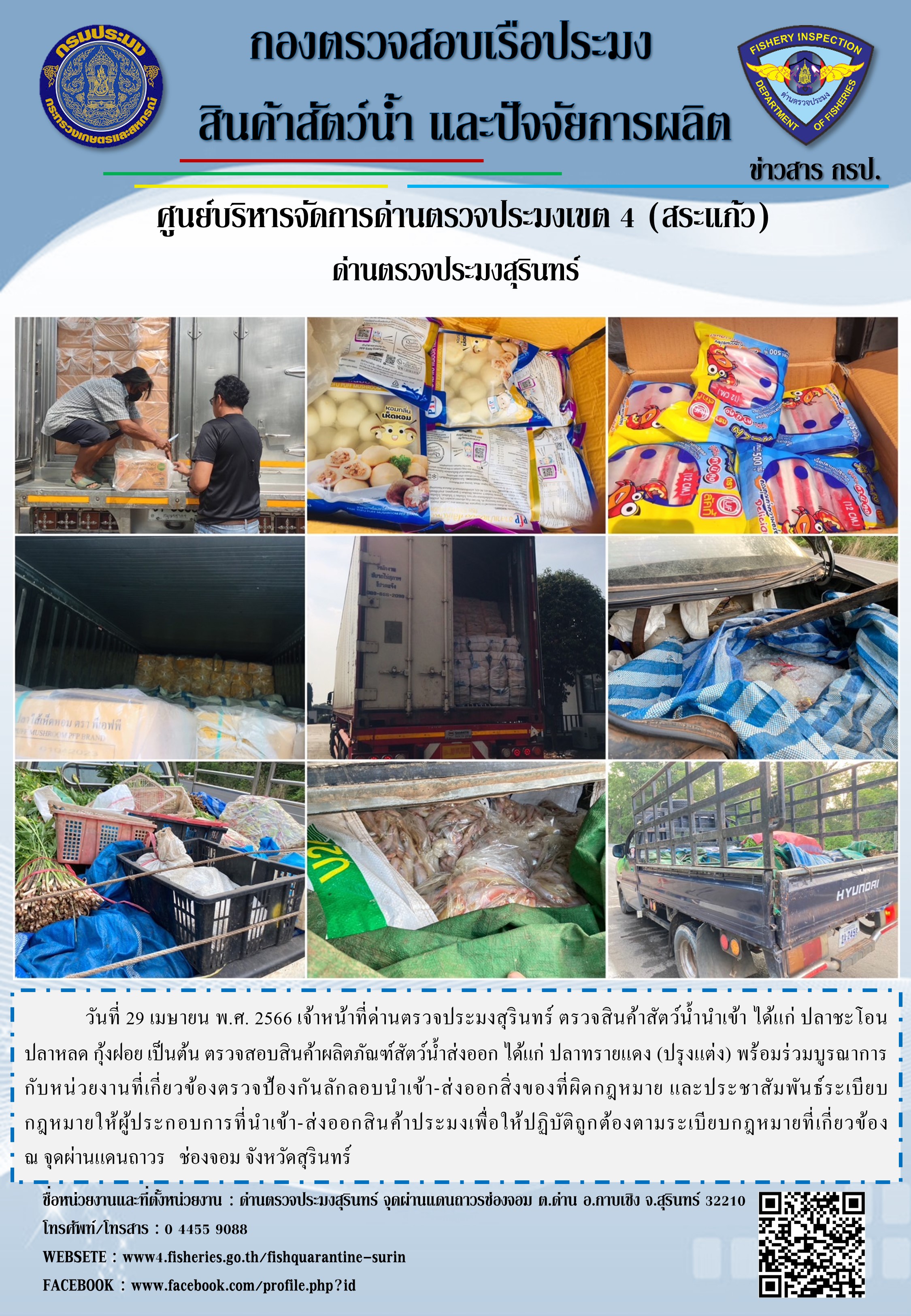 วันที่ 29 เมษายน พ.ศ. 2566 เจ้าหน้าที่ด่านตรวจประมงสุรินทร์ ตรวจสินค้าสัตว์น้ำนำเข้า ได้แก่ ปลาชะโอน ปลาหลด กุ้งฝอย เป็นต้น ตรวจสอบสินค้าผลิตภัณฑ์สัตว์น้ำส่งออก ได้แก่ ปลาทรายแดง (ปรุงแต่ง) พร้อมร่วมบูรณาการกับหน่วยงานที่เกี่ยวข้องตรวจป้องกันลักลอบนำเข้า-ส่งออกสิ่งของที่ผิดกฎหมาย และประชาสัมพันธ์ระเบียบกฎหมายให้ผู้ประกอบการที่นำเข้า-ส่งออกสินค้าประมงเพื่อให้ปฏิบัติถูกต้องตามระเบียบกฎหมายที่เกี่ยวข้อง ณ จุดผ่านแดนถาวรช่องจอม จังหวัดสุรินทร์