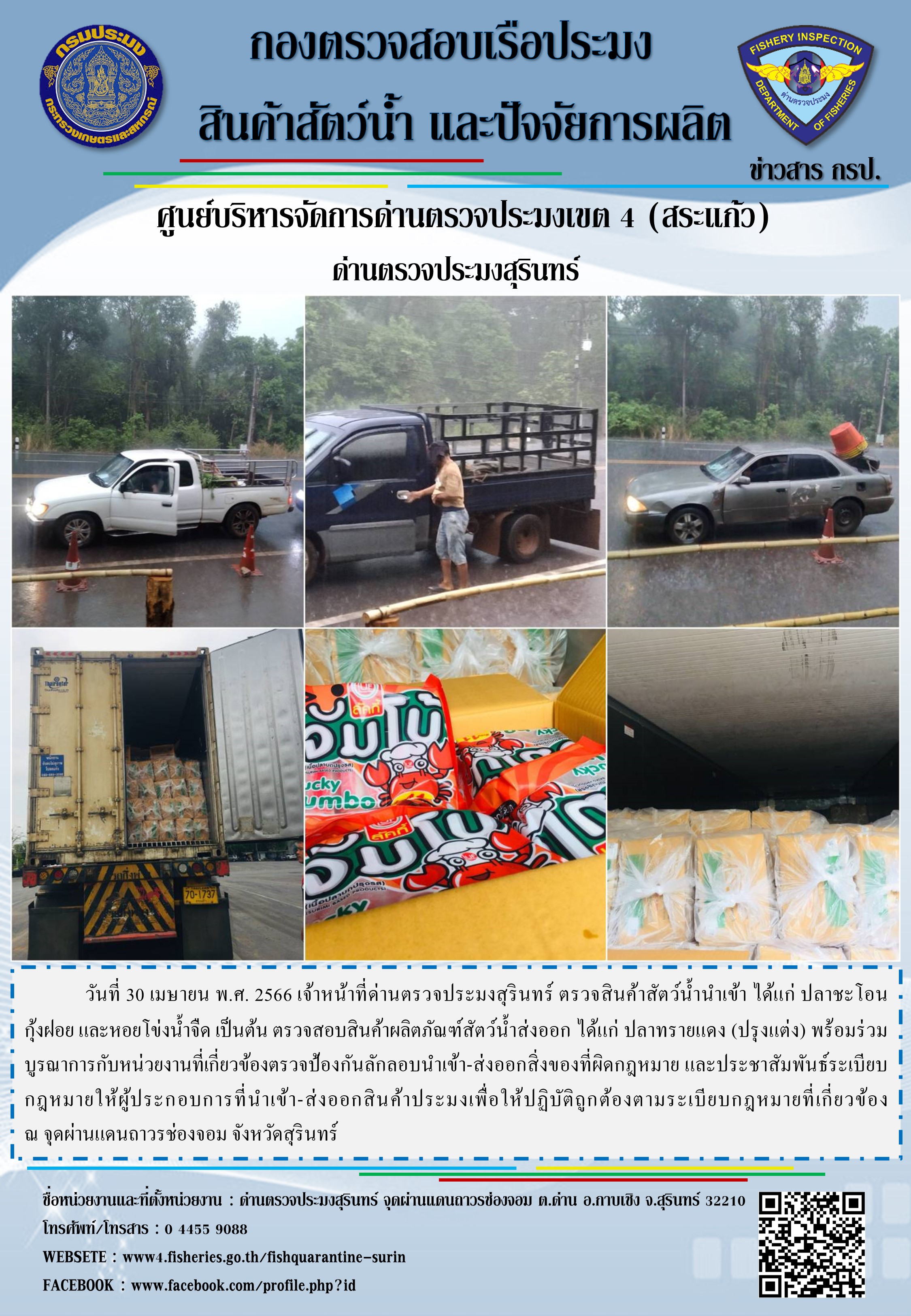 วันที่ 30 เมษายน พ.ศ. 2566 เจ้าหน้าที่ด่านตรวจประมงสุรินทร์ ตรวจสินค้าสัตว์น้ำนำเข้า ได้แก่ ปลาชะโอน กุ้งฝอย และหอยโข่งน้ำจืด เป็นต้น ตรวจสอบสินค้าผลิตภัณฑ์สัตว์น้ำส่งออก ได้แก่ ปลาทรายแดง (ปรุงแต่ง) พร้อมร่วมบูรณาการกับหน่วยงานที่เกี่ยวข้องตรวจป้องกันลักลอบนำเข้า-ส่งออกสิ่งของที่ผิดกฎหมาย และประชาสัมพันธ์ระเบียบกฎหมายให้ผู้ประกอบการที่นำเข้า-ส่งออกสินค้าประมงเพื่อให้ปฏิบัติถูกต้องตามระเบียบกฎหมายที่เกี่ยวข้อง ณ จุดผ่านแดนถาวรช่องจอม จังหวัดสุรินทร์