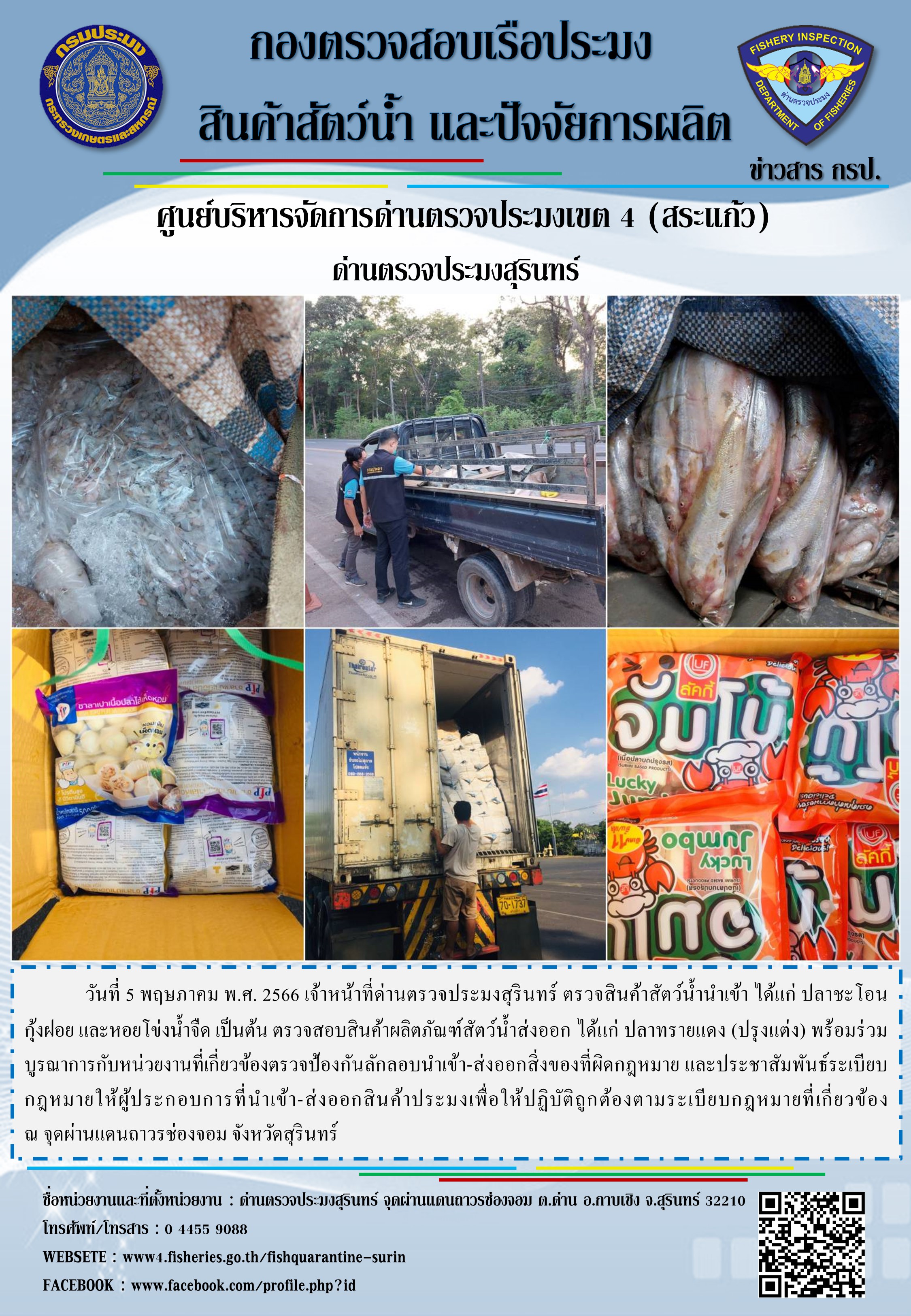 วันที่ 5 พฤษภาคม พ.ศ. 2566 เจ้าหน้าที่ด่านตรวจประมงสุรินทร์ ตรวจสินค้าสัตว์น้ำนำเข้า ได้แก่ ปลาชะโอน กุ้งฝอย และหอยโข่งน้ำจืด เป็นต้น ตรวจสอบสินค้าผลิตภัณฑ์สัตว์น้ำส่งออก ได้แก่ ปลาทรายแดง (ปรุงแต่ง) พร้อมร่วมบูรณาการกับหน่วยงานที่เกี่ยวข้องตรวจป้องกันลักลอบนำเข้า-ส่งออกสิ่งของที่ผิดกฎหมาย และประชาสัมพันธ์ระเบียบกฎหมายให้ผู้ประกอบการที่นำเข้า-ส่งออกสินค้าประมงเพื่อให้ปฏิบัติถูกต้องตามระเบียบกฎหมายที่เกี่ยวข้อง ณ จุดผ่านแดนถาวรช่องจอม จังหวัดสุรินทร์