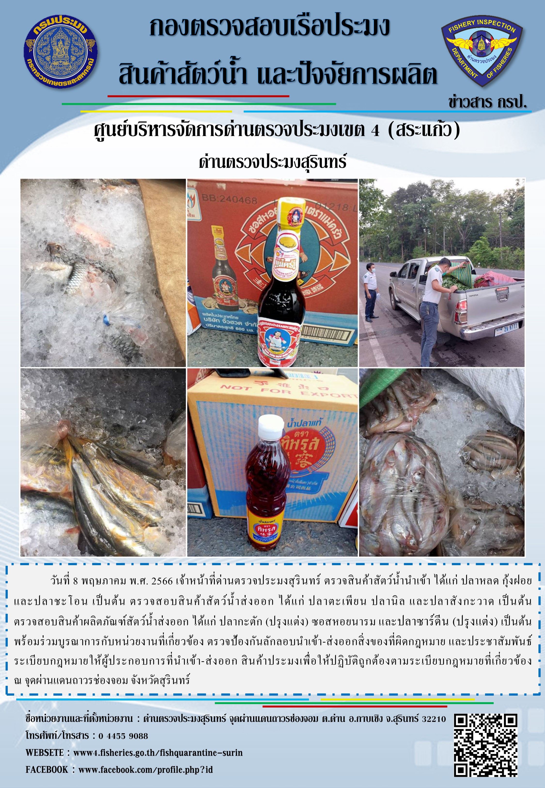 วันที่ 8 พฤษภาคม พ.ศ. 2566 เจ้าหน้าที่ด่านตรวจประมงสุรินทร์ ตรวจสินค้าสัตว์น้ำนำเข้า ได้แก่ ปลาหลด กุ้งฝอย และปลาชะโอน เป็นต้น ตรวจสอบสินค้าสัตว์น้ำส่งออก ได้แก่ ปลาตะเพียน ปลานิล และปลาสังกะวาด เป็นต้น ตรวจสอบสินค้าผลิตภัณฑ์สัตว์น้ำส่งออก ได้แก่ ปลากะตัก (ปรุงแต่ง) ซอสหอยนารม และปลาซาร์ดีน (ปรุงแต่ง) เป็นต้น พร้อมร่วมบูรณาการกับหน่วยงานที่เกี่ยวข้อง ตรวจป้องกันลักลอบนำเข้า-ส่งออกสิ่งของที่ผิดกฎหมาย และประชาสัมพันธ์ระเบียบกฎหมายให้ผู้ประกอบการที่นำเข้า-ส่งออก สินค้าประมงเพื่อให้ปฏิบัติถูกต้องตามระเบียบกฎหมายที่เกี่ยวข้อง ณ จุดผ่านแดนถาวรช่องจอม จังหวัดสุรินทร์