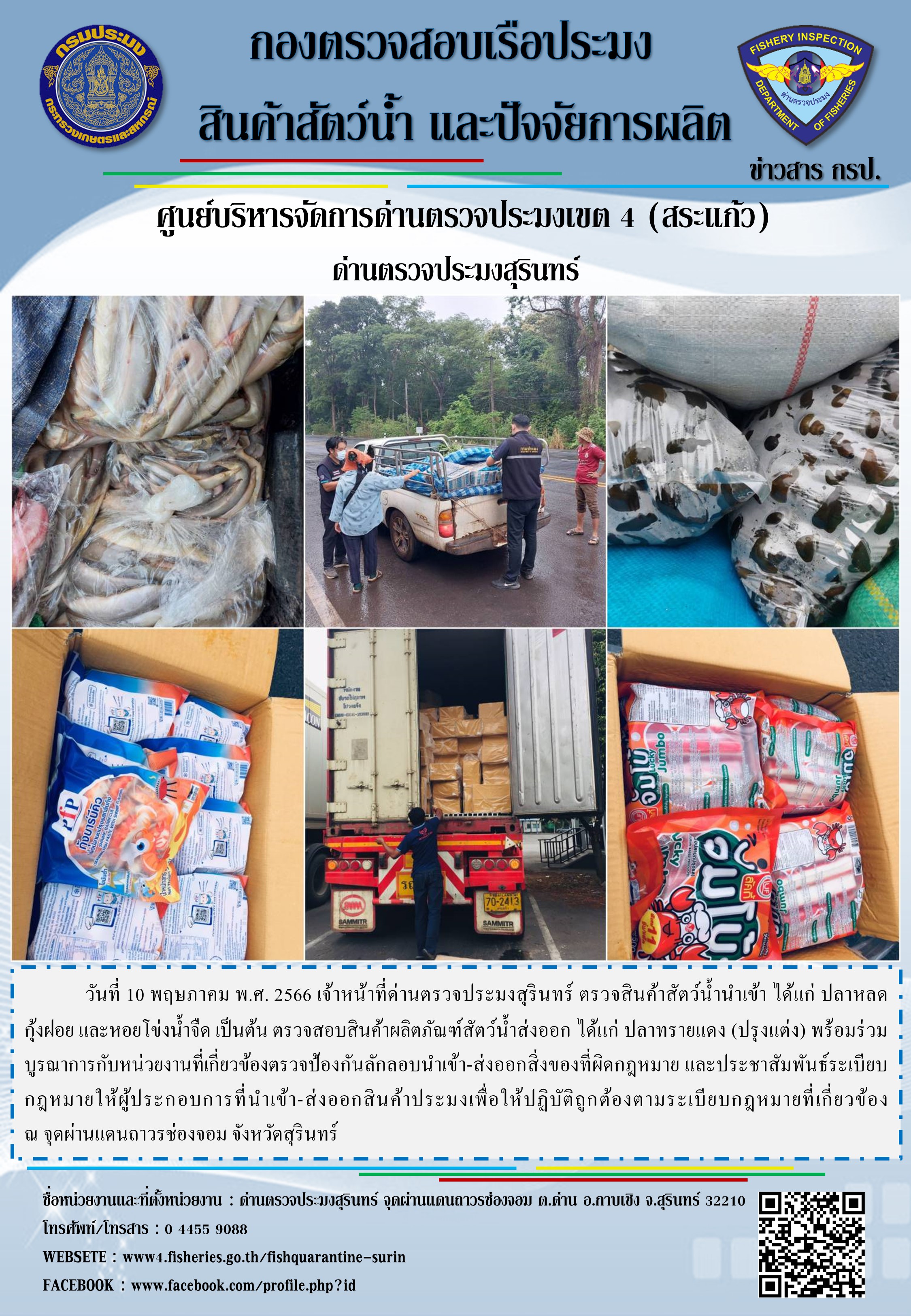 วันที่ 10 พฤษภาคม พ.ศ. 2566 เจ้าหน้าที่ด่านตรวจประมงสุรินทร์ ตรวจสินค้าสัตว์น้ำนำเข้า ได้แก่ ปลาหลด กุ้งฝอย และหอยโข่งน้ำจืด เป็นต้น ตรวจสอบสินค้าผลิตภัณฑ์สัตว์น้ำส่งออก ได้แก่ ปลาทรายแดง (ปรุงแต่ง) พร้อมร่วมบูรณาการกับหน่วยงานที่เกี่ยวข้องตรวจป้องกันลักลอบนำเข้า-ส่งออกสิ่งของที่ผิดกฎหมาย และประชาสัมพันธ์ระเบียบกฎหมายให้ผู้ประกอบการที่นำเข้า-ส่งออกสินค้าประมงเพื่อให้ปฏิบัติถูกต้องตามระเบียบกฎหมายที่เกี่ยวข้อง ณ จุดผ่านแดนถาวรช่องจอม จังหวัดสุรินทร์
