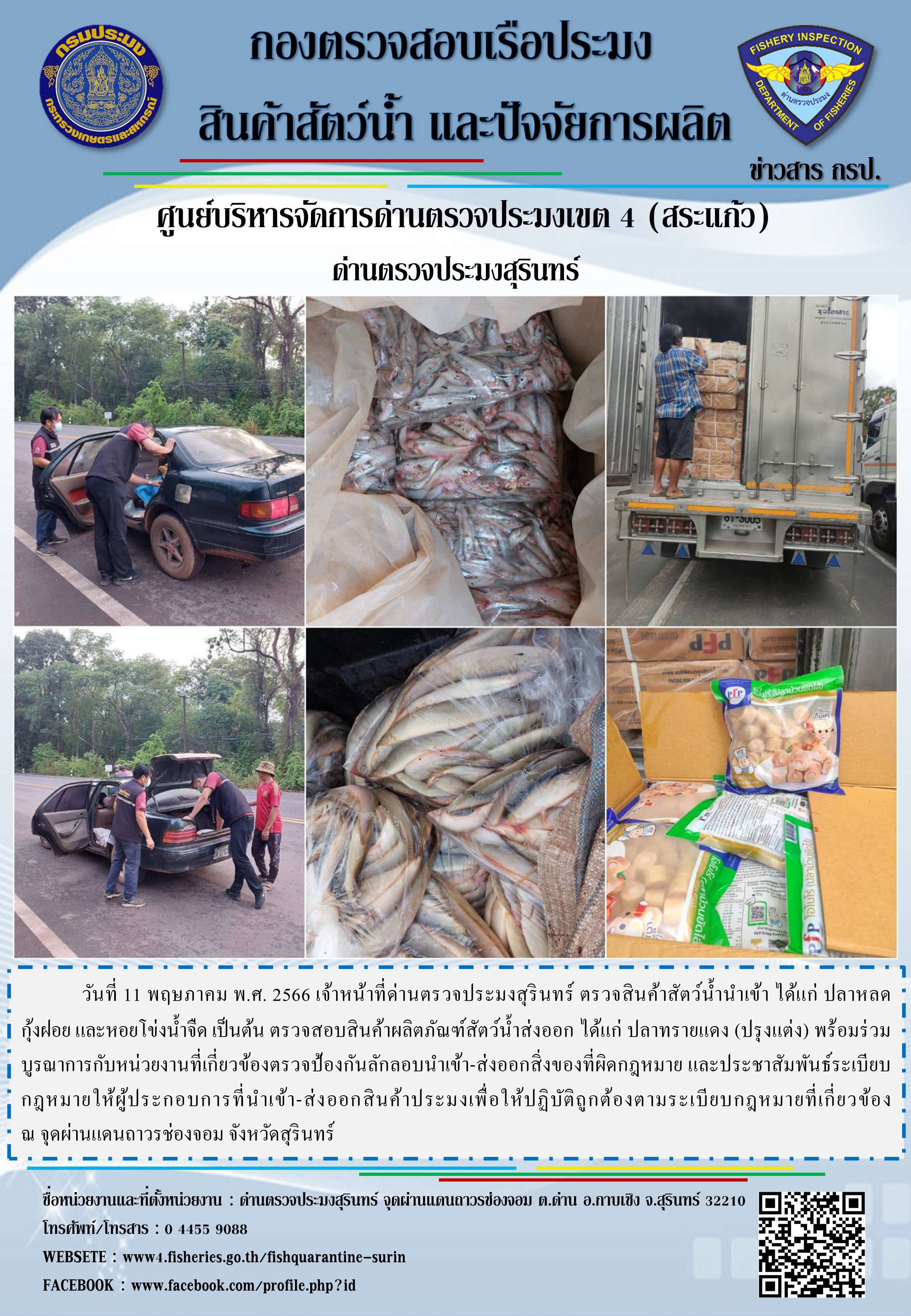 วันที่ 11 พฤษภาคม พ.ศ. 2566 เจ้าหน้าที่ด่านตรวจประมงสุรินทร์ ตรวจสินค้าสัตว์น้ำนำเข้า ได้แก่ ปลาหลด กุ้งฝอย และหอยโข่งน้ำจืด เป็นต้น ตรวจสอบสินค้าผลิตภัณฑ์สัตว์น้ำส่งออก ได้แก่ ปลาทรายแดง (ปรุงแต่ง) พร้อมร่วมบูรณาการกับหน่วยงานที่เกี่ยวข้องตรวจป้องกันลักลอบนำเข้า-ส่งออกสิ่งของที่ผิดกฎหมาย และประชาสัมพันธ์ระเบียบกฎหมายให้ผู้ประกอบการที่นำเข้า-ส่งออกสินค้าประมงเพื่อให้ปฏิบัติถูกต้องตามระเบียบกฎหมายที่เกี่ยวข้อง ณ จุดผ่านแดนถาวรช่องจอม จังหวัดสุรินทร์