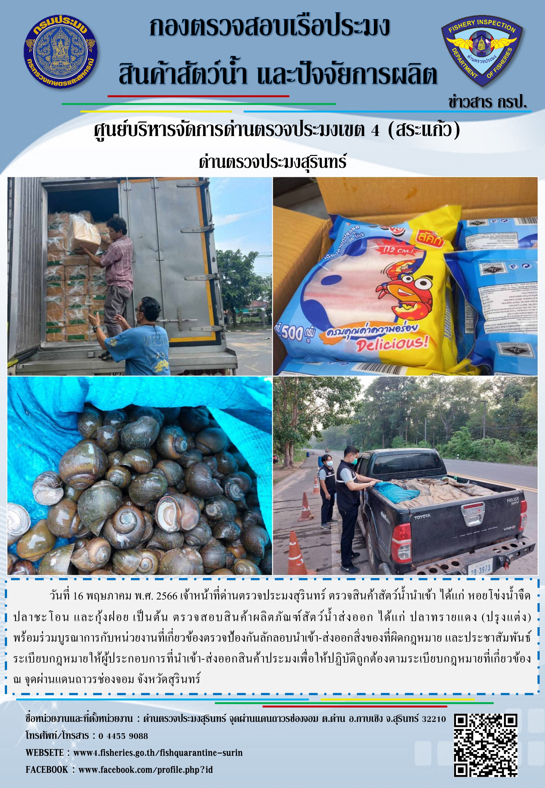 วันที่ 16 พฤษภาคม พ.ศ. 2566 เจ้าหน้าที่ด่านตรวจประมงสุรินทร์ ตรวจสินค้าสัตว์น้ำนำเข้า ได้แก่ หอยโข่งน้ำจืด ปลาชะโอน และกุ้งฝอย เป็นต้น ตรวจสอบสินค้าผลิตภัณฑ์สัตว์น้ำส่งออก ได้แก่ ปลาทรายแดง (ปรุงแต่ง) พร้อมร่วมบูรณาการกับหน่วยงานที่เกี่ยวข้องตรวจป้องกันลักลอบนำเข้า-ส่งออกสิ่งของที่ผิดกฎหมาย และประชาสัมพันธ์ระเบียบกฎหมายให้ผู้ประกอบการที่นำเข้า-ส่งออกสินค้าประมงเพื่อให้ปฏิบัติถูกต้องตามระเบียบกฎหมายที่เกี่ยวข้อง ณ จุดผ่านแดนถาวรช่องจอม จังหวัดสุรินทร์