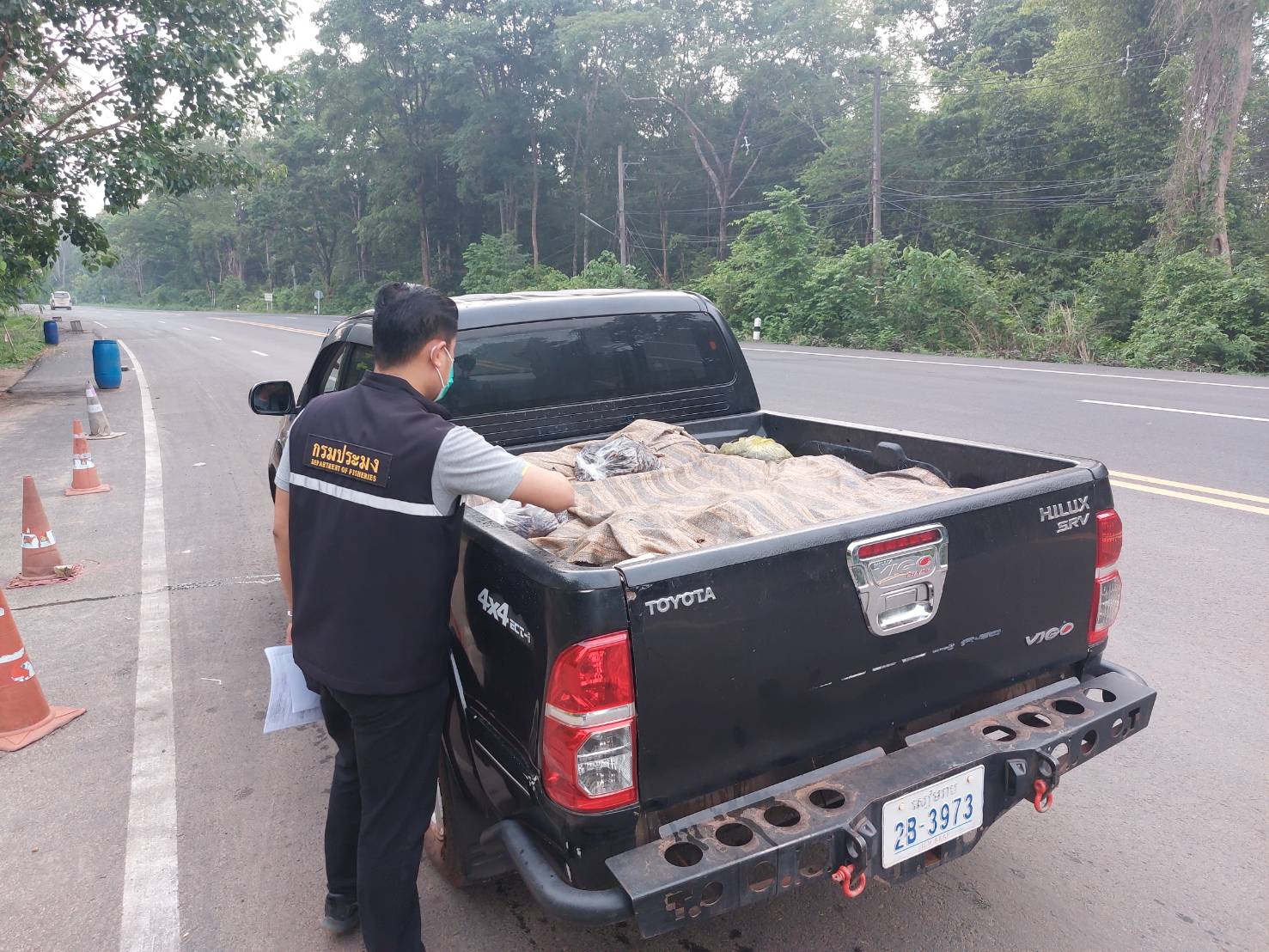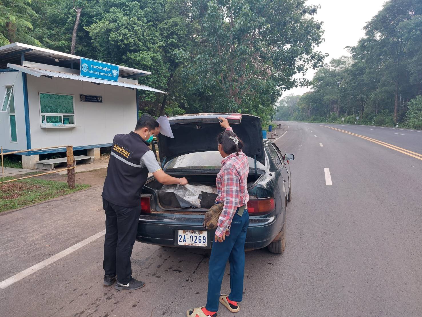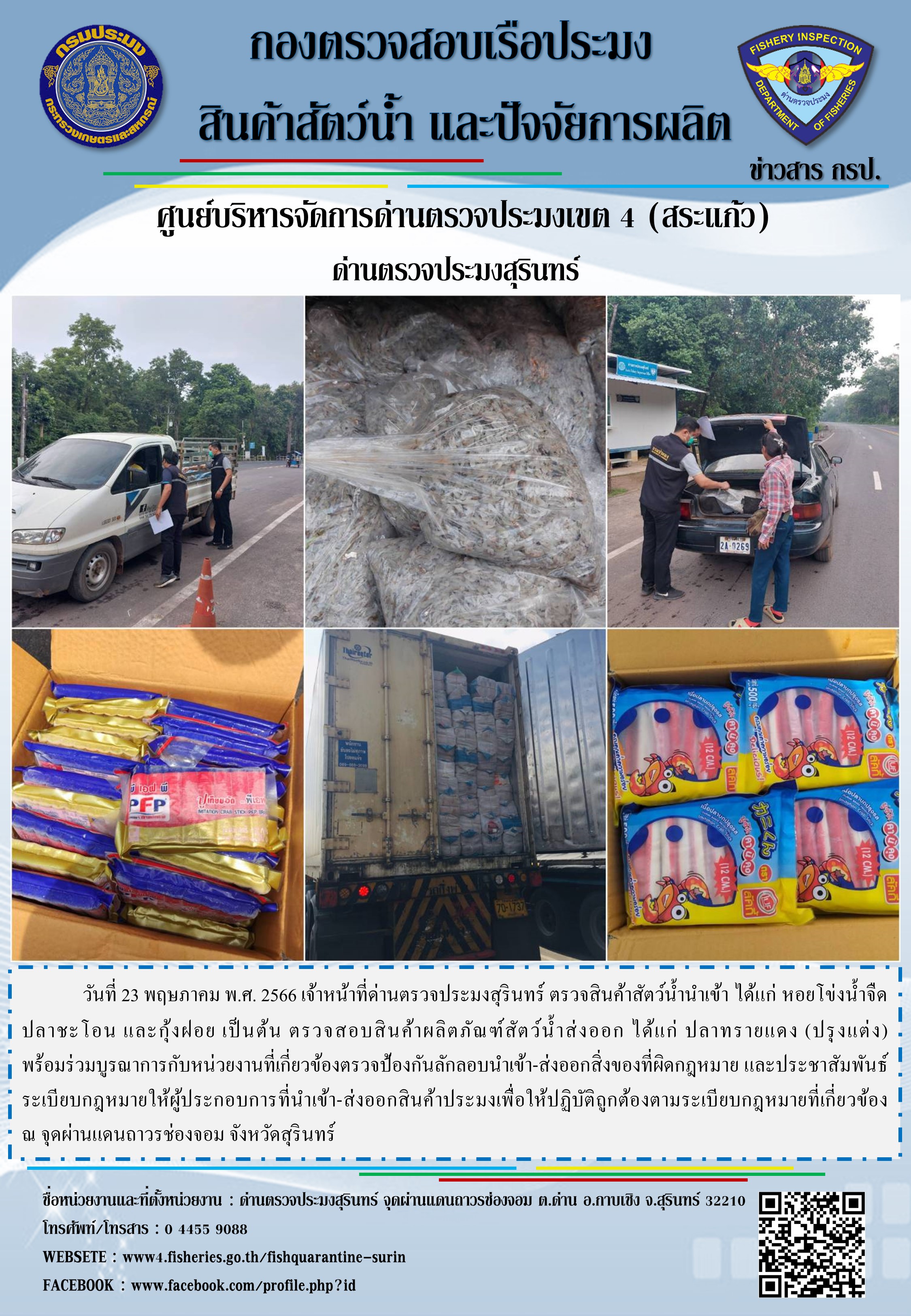วันที่ 23 พฤษภาคม พ.ศ. 2566 เจ้าหน้าที่ด่านตรวจประมงสุรินทร์ ตรวจสินค้าสัตว์น้ำนำเข้า ได้แก่ หอยโข่งน้ำจืด ปลาชะโอน และกุ้งฝอย เป็นต้น ตรวจสอบสินค้าผลิตภัณฑ์สัตว์น้ำส่งออก ได้แก่ ปลาทรายแดง (ปรุงแต่ง) พร้อมร่วมบูรณาการกับหน่วยงานที่เกี่ยวข้องตรวจป้องกันลักลอบนำเข้า-ส่งออกสิ่งของที่ผิดกฎหมาย และประชาสัมพันธ์ระเบียบกฎหมายให้ผู้ประกอบการที่นำเข้า-ส่งออกสินค้าประมงเพื่อให้ปฏิบัติถูกต้องตามระเบียบกฎหมายที่เกี่ยวข้อง ณ จุดผ่านแดนถาวรช่องจอม จังหวัดสุรินทร์