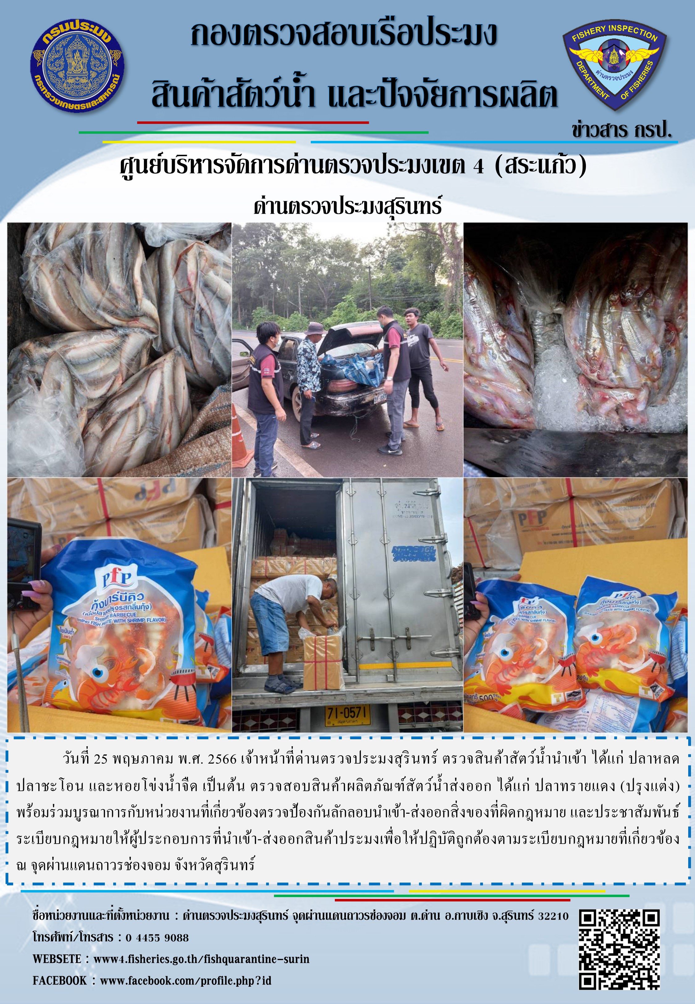 วันที่ 25 พฤษภาคม พ.ศ. 2566 เจ้าหน้าที่ด่านตรวจประมงสุรินทร์ ตรวจสินค้าสัตว์น้ำนำเข้า ได้แก่ ปลาหลด ปลาชะโอน และหอยโข่งน้ำจืด เป็นต้น ตรวจสอบสินค้าผลิตภัณฑ์สัตว์น้ำส่งออก ได้แก่ ปลาทรายแดง (ปรุงแต่ง) พร้อมร่วมบูรณาการกับหน่วยงานที่เกี่ยวข้องตรวจป้องกันลักลอบนำเข้า-ส่งออกสิ่งของที่ผิดกฎหมาย และประชาสัมพันธ์ระเบียบกฎหมายให้ผู้ประกอบการที่นำเข้า-ส่งออกสินค้าประมงเพื่อให้ปฏิบัติถูกต้องตามระเบียบกฎหมายที่เกี่ยวข้อง ณ จุดผ่านแดนถาวรช่องจอม จังหวัดสุรินทร์