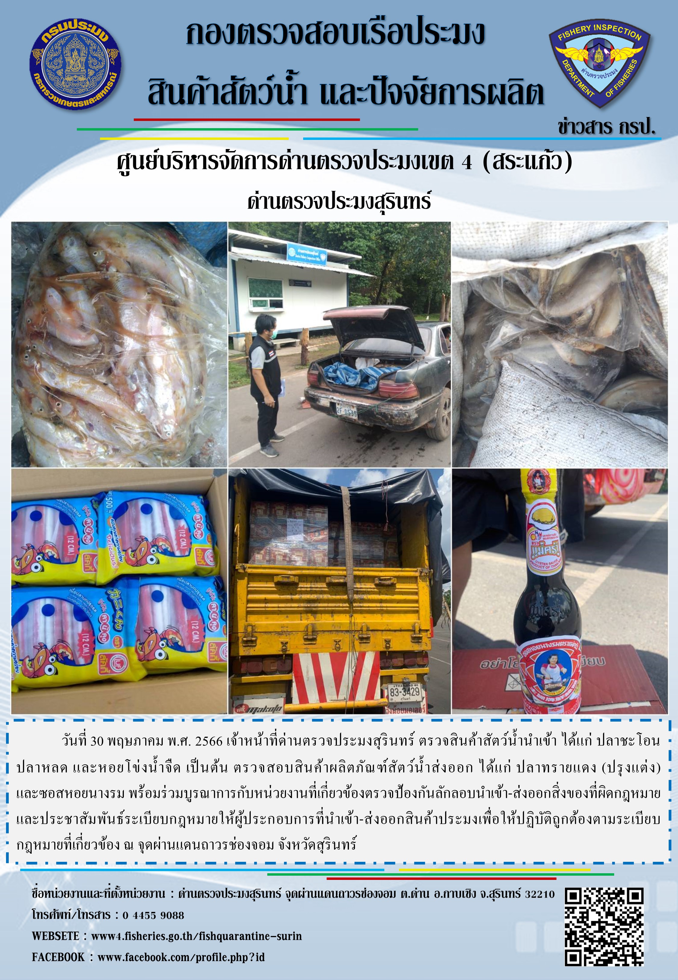 วันที่ 30 พฤษภาคม พ.ศ. 2566 เจ้าหน้าที่ด่านตรวจประมงสุรินทร์ ตรวจสินค้าสัตว์น้ำนำเข้า ได้แก่ ปลาชะโอน ปลาหลด และหอยโข่งน้ำจืด เป็นต้น ตรวจสอบสินค้าผลิตภัณฑ์สัตว์น้ำส่งออก ได้แก่ ปลาทรายแดง (ปรุงแต่ง) และซอสหอยนางรม พร้อมร่วมบูรณาการกับหน่วยงานที่เกี่ยวข้องตรวจป้องกันลักลอบนำเข้า-ส่งออกสิ่งของที่ผิดกฎหมาย และประชาสัมพันธ์ระเบียบกฎหมายให้ผู้ประกอบการที่นำเข้า-ส่งออกสินค้าประมงเพื่อให้ปฏิบัติถูกต้องตามระเบียบกฎหมายที่เกี่ยวข้อง ณ จุดผ่านแดนถาวรช่องจอม จังหวัดสุรินทร์