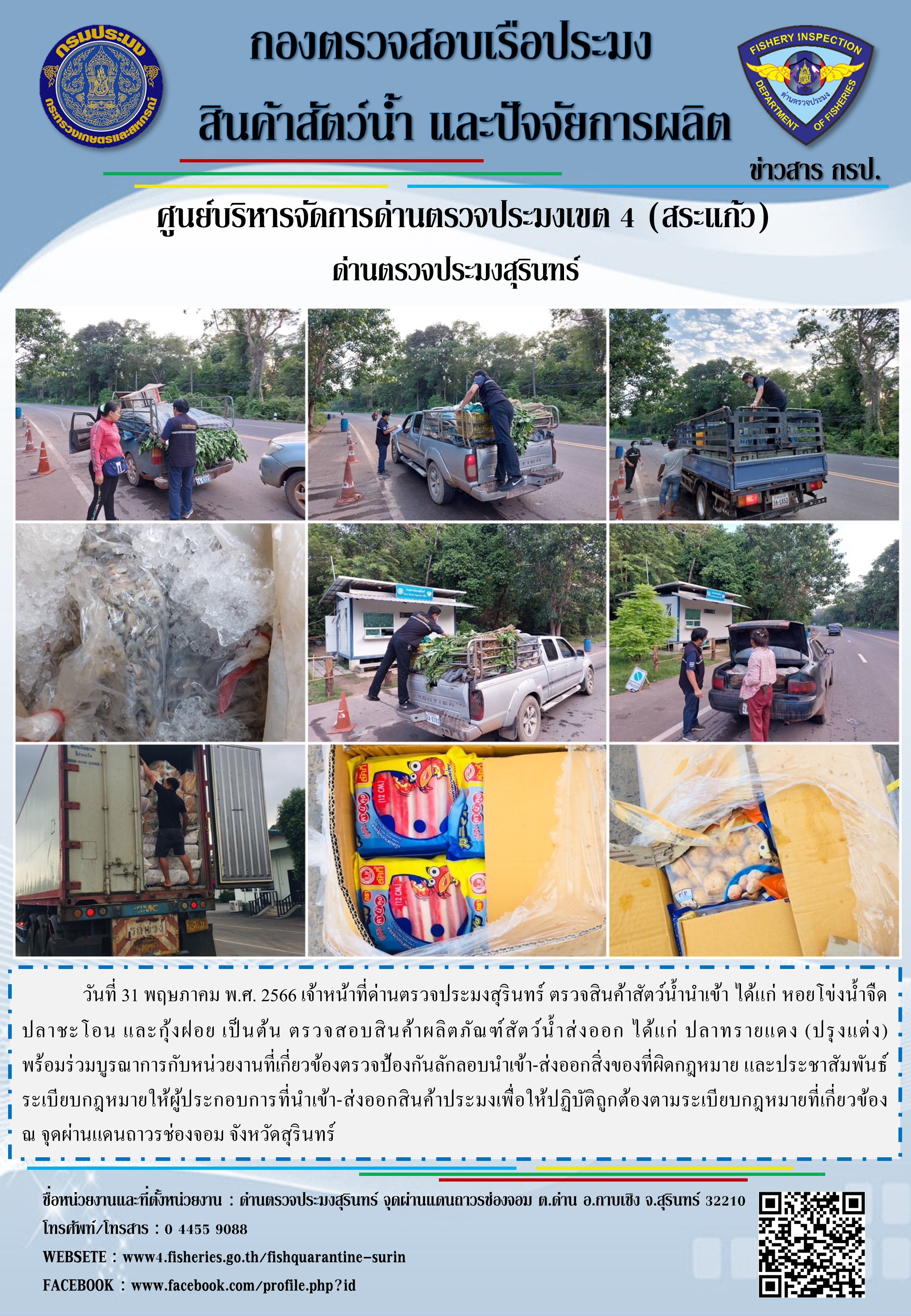 วันที่ 31 พฤษภาคม พ.ศ. 2566 เจ้าหน้าที่ด่านตรวจประมงสุรินทร์ ตรวจสินค้าสัตว์น้ำนำเข้า ได้แก่ หอยโข่งน้ำจืด ปลาชะโอน และกุ้งฝอย เป็นต้น ตรวจสอบสินค้าผลิตภัณฑ์สัตว์น้ำส่งออก ได้แก่ ปลาทรายแดง (ปรุงแต่ง) พร้อมร่วมบูรณาการกับหน่วยงานที่เกี่ยวข้องตรวจป้องกันลักลอบนำเข้า-ส่งออกสิ่งของที่ผิดกฎหมาย และประชาสัมพันธ์ระเบียบกฎหมายให้ผู้ประกอบการที่นำเข้า-ส่งออกสินค้าประมงเพื่อให้ปฏิบัติถูกต้องตามระเบียบกฎหมายที่เกี่ยวข้อง ณ จุดผ่านแดนถาวรช่องจอม จังหวัดสุรินทร์