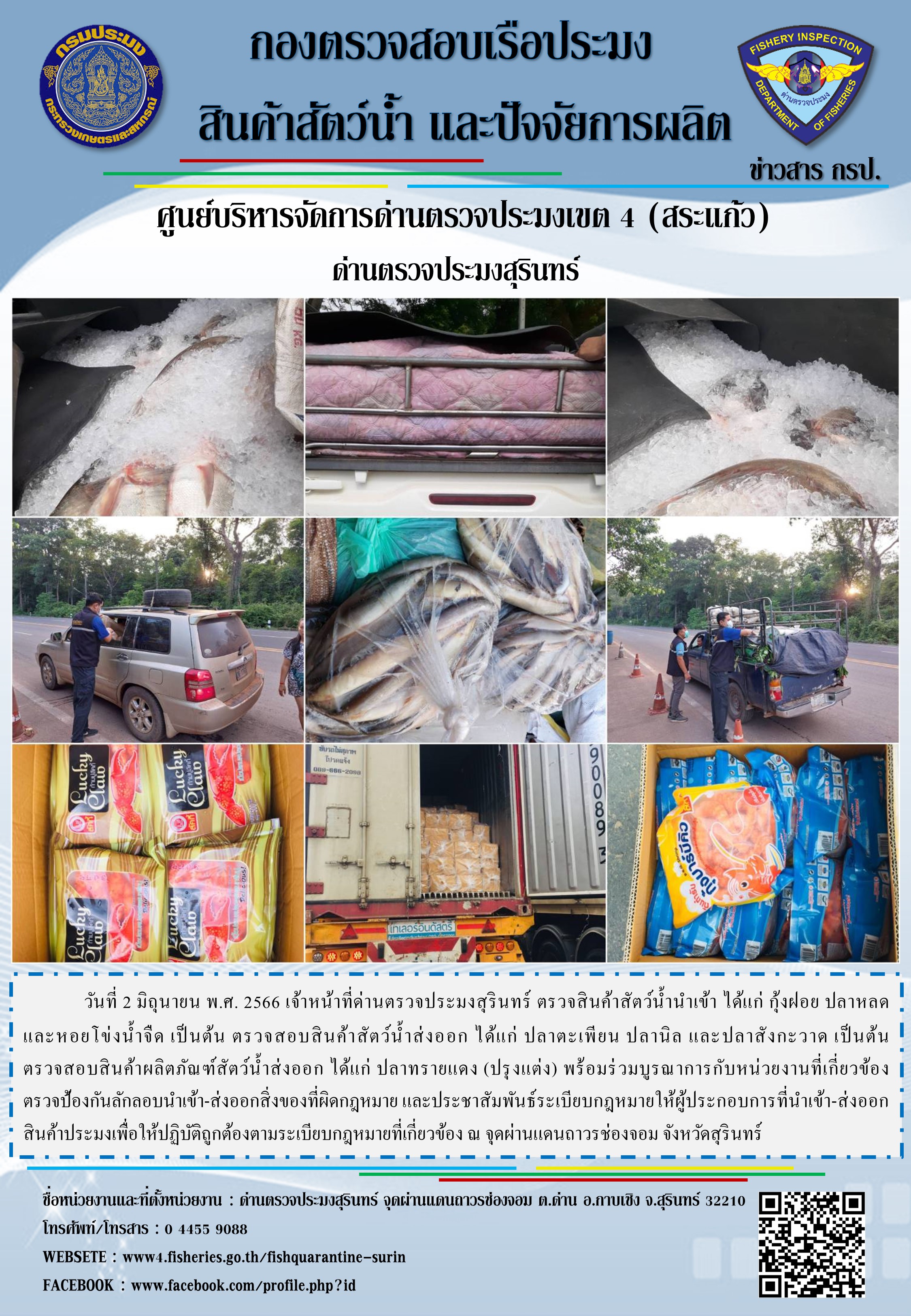 วันที่ 2 มิถุนายน พ.ศ. 2566 เจ้าหน้าที่ด่านตรวจประมงสุรินทร์ ตรวจสินค้าสัตว์น้ำนำเข้า ได้แก่ กุ้งฝอย ปลาหลด และหอยโข่งน้ำจืด เป็นต้น ตรวจสอบสินค้าสัตว์น้ำส่งออก ได้แก่ ปลาตะเพียน ปลานิล และปลาสังกะวาด เป็นต้น ตรวจสอบสินค้าผลิตภัณฑ์สัตว์น้ำส่งออก ได้แก่ ปลาทรายแดง (ปรุงแต่ง) พร้อมร่วมบูรณาการกับหน่วยงานที่เกี่ยวข้องตรวจป้องกันลักลอบนำเข้า-ส่งออกสิ่งของที่ผิดกฎหมาย และประชาสัมพันธ์ระเบียบกฎหมายให้ผู้ประกอบการที่นำเข้า-ส่งออกสินค้าประมงเพื่อให้ปฏิบัติถูกต้องตามระเบียบกฎหมายที่เกี่ยวข้อง ณ จุดผ่านแดนถาวรช่องจอม จังหวัดสุรินทร์