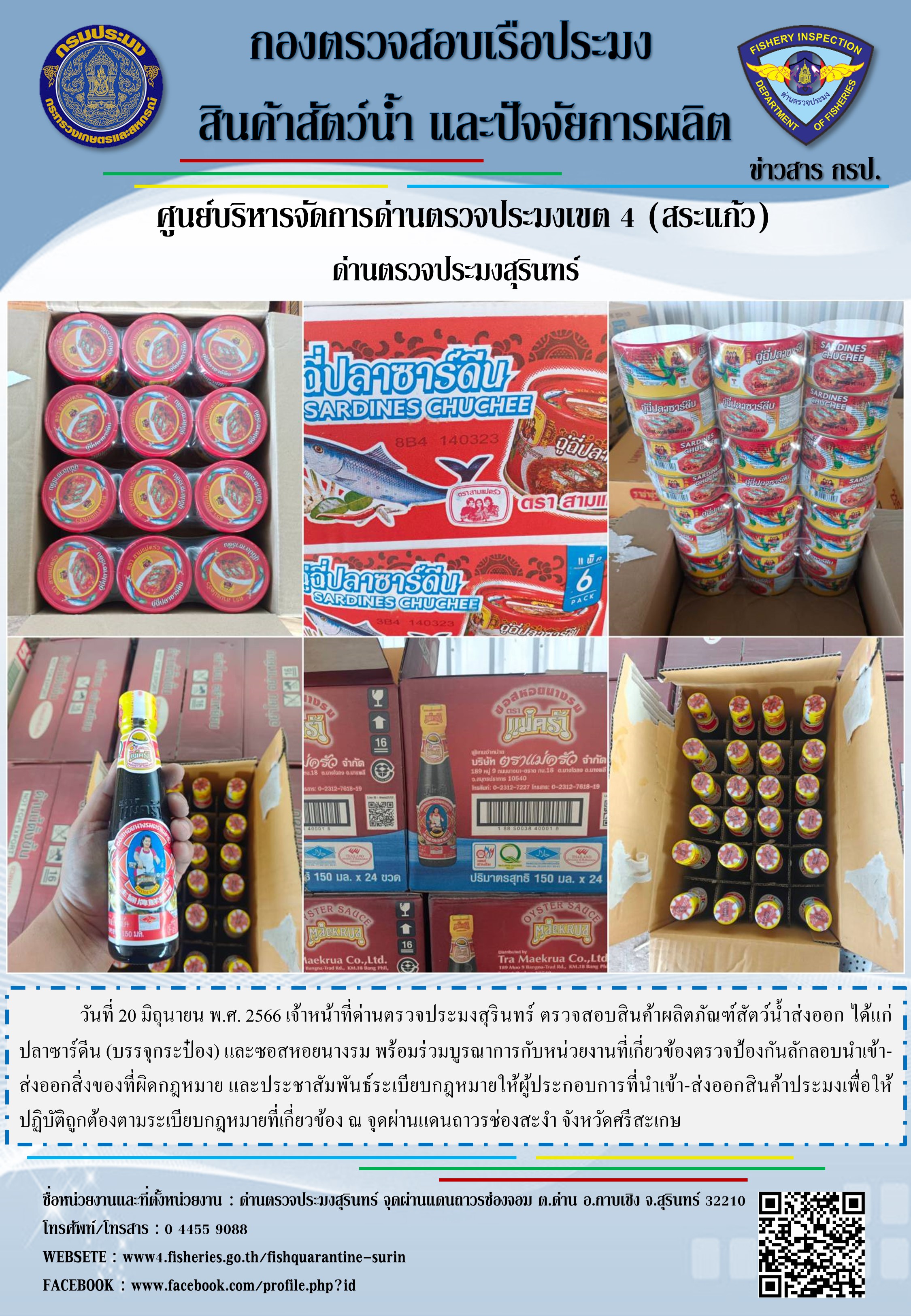 วันที่ 20 มิถุนายน พ.ศ. 2566 เจ้าหน้าที่ด่านตรวจประมงสุรินทร์ ตรวจสอบสินค้าผลิตภัณฑ์สัตว์น้ำส่งออก ได้แก่ ปลาซาร์ดีน (บรรจุกระป๋อง) และซอสหอยนางรม พร้อมร่วมบูรณาการกับหน่วยงานที่เกี่ยวข้องตรวจป้องกันลักลอบนำเข้า-ส่งออกสิ่งของที่ผิดกฎหมาย และประชาสัมพันธ์ระเบียบกฎหมายให้ผู้ประกอบการที่นำเข้า-ส่งออกสินค้าประมงเพื่อให้ปฏิบัติถูกต้องตามระเบียบกฎหมายที่เกี่ยวข้อง ณ จุดผ่านแดนถาวรช่องสะงำ จังหวัดศรีสะเกษ