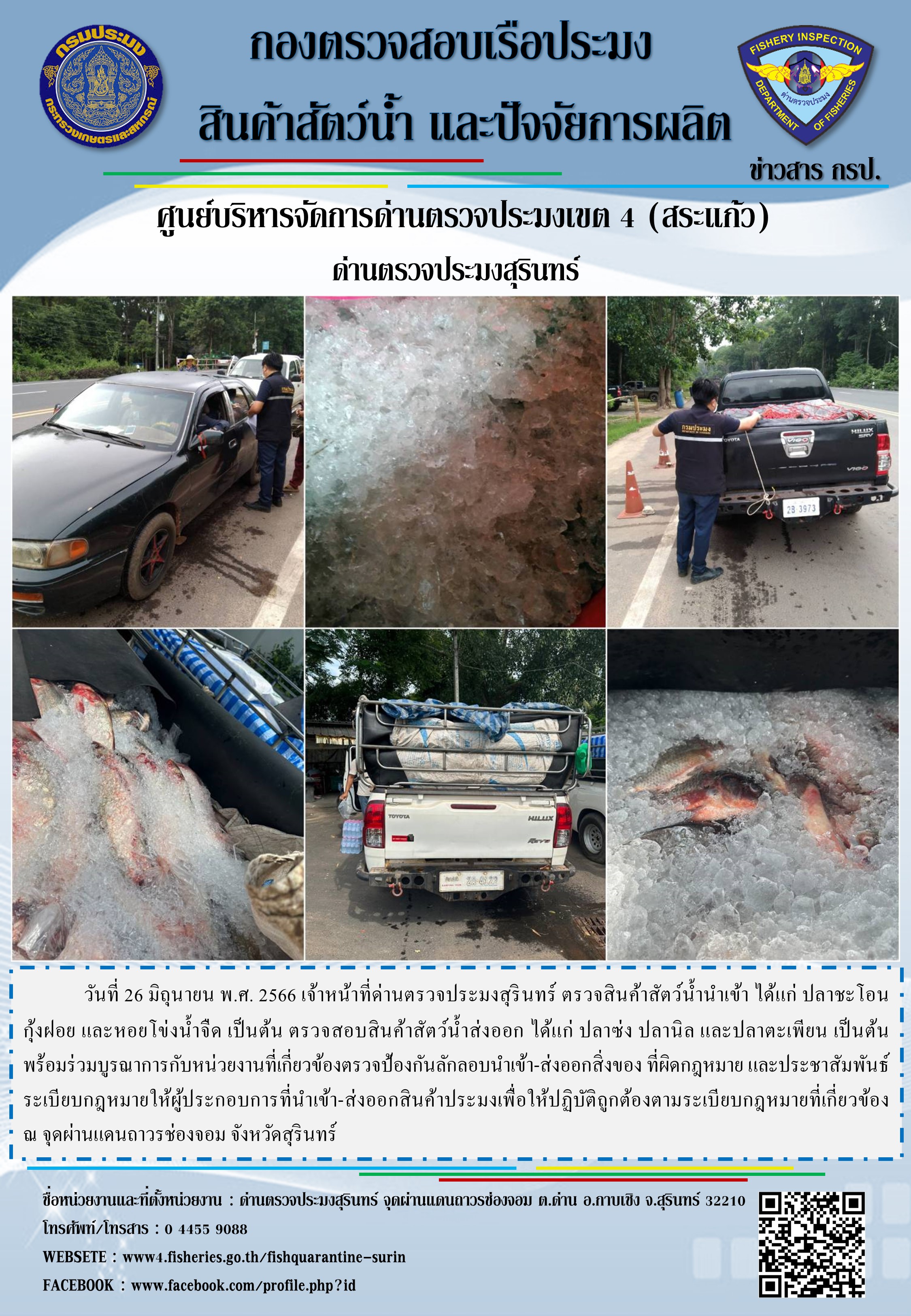 วันที่ 26 มิถุนายน พ.ศ. 2566 เจ้าหน้าที่ด่านตรวจประมงสุรินทร์ ตรวจสินค้าสัตว์น้ำนำเข้า ได้แก่ ปลาชะโอน กุ้งฝอย และหอยโข่งน้ำจืด เป็นต้น ตรวจสอบสินค้าสัตว์น้ำส่งออก ได้แก่ ปลาซ่ง ปลานิล และปลาตะเพียน เป็นต้น พร้อมร่วมบูรณาการกับหน่วยงานที่เกี่ยวข้องตรวจป้องกันลักลอบนำเข้า-ส่งออกสิ่งของ ที่ผิดกฎหมาย และประชาสัมพันธ์ระเบียบกฎหมายให้ผู้ประกอบการที่นำเข้า-ส่งออกสินค้าประมงเพื่อให้ปฏิบัติถูกต้องตามระเบียบกฎหมายที่เกี่ยวข้อง ณ จุดผ่านแดนถาวรช่องจอม จังหวัดสุรินทร์
