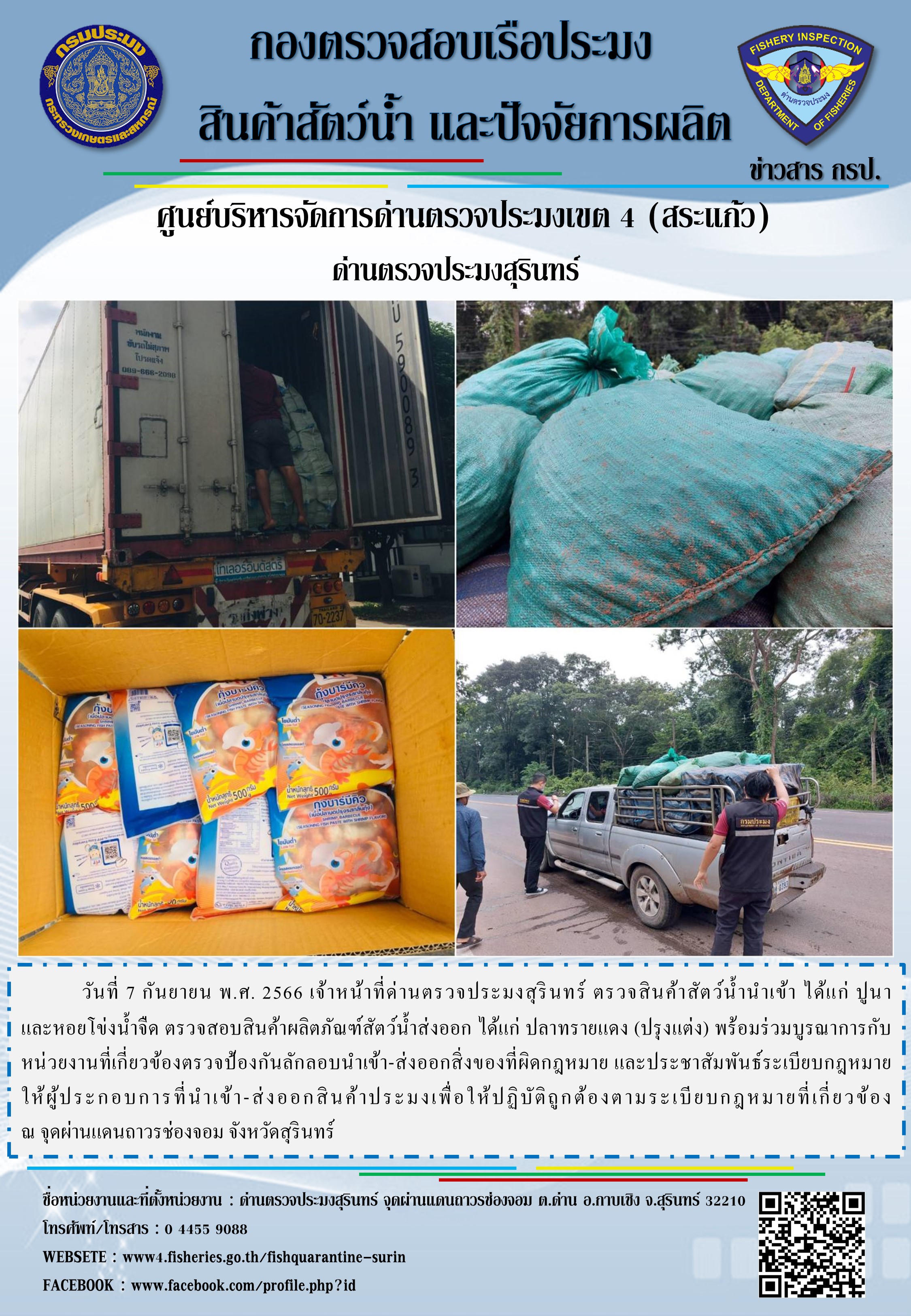 วันที่ 7 กันยายน พ.ศ. 2566 เจ้าหน้าที่ด่านตรวจประมงสุรินทร์ ตรวจสินค้าสัตว์น้ำนำเข้า ได้แก่ ปูนา และหอยโข่งน้ำจืด ตรวจสอบสินค้าผลิตภัณฑ์สัตว์น้ำส่งออก ได้แก่ ปลาทรายแดง (ปรุงแต่ง) พร้อมร่วมบูรณาการกับหน่วยงานที่เกี่ยวข้องตรวจป้องกันลักลอบนำเข้า-ส่งออกสิ่งของที่ผิดกฎหมาย และประชาสัมพันธ์ระเบียบกฎหมาย ให้ผู้ประกอบการที่นำเข้า-ส่งออกสินค้าประมงเพื่อให้ปฏิบัติถูกต้องตามระเบียบกฎหมายที่เกี่ยวข้อง ณ จุดผ่านแดนถาวรช่องจอม จังหวัดสุรินทร์