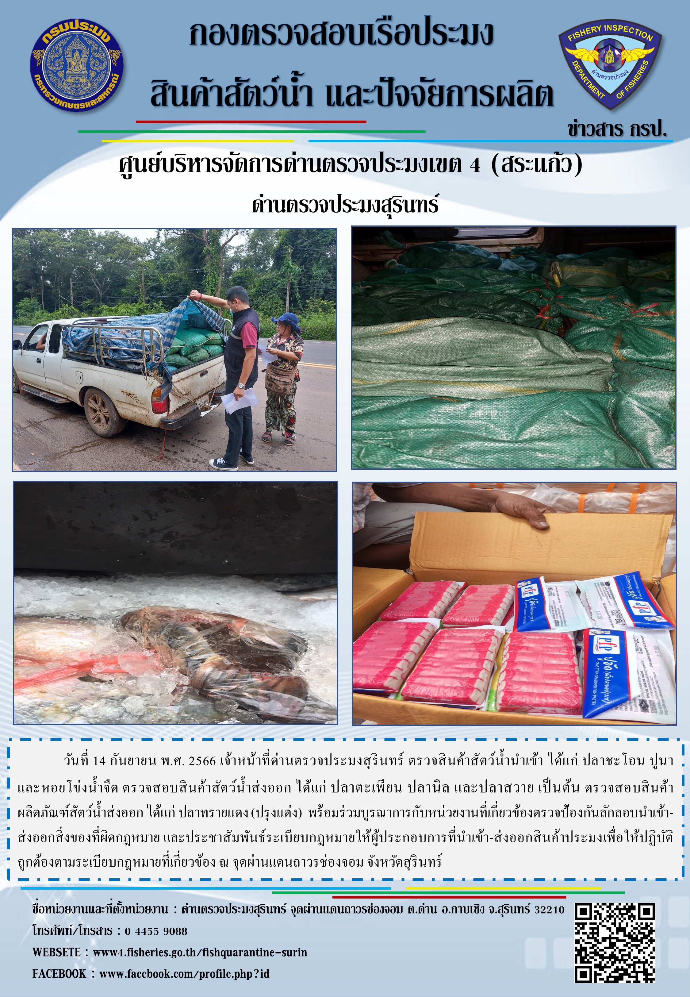 วันที่ 14 กันยายน พ.ศ. 2566 เจ้าหน้าที่ด่านตรวจประมงสุรินทร์ ตรวจสินค้าสัตว์น้ำนำเข้า ได้แก่ ปลาชะโอน ปูนา และหอยโข่งน้ำจืด ตรวจสอบสินค้าสัตว์น้ำส่งออก ได้แก่ ปลาตะเพียน ปลานิล และปลาสวาย เป็นต้น ตรวจสอบสินค้าผลิตภัณฑ์สัตว์น้ำส่งออก ได้แก่ ปลาทรายแดง (ปรุงแต่ง) พร้อมร่วมบูรณาการกับหน่วยงานที่เกี่ยวข้องตรวจป้องกันลักลอบนำเข้า-ส่งออกสิ่งของที่ผิดกฎหมาย และประชาสัมพันธ์ระเบียบกฎหมายให้ผู้ประกอบการที่นำเข้า-ส่งออกสินค้าประมงเพื่อให้ปฏิบัติถูกต้องตามระเบียบกฎหมายที่เกี่ยวข้อง ณ จุดผ่านแดนถาวรช่องจอม จังหวัดสุรินทร์