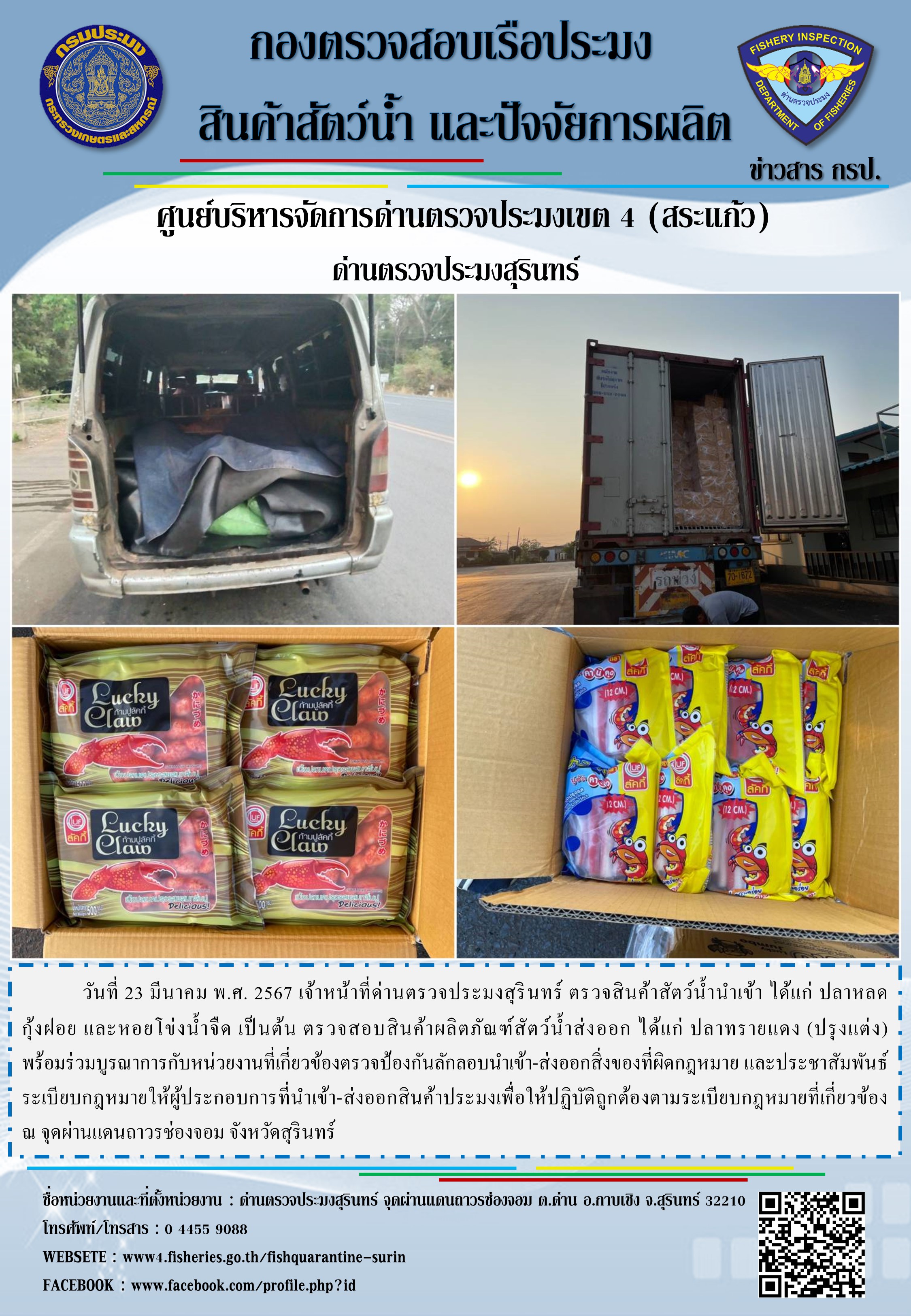 วันที่ 23 มีนาคม พ.ศ. 2567 เจ้าหน้าที่ด่านตรวจประมงสุรินทร์ ตรวจสินค้าสัตว์น้ำนำเข้า ได้แก่ ปลาหลด กุ้งฝอย และหอยโข่งน้ำจืด เป็นต้น ตรวจสอบสินค้าผลิตภัณฑ์สัตว์น้ำส่งออก ได้แก่ ปลาทรายแดง (ปรุงแต่ง) พร้อมร่วมบูรณาการกับหน่วยงานที่เกี่ยวข้องตรวจป้องกันลักลอบนำเข้า-ส่งออกสิ่งของที่ผิดกฎหมาย และประชาสัมพันธ์ระเบียบกฎหมายให้ผู้ประกอบการที่นำเข้า-ส่งออกสินค้าประมงเพื่อให้ปฏิบัติถูกต้องตามระเบียบกฎหมายที่เกี่ยวข้อง ณ จุดผ่านแดนถาวรช่องจอม จังหวัดสุรินทร์
