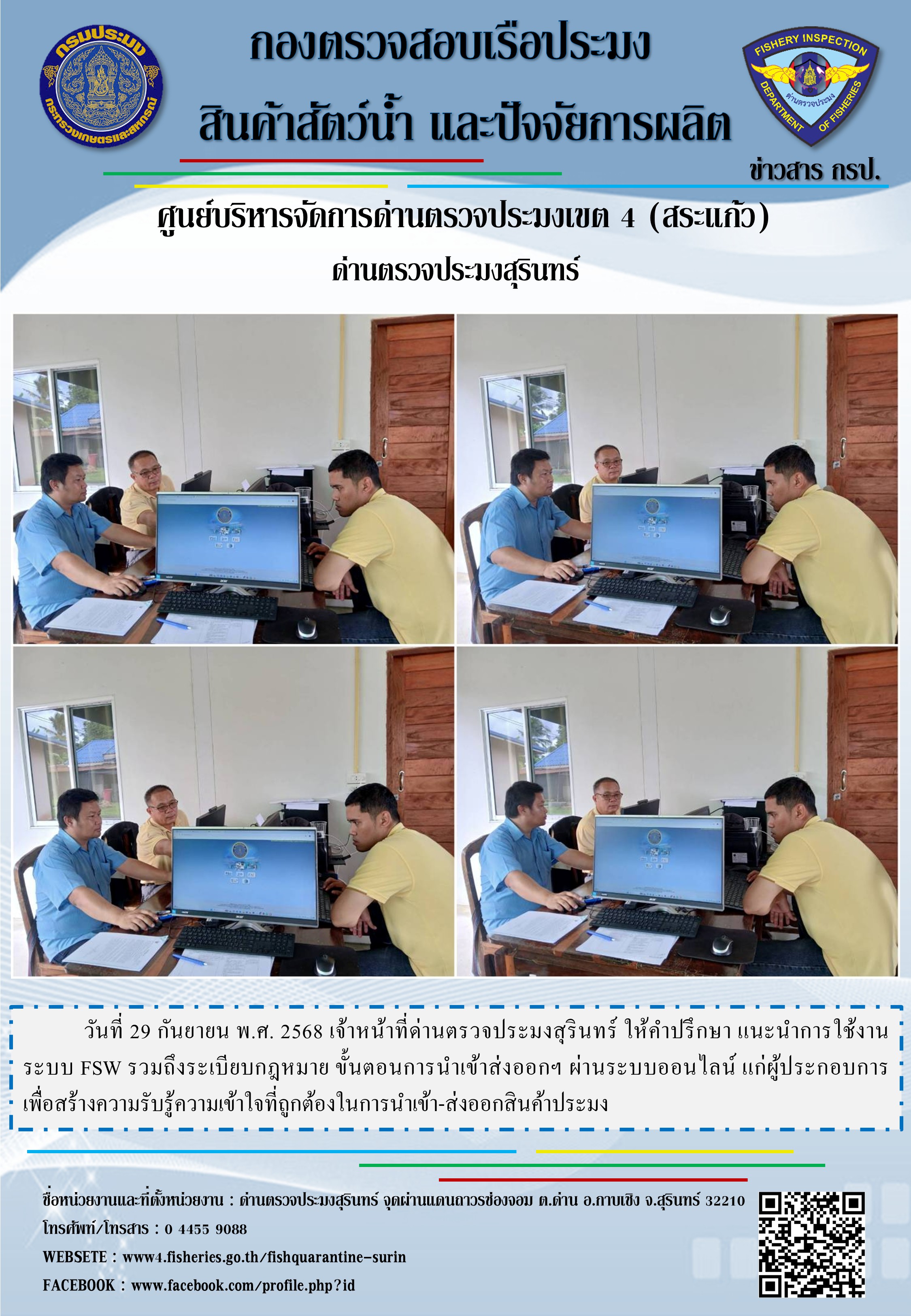 วันที่ 29 กันยายน พ.ศ. 2568 เจ้าหน้าที่ด่านตรวจประมงสุรินทร์ ให้คำปรึกษา แนะนำการใช้งานระบบ FSW รวมถึงระเบียบกฎหมาย ขั้นตอนการนำเข้าส่งออกฯ ผ่านระบบออนไลน์ แก่ผู้ประกอบการ เพื่อสร้างความรับรู้ความเข้าใจที่ถูกต้องในการนำเข้า-ส่งออกสินค้าประมง
