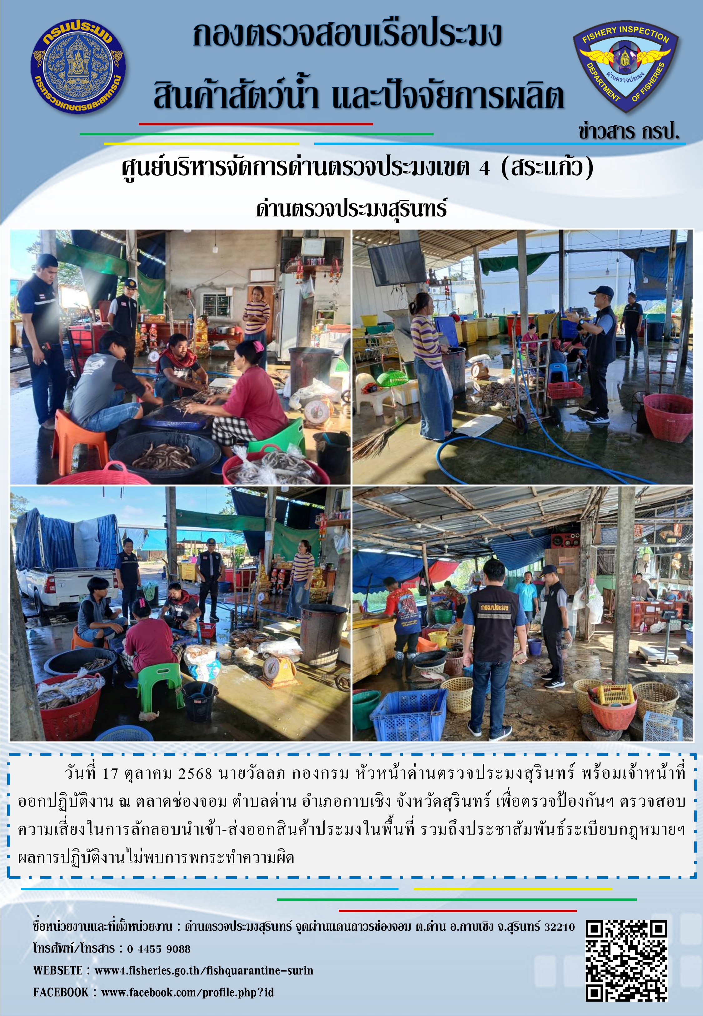 วันที่ 17 ตุลาคม 2568 นายวัลลภ กองกรม หัวหน้าด่านตรวจประมงสุรินทร์ พร้อมเจ้าหน้าที่ออกปฏิบัติงาน ณ ตลาดช่องจอม ตำบลด่าน อำเภอกาบเชิง จังหวัดสุรินทร์ เพื่อตรวจป้องกันฯ ตรวจสอบความเสี่ยงในการลักลอบนำเข้า-ส่งออกสินค้าประมงในพื้นที่ รวมถึงประชาสัมพันธ์ระเบียบกฎหมายฯ ผลการปฏิบัติงานไม่พบการพกระทำความผิด