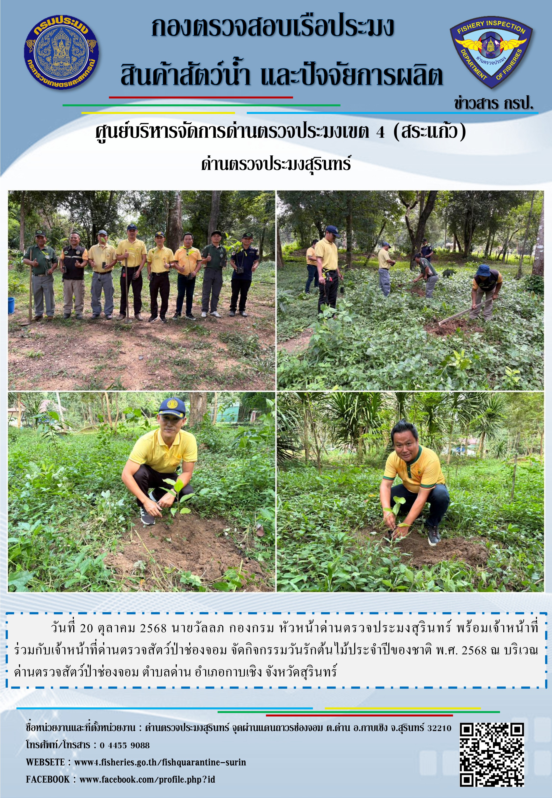 วันที่ 20 ตุลาคม 2568 นายวัลลภ กองกรม หัวหน้าด่านตรวจประมงสุรินทร์ พร้อมเจ้าหน้าที่ ร่วมกับเจ้าหน้าที่ด่านตรวจสัตว์ป่าช่องจอม จัดกิจกรรมวันรักต้นไม้ประจำปีของชาติ พ.ศ. 2568 ณ บริเวณด่านตรวจสัตว์ป่าช่องจอม ตำบลด่าน อำเภอกาบเชิง จังหวัดสุรินทร์