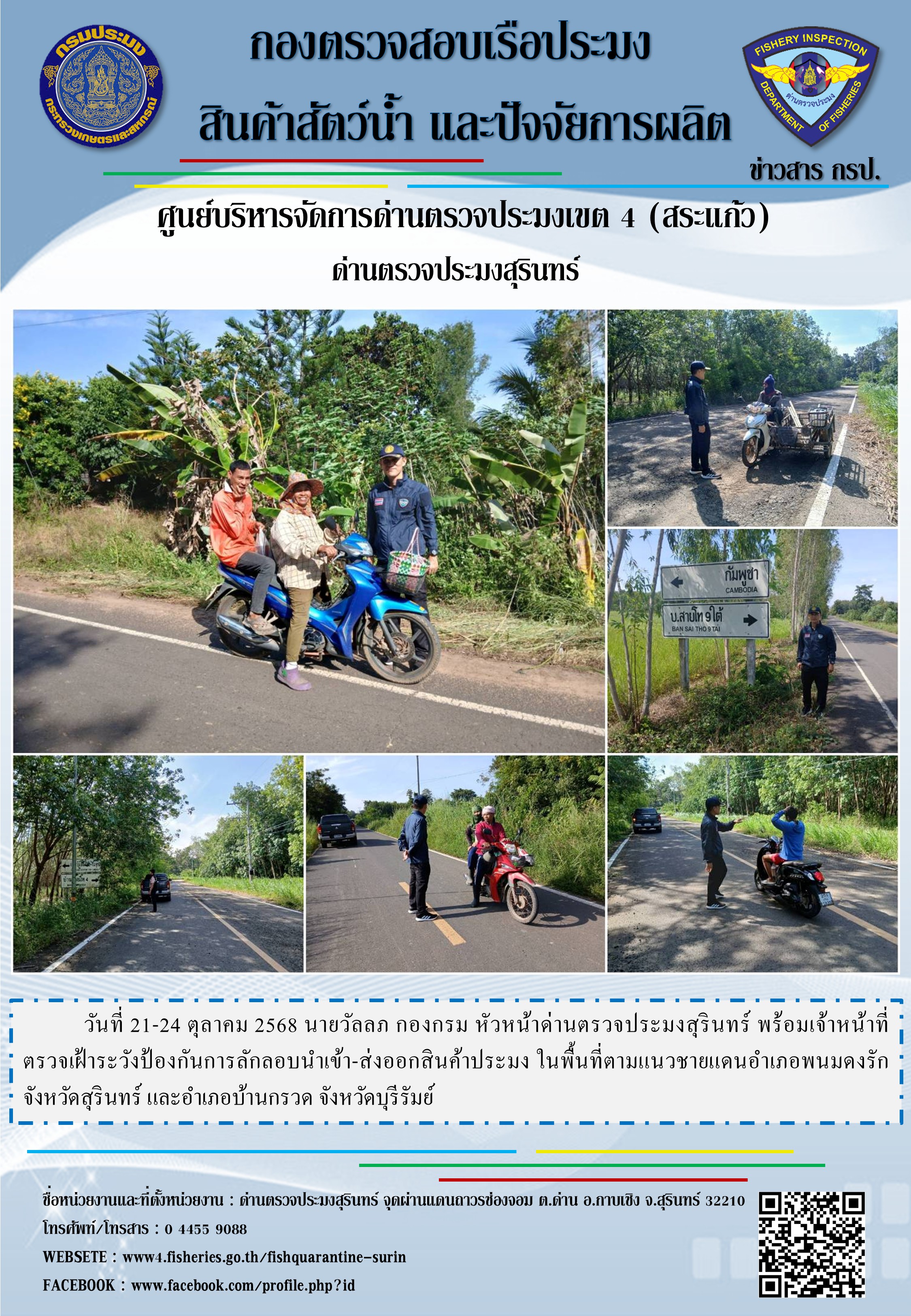 วันที่ 21-24 ตุลาคม 2568 นายวัลลภ กองกรม หัวหน้าด่านตรวจประมงสุรินทร์ พร้อมเจ้าหน้าที่ ตรวจเฝ้าระวังป้องกันการลักลอบนำเข้า-ส่งออกสินค้าประมง ในพื้นที่ตามแนวชายแดนอำเภอพนมดงรัก จังหวัดสุรินทร์ และอำเภอบ้านกรวด จังหวัดบุรีรัมย์