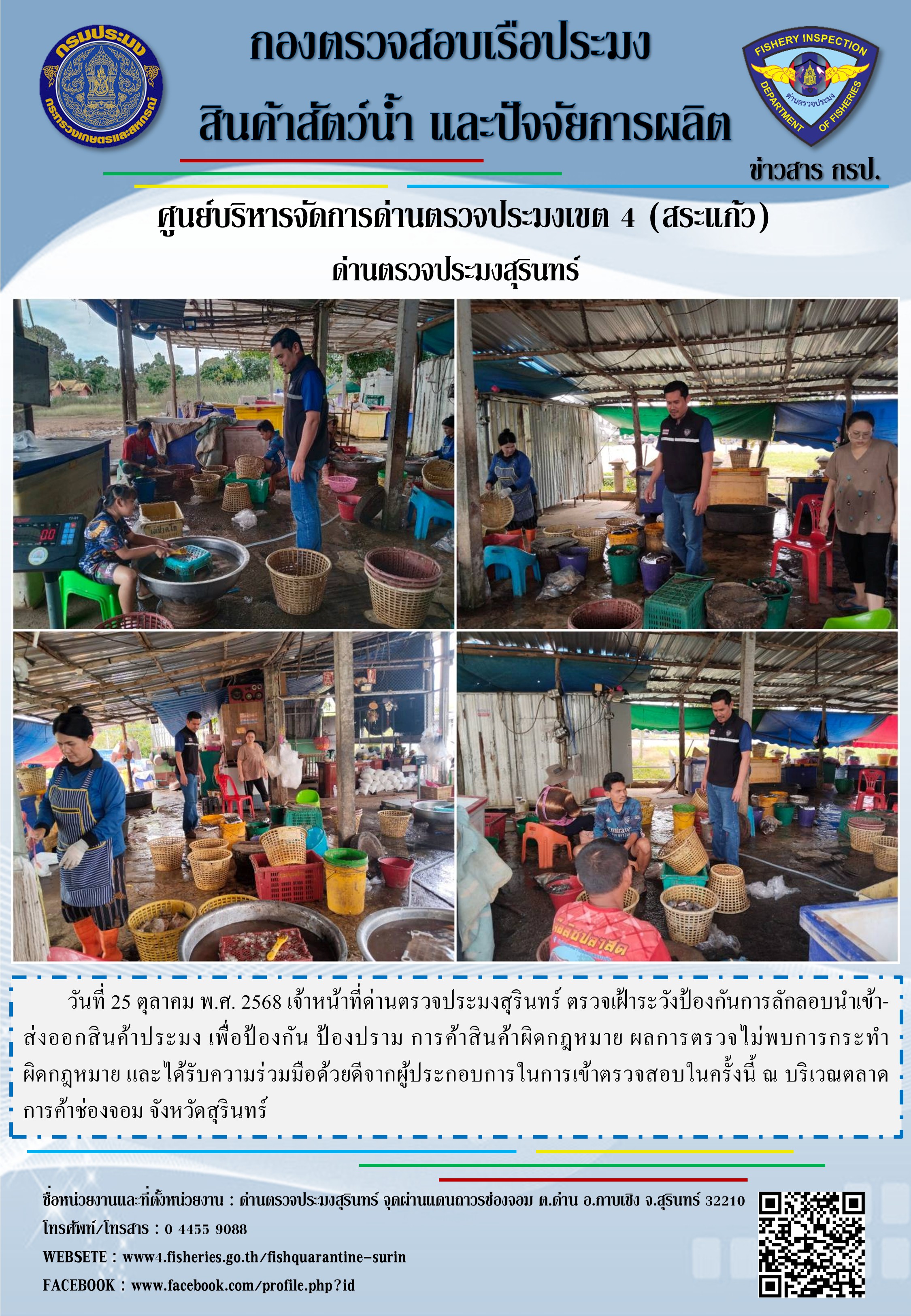 วันที่ 25 ตุลาคม พ.ศ. 2568 เจ้าหน้าที่ด่านตรวจประมงสุรินทร์ ตรวจเฝ้าระวังป้องกันการลักลอบนำเข้า-ส่งออกสินค้าประมง เพื่อป้องกัน ป้องปราม การค้าสินค้าผิดกฎหมาย ผลการตรวจไม่พบการกระทำผิดกฎหมาย และได้รับความร่วมมือด้วยดีจากผู้ประกอบการในการเข้าตรวจสอบในครั้งนี้ ณ บริเวณตลาดการค้าช่องจอม จังหวัดสุรินทร์