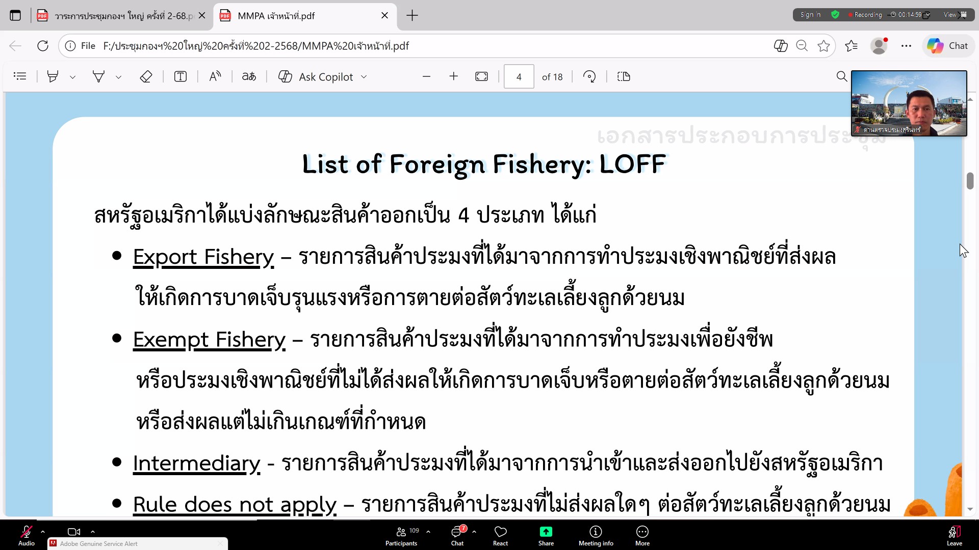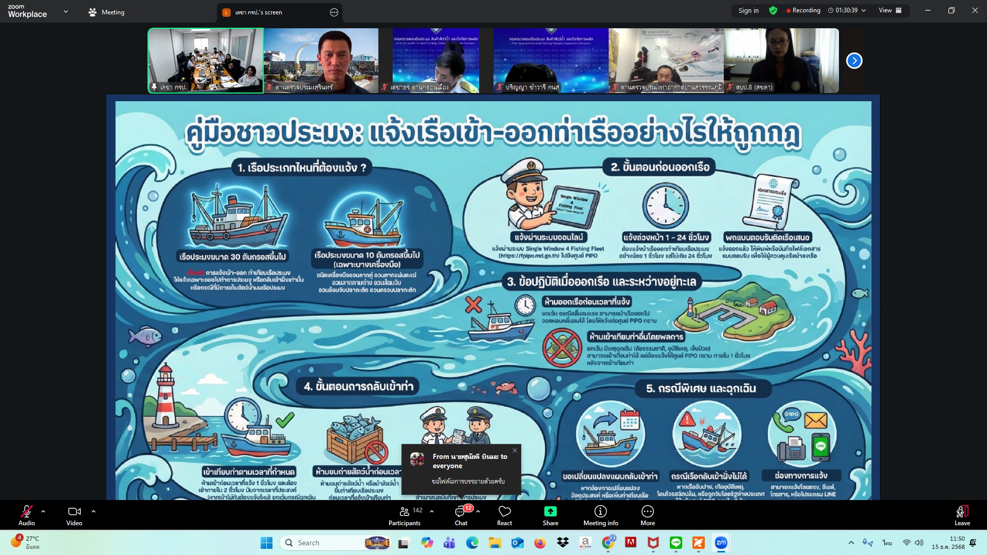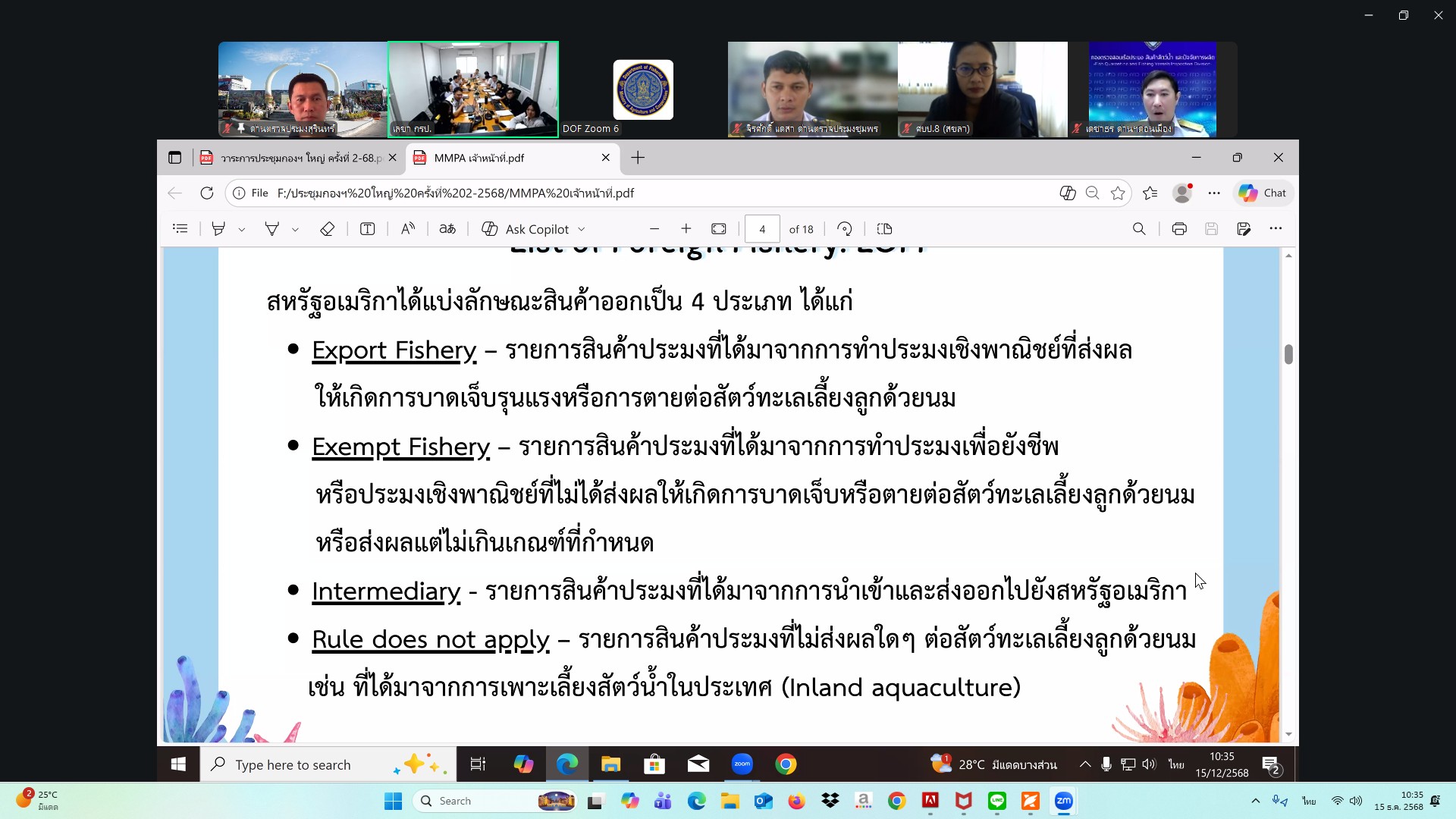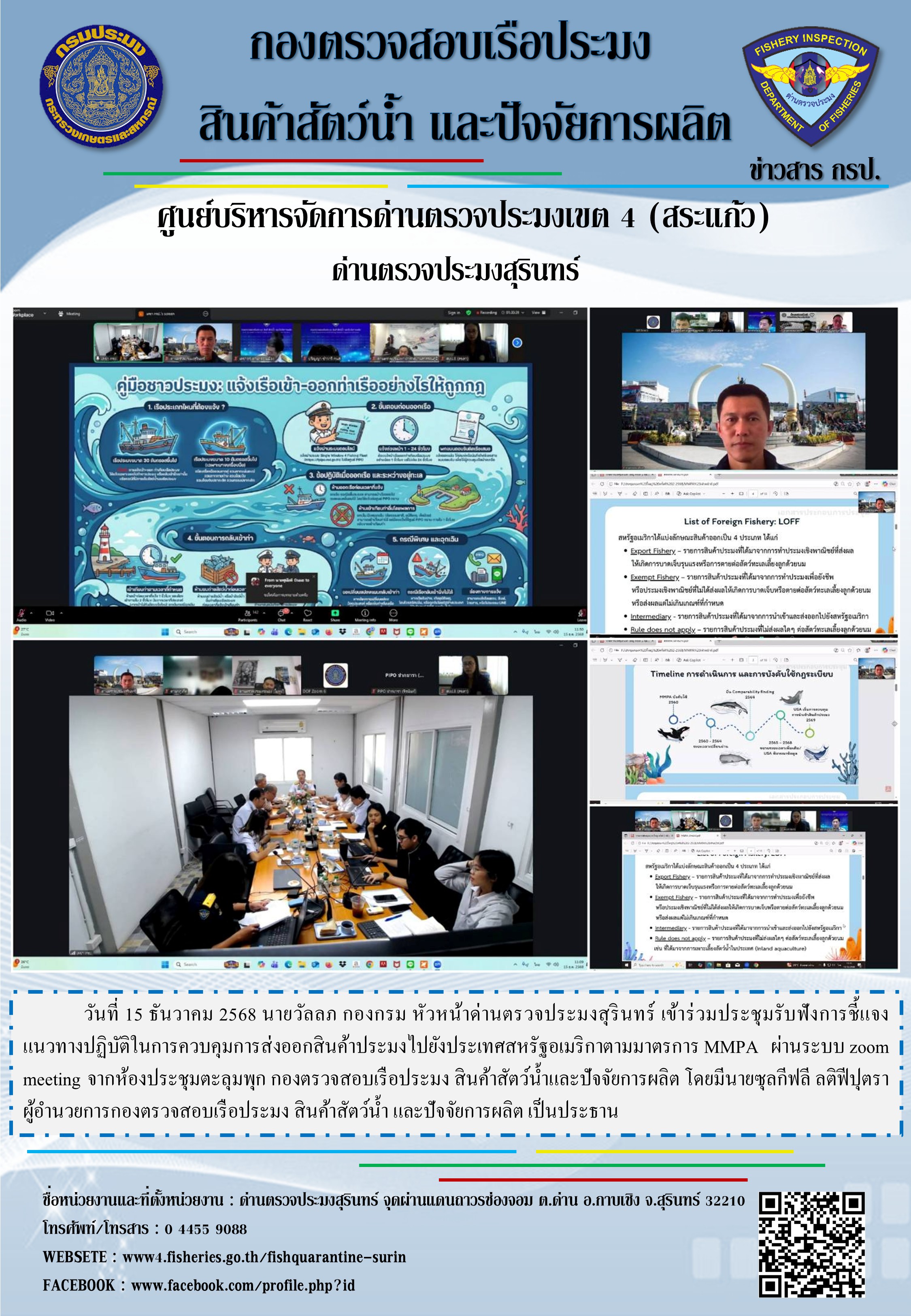 วันที่ 15 ธันวาคม 2568 นายวัลลภ กองกรม หัวหน้าด่านตรวจประมงสุรินทร์ เข้าร่วมประชุมรับฟังการชี้แจงแนวทางปฏิบัติในการควบคุมการส่งออกสินค้าประมงไปยังประเทศสหรัฐอเมริกาตามมาตรการ MMPA ผ่านระบบ zoom meeting จากห้องประชุมตะลุมพุก กองตรวจสอบเรือประมง สินค้าสัตว์น้ำและปัจจัยการผลิต โดยมีนายซุลกีฟลี ลติฟีปุตรา ผู้อำนวยการกองตรวจสอบเรือประมง สินค้าสัตว์น้ำ และปัจจัยการผลิต เป็นประธาน