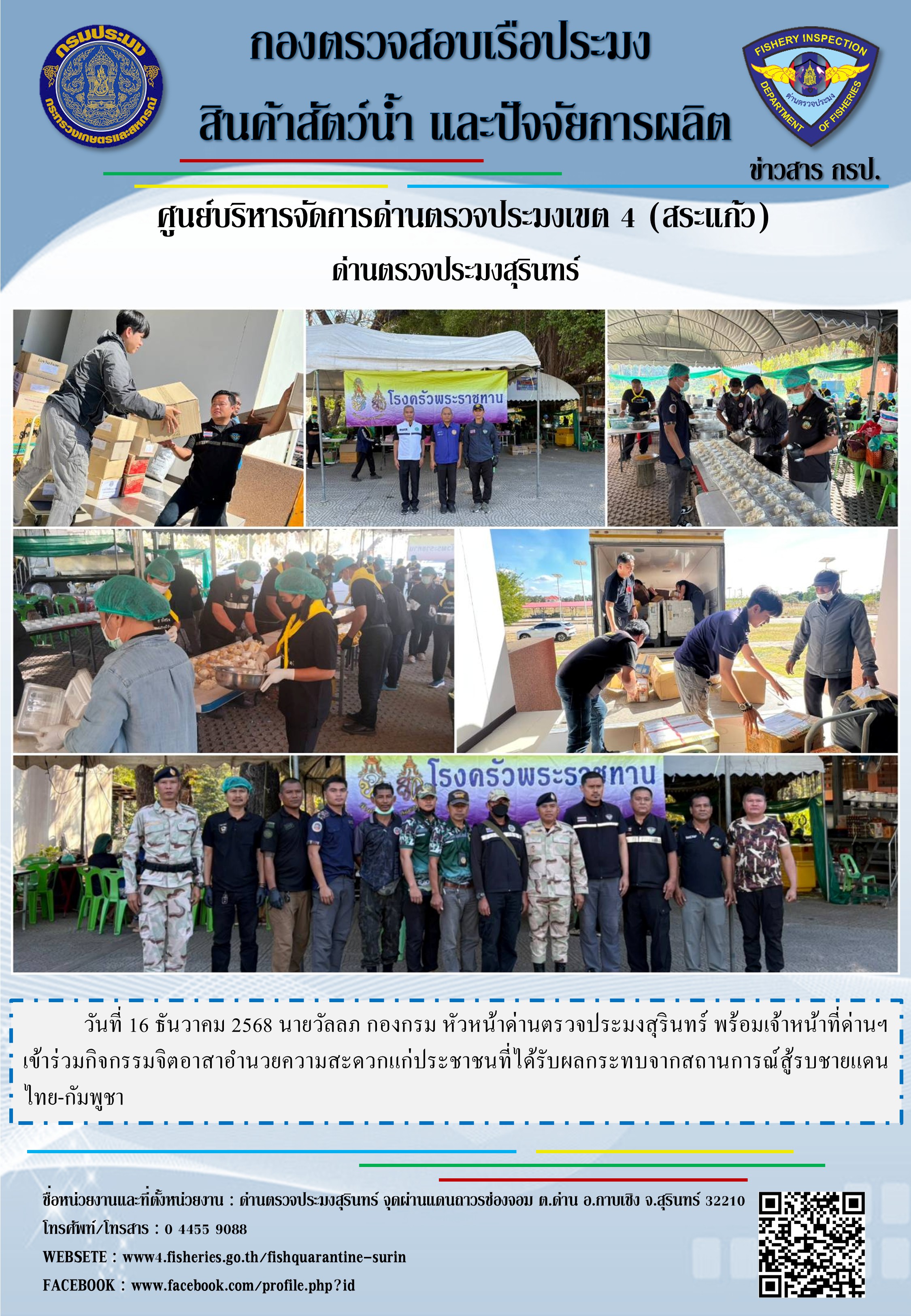 วันที่ 16 ธันวาคม 2568 นายวัลลภ กองกรม หัวหน้าด่านตรวจประมงสุรินทร์ พร้อมเจ้าหน้าที่ด่านฯ เข้าร่วมกิจกรรมจิตอาสาอำนวยความสะดวกแก่ประชาชนที่ได้รับผลกระทบจากสถานการณ์สู้รบชายแดนไทย-กัมพูชา