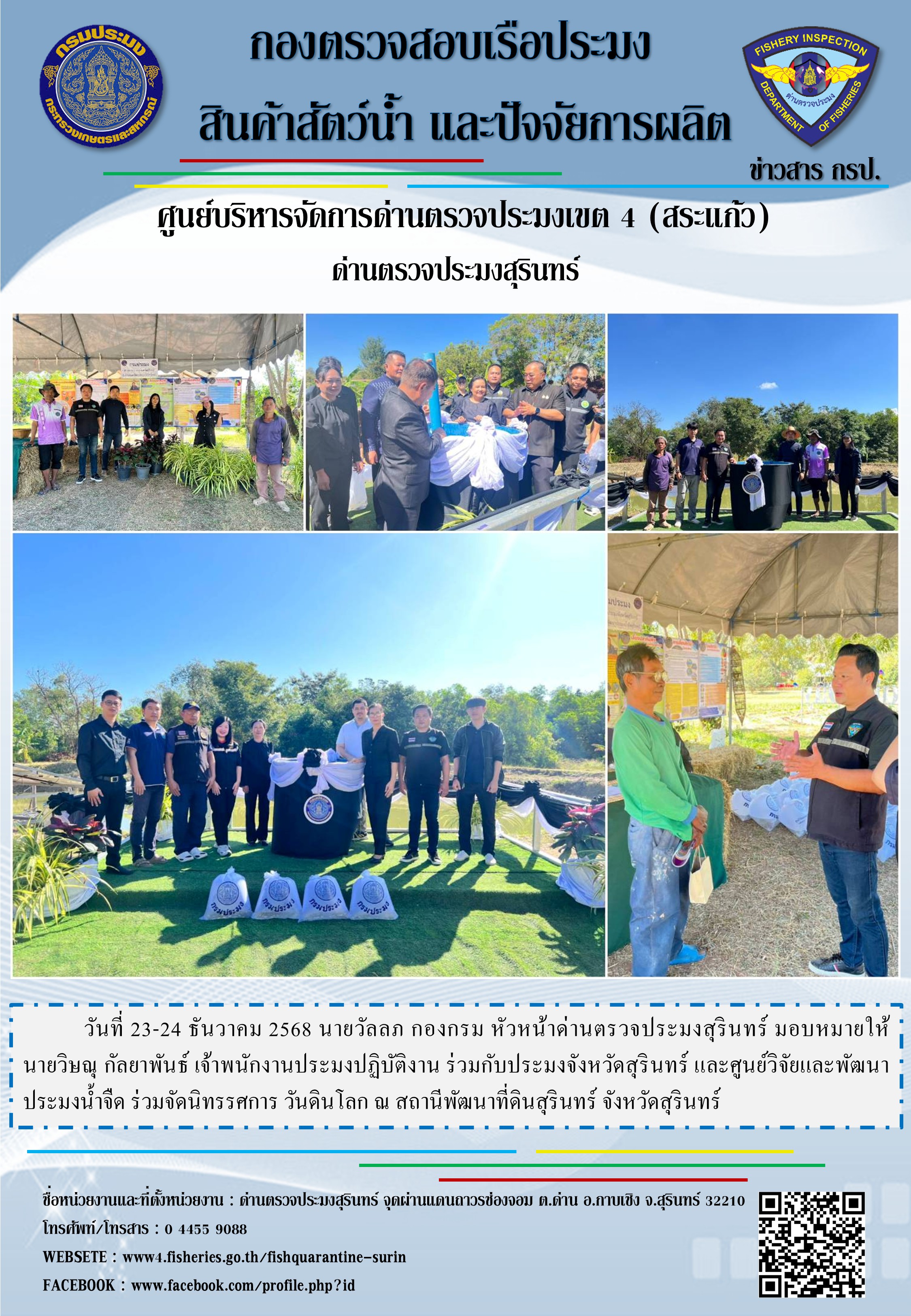 วันที่ 23-24 ธันวาคม 2568 นายวัลลภ กองกรม หัวหน้าด่านตรวจประมงสุรินทร์ มอบหมายให้ นายวิษณุ กัลยาพันธ์ เจ้าพนักงานประมงปฏิบัติงาน ร่วมกับประมงจังหวัดสุรินทร์ และศูนย์วิจัยและพัฒนาประมงน้ำจืด ร่วมจัดนิทรรศการ วันดินโลก ณ สถานีพัฒนาที่ดินสุรินทร์ จังหวัดสุรินทร์