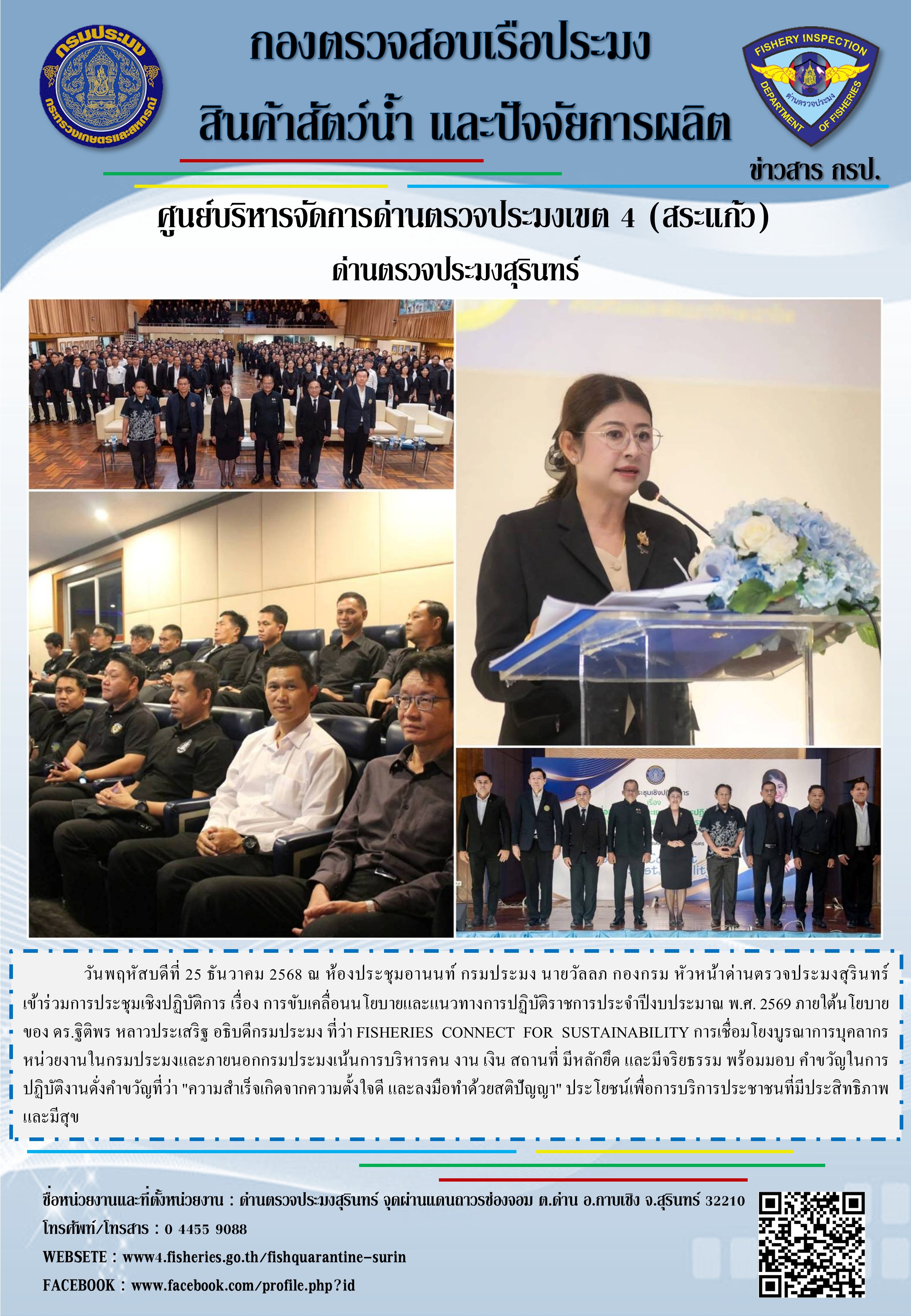 วันพฤหัสบดีที่ 25 ธันวาคม 2568 ณ ห้องประชุมอานนท์ กรมประมง นายวัลลภ กองกรม หัวหน้าด่านตรวจประมงสุรินทร์ เข้าร่วมการประชุมเชิงปฏิบัติการ เรื่อง การขับเคลื่อนนโยบายและแนวทางการปฏิบัติราชการประจำปีงบประมาณ พ.ศ. 2569 ภายใต้นโยบายของ ดร.ฐิติพร หลาวประเสริฐ อธิบดีกรมประมง ที่ว่า FISHERIES CONNECT FOR SUSTAINABILITY การเชื่อมโยงบูรณาการบุคลากรหน่วยงานในกรมประมงและภายนอกกรมประมงเน้นการบริหารคน งาน เงิน สถานที่ มีหลักยึด และมีจริยธรรม พร้อมมอบ คำขวัญในการปฏิบัติงานดั่งคำขวัญที่ว่า "ความสำเร็จเกิดจากความตั้งใจดี และลงมือทำด้วยสติปัญญา" ประโยชน์เพื่อการบริการประชาชนที่มีประสิทธิภาพและมีสุข
