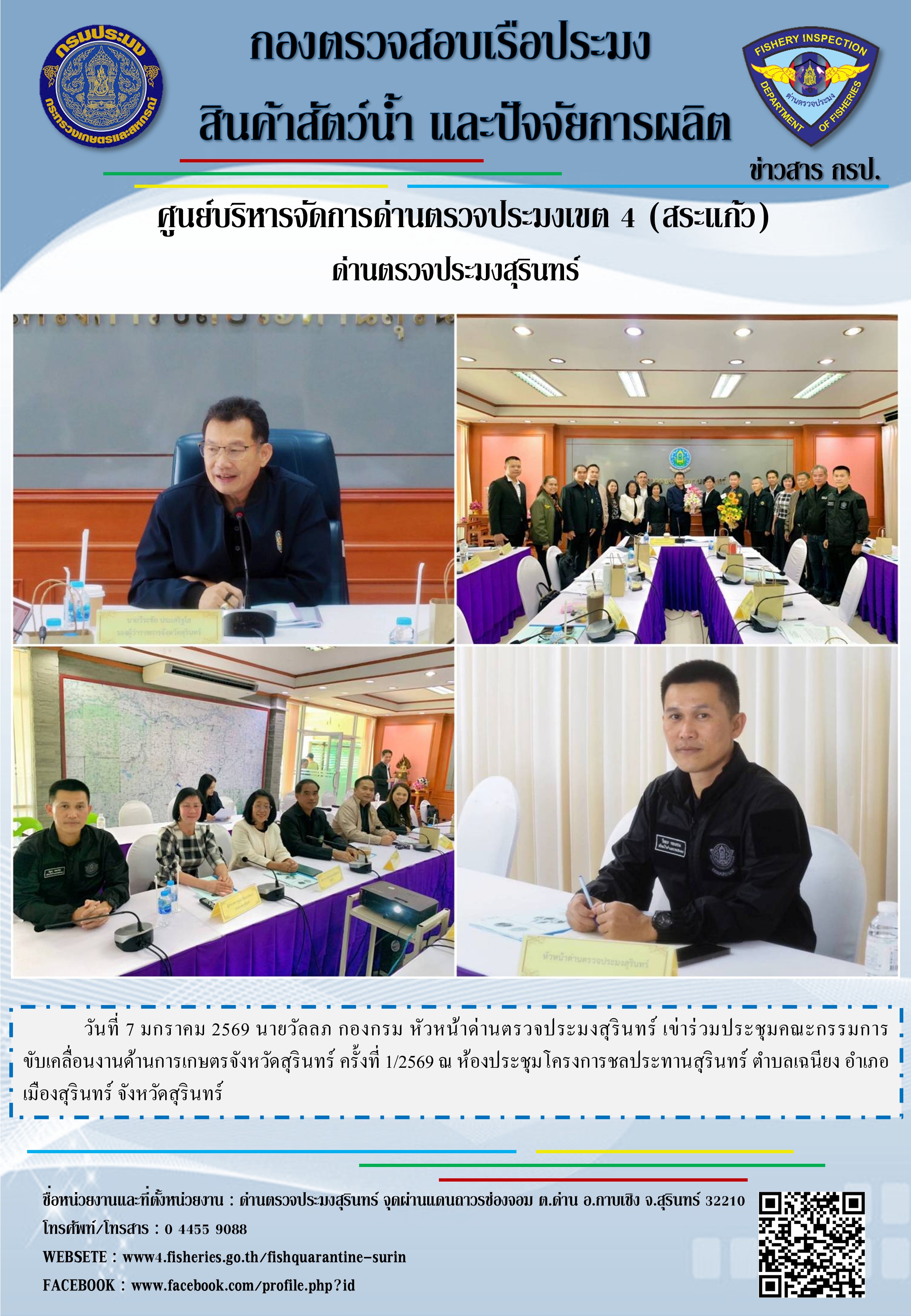 วันที่ 7 มกราคม 2569 นายวัลลภ กองกรม หัวหน้าด่านตรวจประมงสุรินทร์ เข่าร่วมประชุมคณะกรรมการขับเคลื่อนงานด้านการเกษตรจังหวัดสุรินทร์ ครั้งที่ 1/2569 ณ ห้องประชุมโครงการชลประทานสุรินทร์ ตำบลเฉนียง อำเภอเมืองสุรินทร์ จังหวัดสุรินทร์