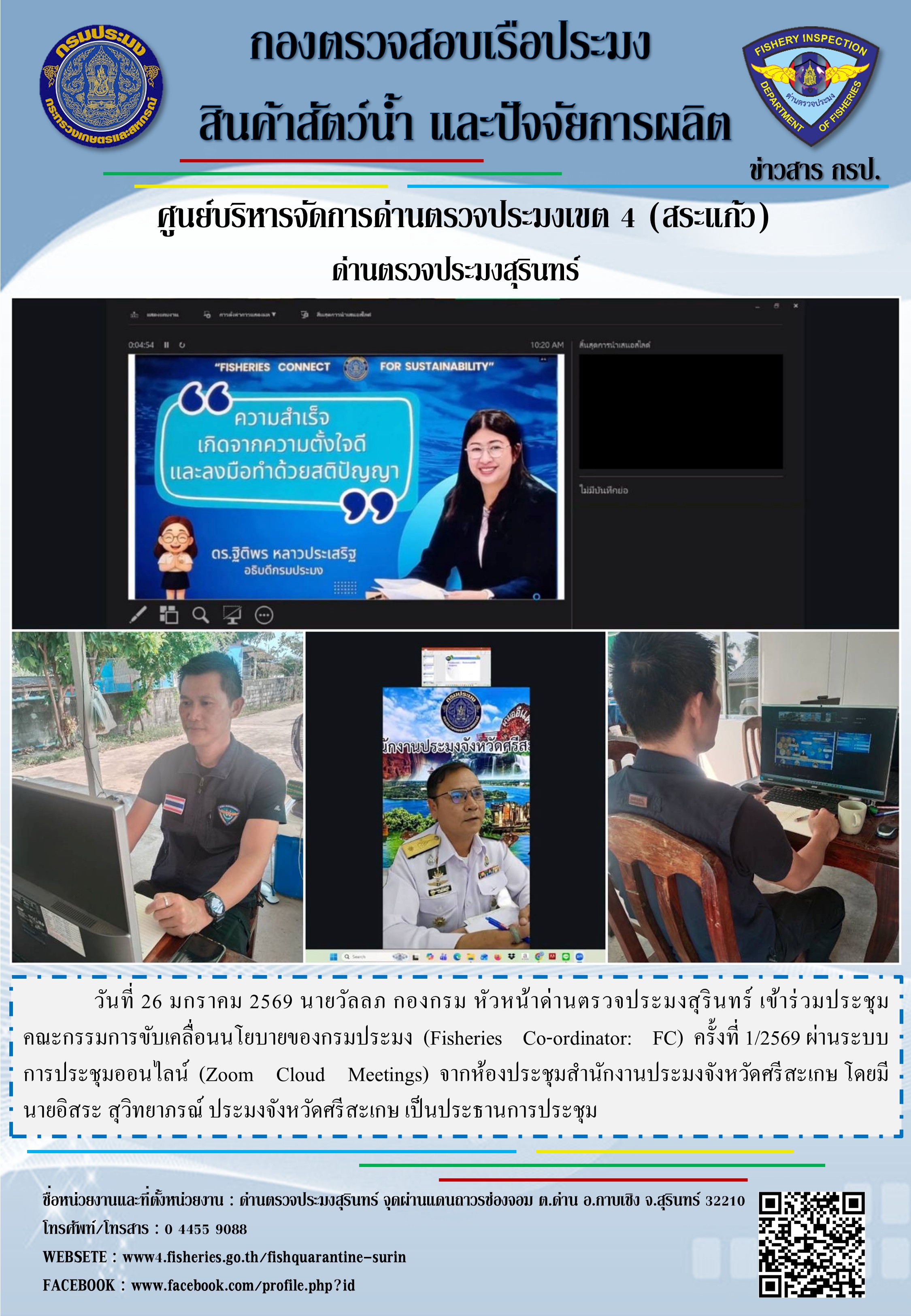 วันที่ 26 มกราคม 2569 นายวัลลภ กองกรม หัวหน้าด่านตรวจประมงสุรินทร์ เข้าร่วมประชุมคณะกรรมการขับเคลื่อนนโยบายของกรมประมง  (Fisheries Co-ordinator: FC)  ครั้งที่ 1/2569 ผ่านระบบการประชุมออนไลน์  (Zoom Cloud Meetings)  จากห้องประชุมสำนักงานประมงจังหวัดศรีสะเกษ โดยมี นายอิสระ สุวิทยาภรณ์ ประมงจังหวัดศรีสะเกษ เป็นประธานการประชุม