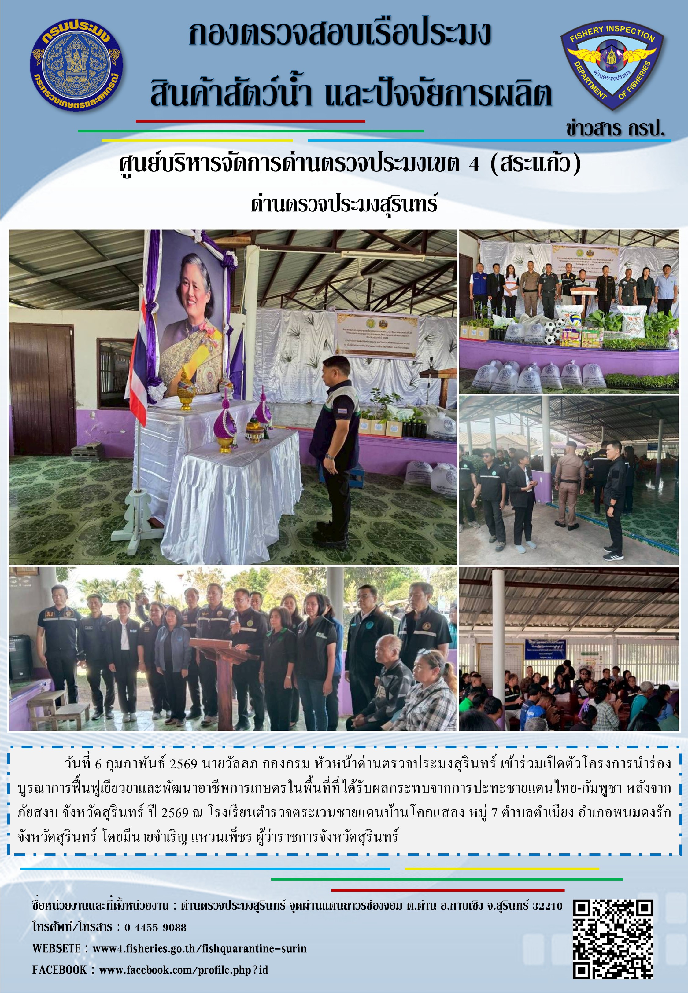 วันที่ 6 กุมภาพันธ์ 2569 นายวัลลภ กองกรม หัวหน้าด่านตรวจประมงสุรินทร์ เข้าร่วมเปิดตัวโครงการนำร่องบูรณาการฟื้นฟูเยียวยาและพัฒนาอาชีพการเกษตรในพื้นที่ที่ได้รับผลกระทบจากการปะทะชายแดนไทย-กัมพูชา หลังจากภัยสงบ จังหวัดสุรินทร์ ปี 2569 ณ โรงเรียนตำรวจตระเวนชายแดนบ้านโคกแสลง หมู่ 7 ตำบลตำเมียง อำเภอพนมดงรัก จังหวัดสุรินทร์ โดยมีนายจำเริญ แหวนเพ็ชร ผู้ว่าราชการจังหวัดสุรินทร์