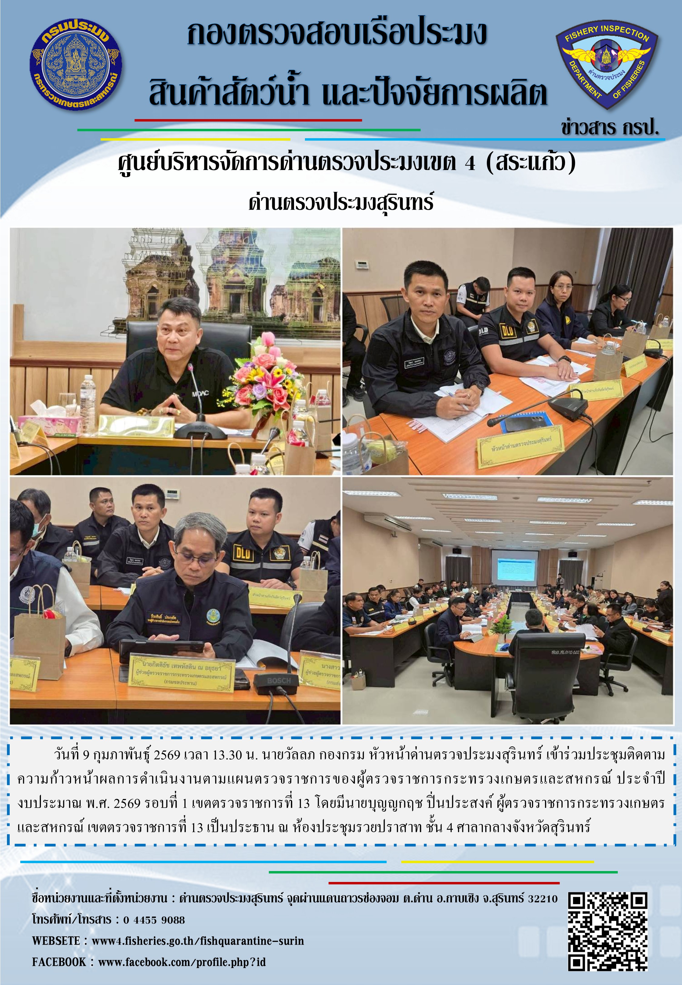 วันที่ 9 กุมภาพันธุ์ 2569 เวลา 13.30 น. นายวัลลภ กองกรม หัวหน้าด่านตรวจประมงสุรินทร์ เข้าร่วมประชุมติดตามความก้าวหน้าผลการดำเนินงานตามแผนตรวจราชการของผู้ตรวจราชการกระทรวงเกษตรและสหกรณ์ ประจำปีงบประมาณ พ.ศ. 2569 รอบที่ 1 เขตตรวจราชการที่ 13 โดยมีนายบุญญกฤช ปิ่นประสงค์ ผู้ตรวจราชการกระทรวงเกษตรและสหกรณ์ เขตตรวจราชการที่ 13 เป็นประธาน ณ ห้องประชุมรวยปราสาท ชั้น 4 ศาลากลางจังหวัดสุรินทร์