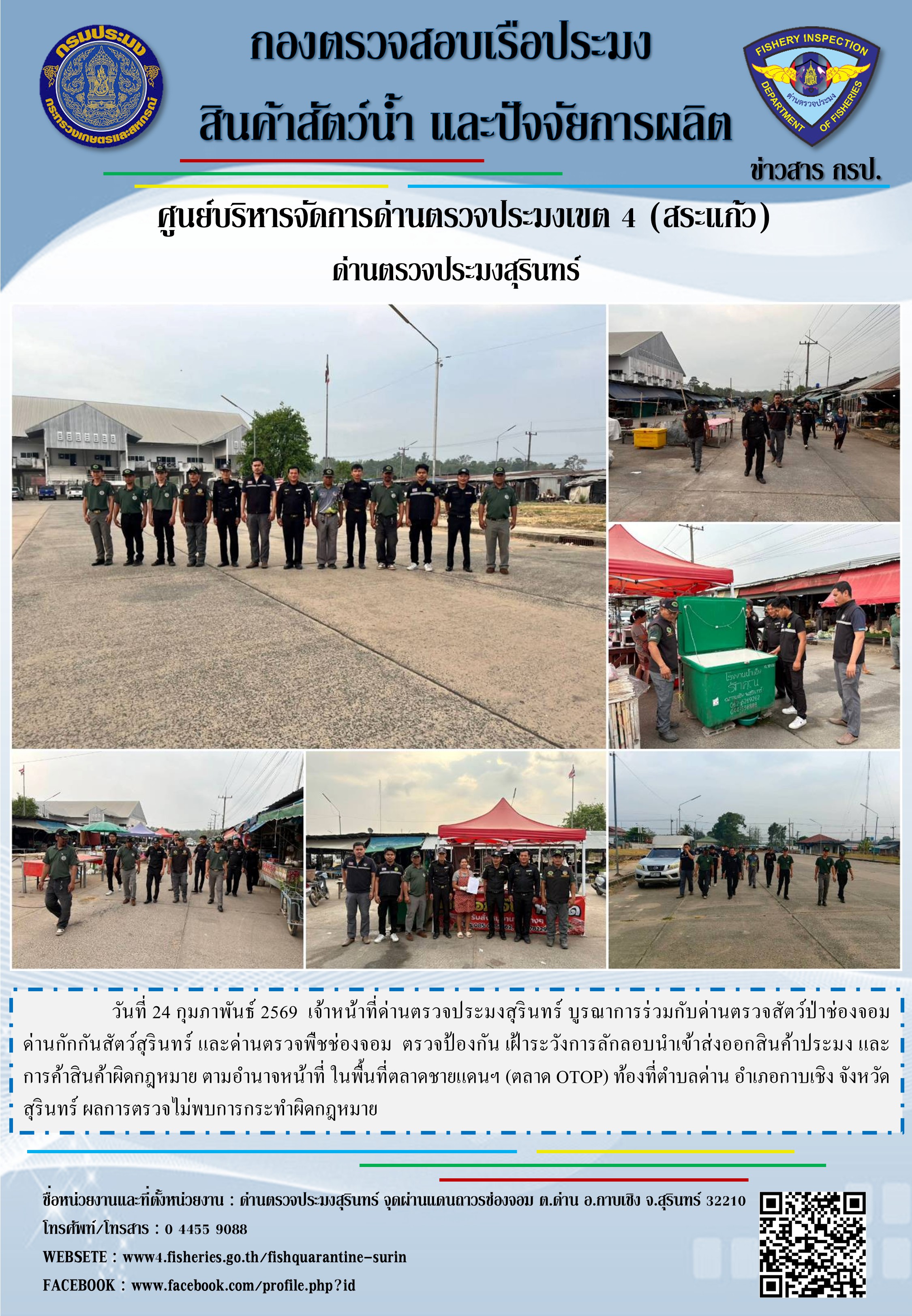 วันที่ 24 กุมภาพันธ์ 2569  เจ้าหน้าที่ด่านตรวจประมงสุรินทร์ บูรณาการร่วมกับด่านตรวจสัตว์ป่าช่องจอม ด่านกักกันสัตว์สุรินทร์ และด่านตรวจพืชช่องจอม ตรวจป้องกัน เฝ้าระวังการลักลอบนำเข้าส่งออกสินค้าประมง และการค้าสินค้าผิดกฎหมาย ตามอำนาจหน้าที่ ในพื้นที่ตลาดชายแดนฯ (ตลาด OTOP) ท้องที่ตำบลด่าน อำเภอกาบเชิง จังหวัดสุรินทร์ ผลการตรวจไม่พบการกระทำผิดกฎหมาย