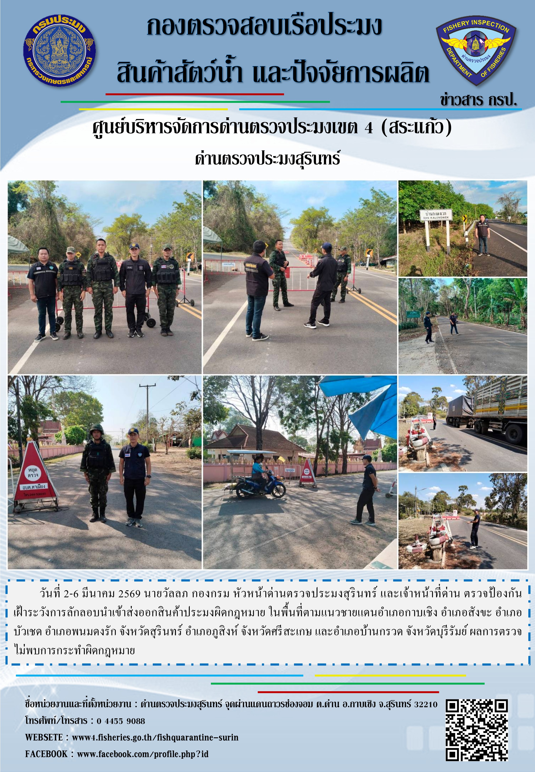 วันที่ 2-6 มีนาคม 2569 นายวัลลภ กองกรม หัวหน้าด่านตรวจประมงสุรินทร์ และเจ้าหน้าที่ด่าน ตรวจป้องกัน เฝ้าระวังการลักลอบนำเข้าส่งออกสินค้าประมงผิดกฎหมาย ในพื้นที่ตามแนวชายแดนอำเภอกาบเชิง อำเภอสังขะ อำเภอบัวเชด อำเภอพนมดงรัก จังหวัดสุรินทร์ อำเภอภูสิงห์ จังหวัดศรีสะเกษ และอำเภอบ้านกรวด จังหวัดบุรีรัมย์ ผลการตรวจไม่พบการกระทำผิดกฎหมาย