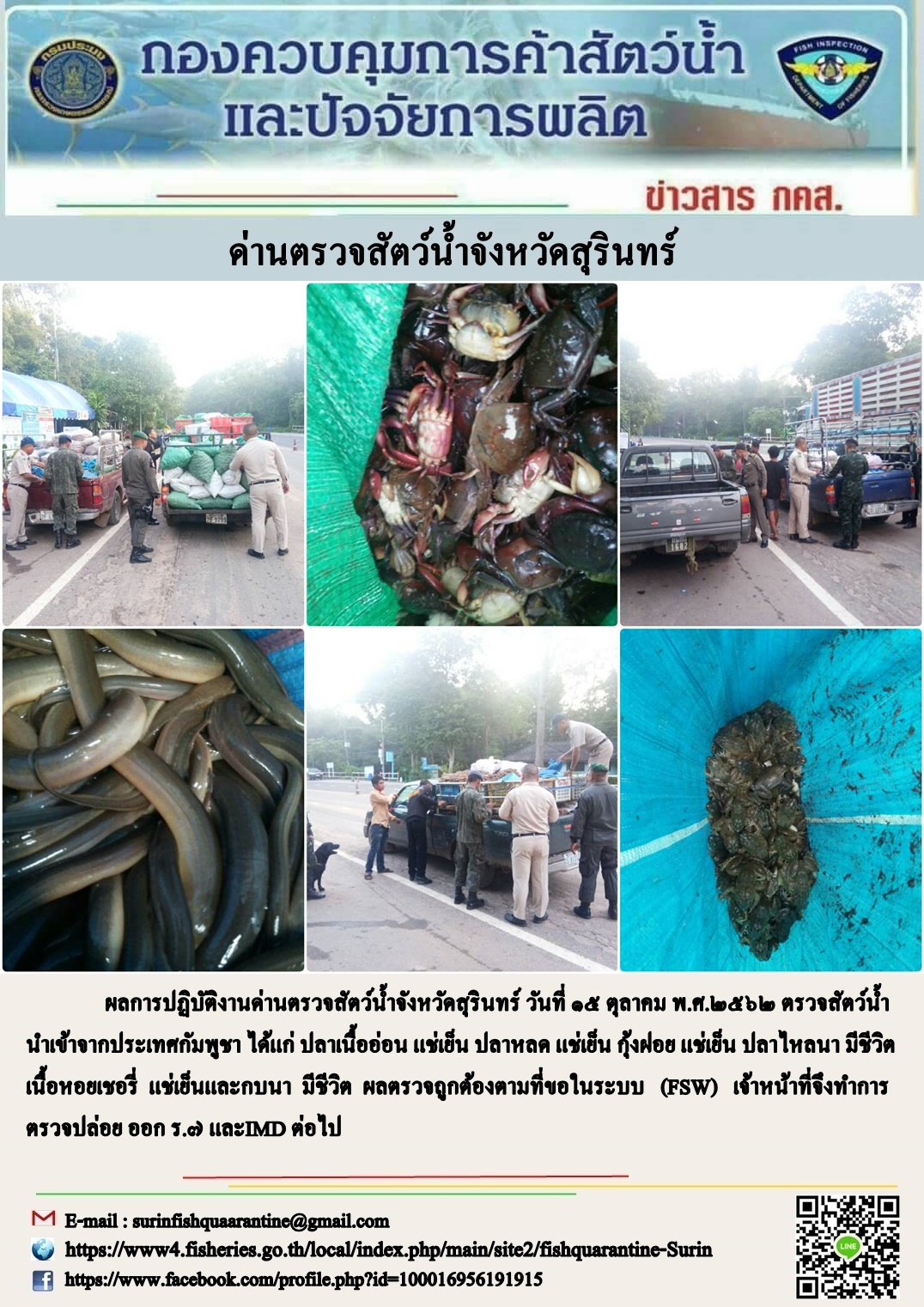 ผลการปฏิบัติงานด่านตรวจสัตว์น้ำจังหวัดสุรินทร์ วันที่ ๑๕ ตุลาคม พ.ศ.๒๕๖๒