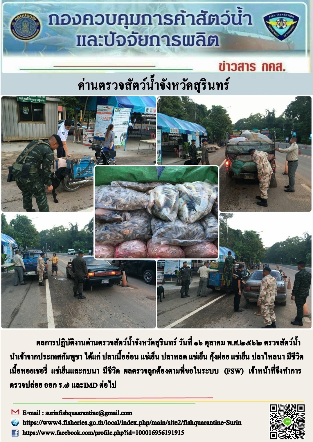 ผลการปฏิบัติงานด่านตรวจสัตว์น้ำจังหวัดสุรินทร์ วันที่ ๑๖ ตุลาคม พ.ศ.๒๕๖๒