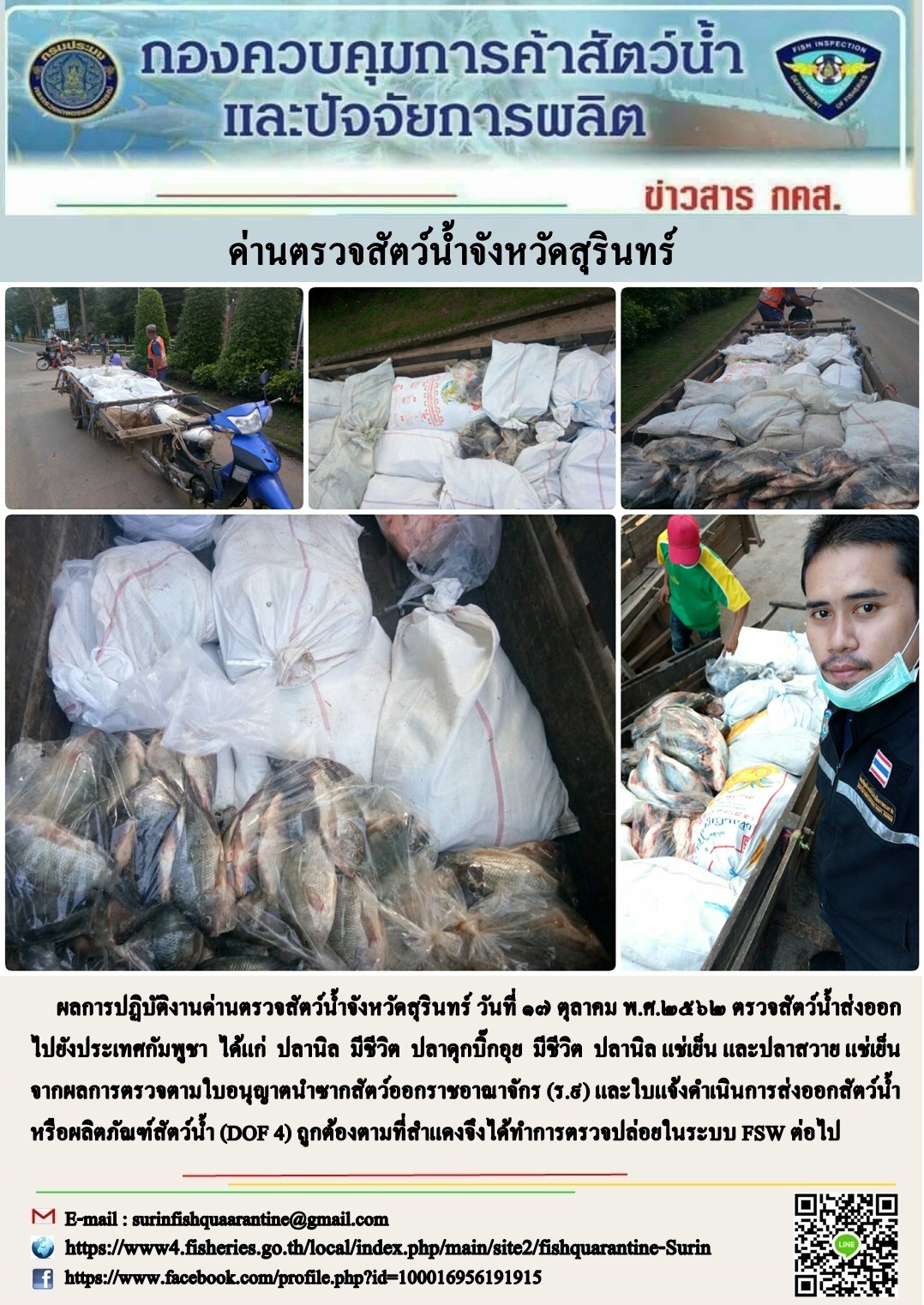 ผลการปฏิบัติงานด่านตรวจสัตว์น้ำจังหวัดสุรินทร์ วันที่ ๑๗ ตุลาคม พ.ศ.๒๕๖๒