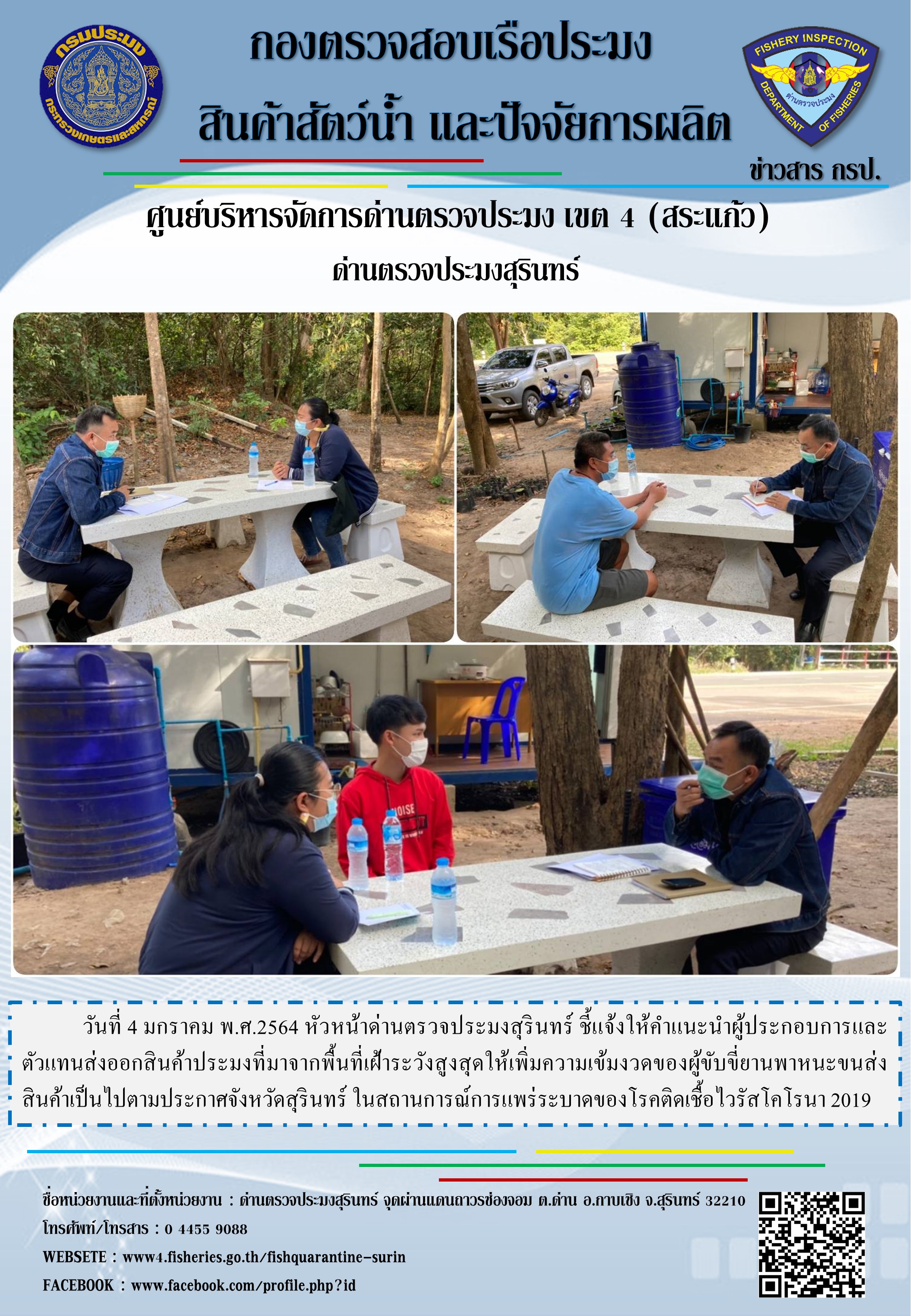 วันที่ 4 มกราคม พ.ศ.2564 หัวหน้าด่านตรวจประมงสุรินทร์ ชี้แจ้งให้คำแนะนำผู้ประกอบการและตัวแทนส่งออกสินค้าประมงที่มาจากพื้นที่เฝ้าระวังสูงสุดให้เพิ่มความเข้มงวดของผู้ขับขี่ยานพาหนะขนส่งสินค้าเป็นไปตามประกาศจังหวัดสุรินทร์ ในสถานการณ์การแพร่ระบาดของโรคติดเชื้อไวรัสโคโรนา 2019
