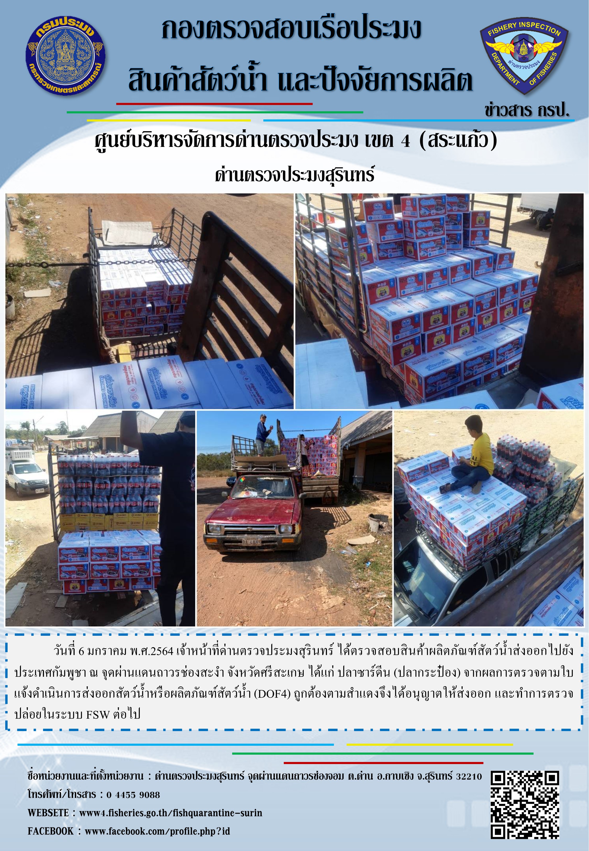 วันที่ 6 มกราคม พ.ศ.2564 เจ้าหน้าที่ด่านตรวจประมงสุรินทร์ ได้ตรวจสอบสินค้าผลิตภัณฑ์สัตว์น้ำส่งออกไปยังประเทศกัมพูชา ณ จุดผ่านแดนถาวรช่องสะงำ จังหวัดศรีสะเกษ ได้แก่ ปลาซาร์ดีน (ปลากระป๋อง) จากผลการตรวจตามใบแจ้งดำเนินการส่งออกสัตว์น้ำหรือผลิตภัณฑ์สัตว์น้ำ (DOF4) ถูกต้องตามสำแดงจึงได้อนุญาตให้ส่งออก และทำการตรวจปล่อยในระบบ FSW ต่อไป