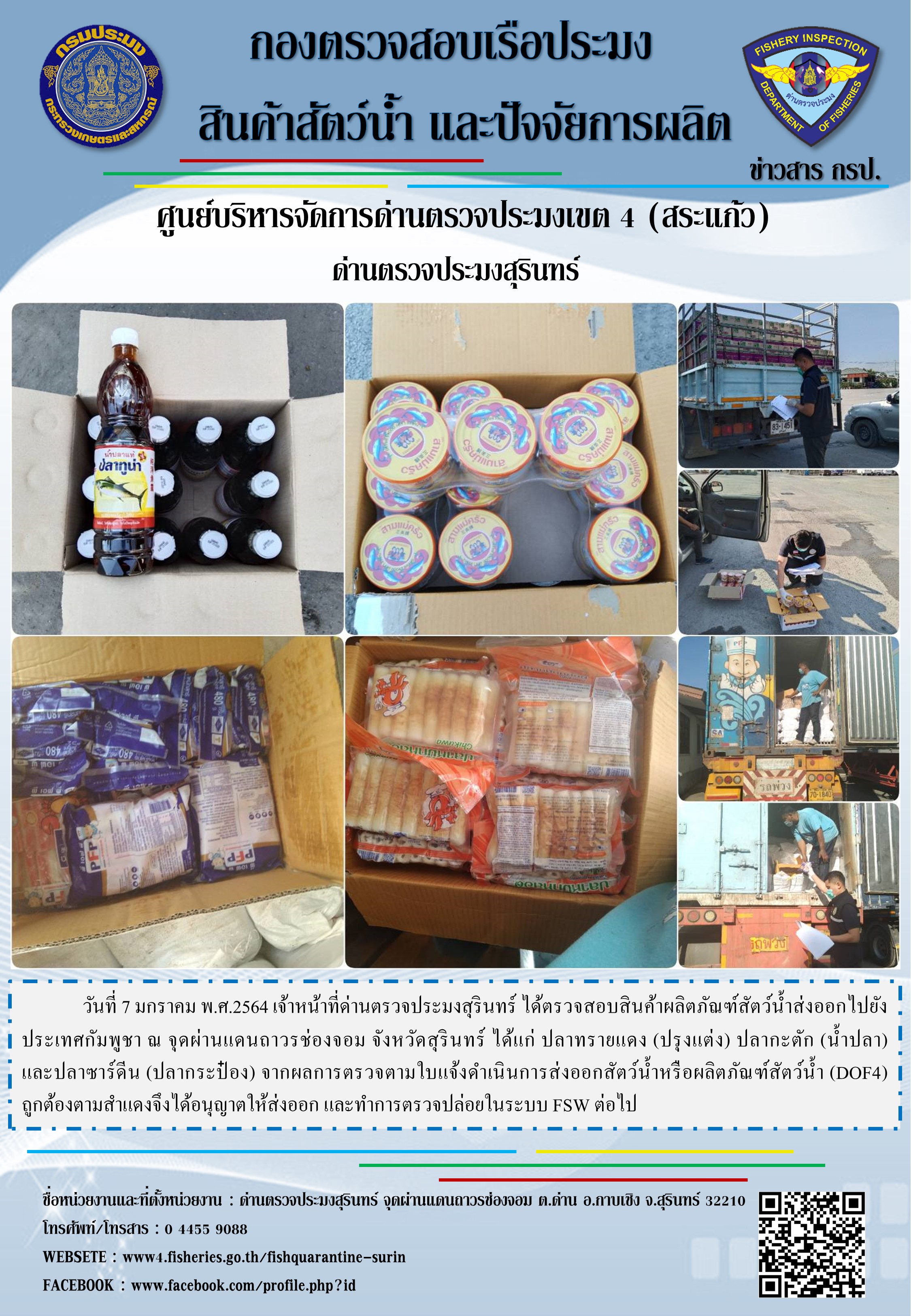 วันที่ 7 มกราคม พ.ศ.2564 เจ้าหน้าที่ด่านตรวจประมงสุรินทร์ ได้ตรวจสอบสินค้าผลิตภัณฑ์สัตว์น้ำส่งออกไปยังประเทศกัมพูชา ณ จุดผ่านแดนถาวรช่องจอม จังหวัดสุรินทร์ ได้แก่ ปลาทรายแดง (ปรุงแต่ง) ปลากะตัก (น้ำปลา) และปลาซาร์ดีน (ปลากระป๋อง) จากผลการตรวจตามใบแจ้งดำเนินการส่งออกสัตว์น้ำหรือผลิตภัณฑ์สัตว์น้ำ (DOF4) ถูกต้องตามสำแดงจึงได้อนุญาตให้ส่งออก และทำการตรวจปล่อยในระบบ FSW ต่อไป