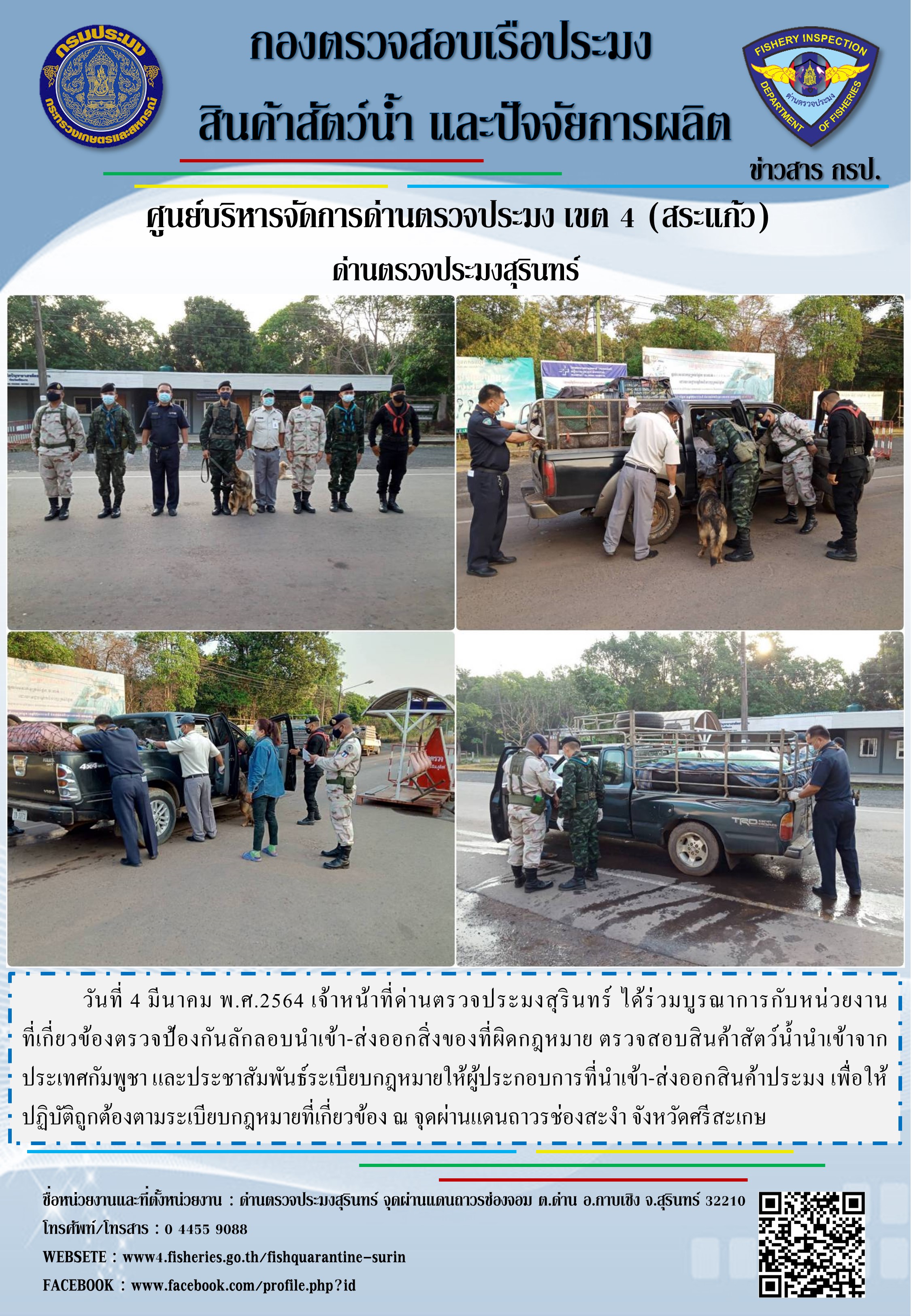 วันที่ 4 มีนาคม พ.ศ.2564 เจ้าหน้าที่ด่านตรวจประมงสุรินทร์ ได้ร่วมบูรณาการกับหน่วยงานที่เกี่ยวข้องตรวจป้องกันลักลอบนำเข้า-ส่งออกสิ่งของที่ผิดกฎหมาย ตรวจสอบสินค้าสัตว์น้ำนำเข้าจากประเทศกัมพูชา และประชาสัมพันธ์ระเบียบกฎหมายให้ผู้ประกอบการที่นำเข้า-ส่งออกสินค้าประมง เพื่อให้ปฏิบัติถูกต้องตามระเบียบกฎหมายที่เกี่ยวข้อง ณ จุดผ่านแดนถาวรช่องสะงำ จังหวัดศรีสะเกษ