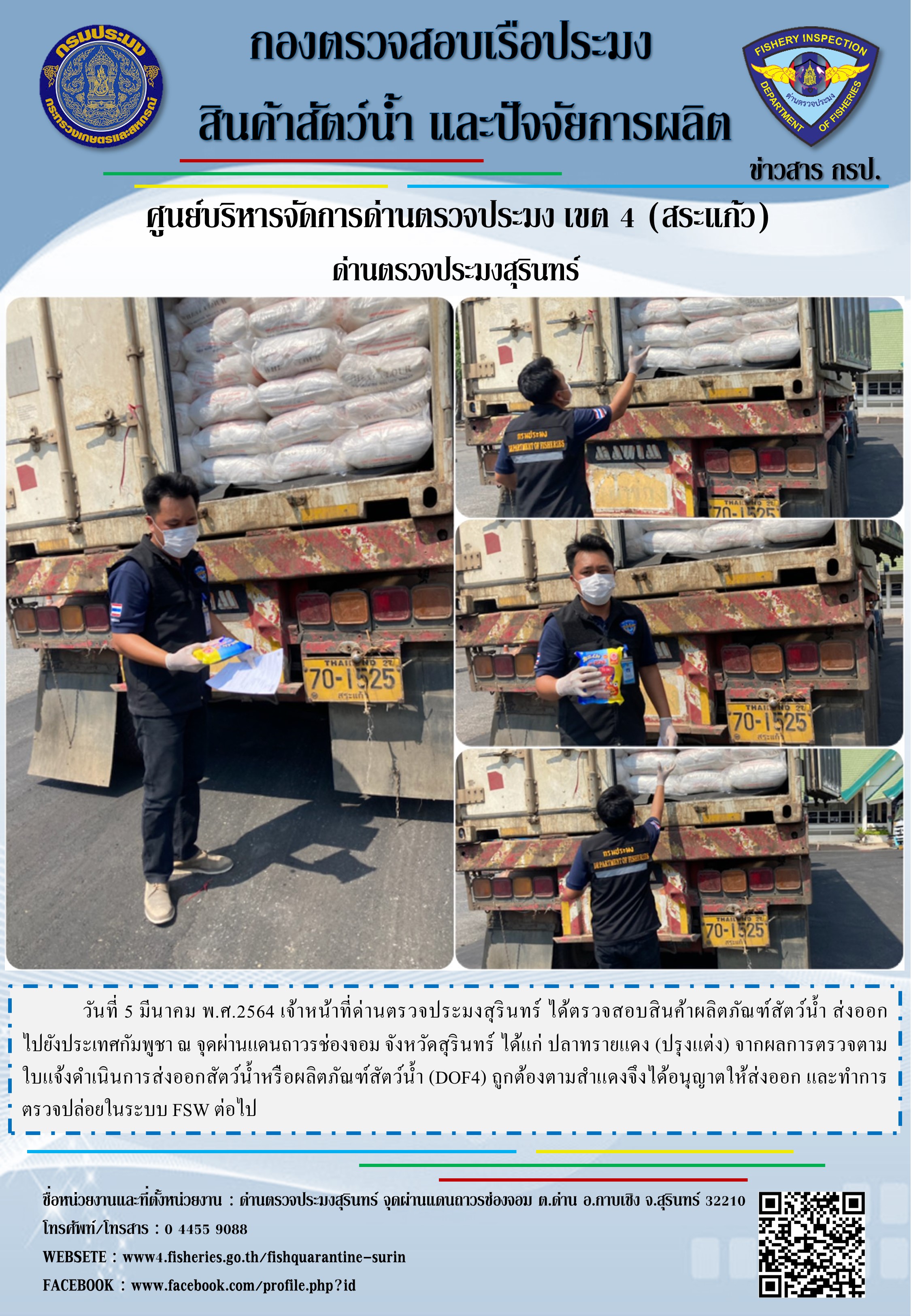 วันที่ 5 มีนาคม พ.ศ.2564 เจ้าหน้าที่ด่านตรวจประมงสุรินทร์ ได้ตรวจสอบสินค้าผลิตภัณฑ์สัตว์น้ำส่งออกไปยังประเทศกัมพูชา ณ จุดผ่านแดนถาวรช่องจอม จังหวัดสุรินทร์ ได้แก่ ปลาทรายแดง (ปรุงแต่ง)จากผลการตรวจตามใบแจ้งดำเนินการส่งออกสัตว์น้ำหรือผลิตภัณฑ์สัตว์น้ำ (DOF4) ถูกต้องตามสำแดงจึงได้อนุญาตให้ส่งออก และทำการตรวจปล่อยในระบบ FSW ต่อไป