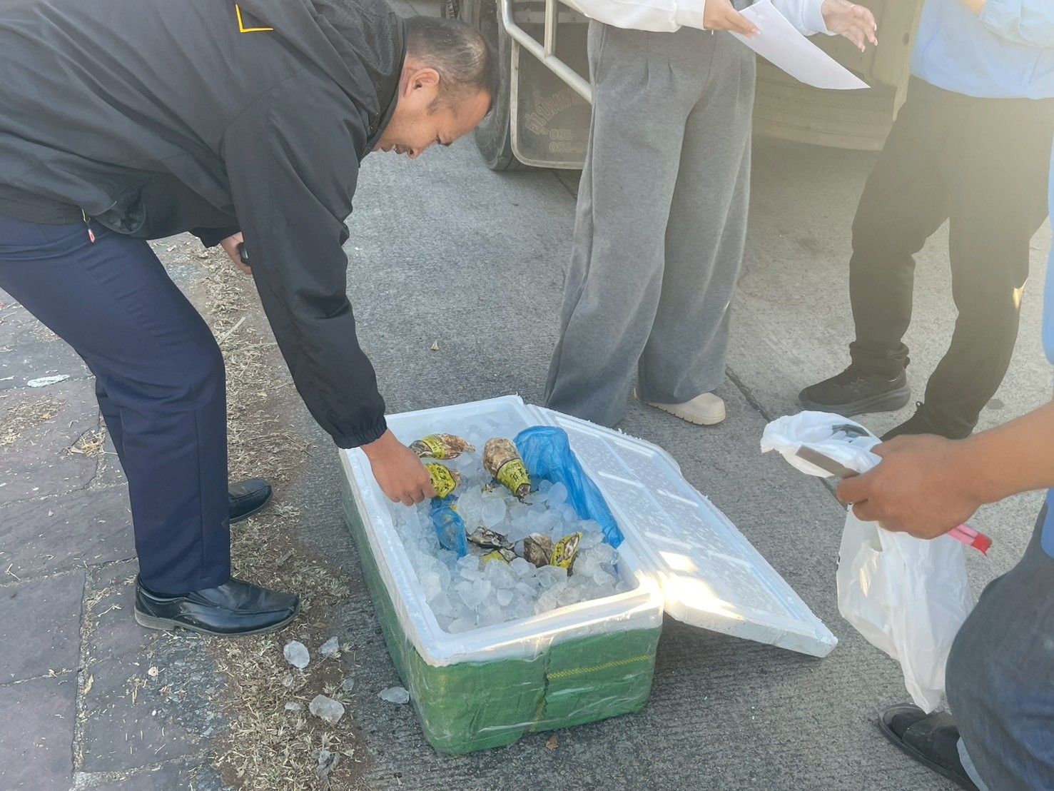 เจ้าหน้าที่ศูนย์บริหารจัดการด่านตรวจประมงเขต 1 (เชียงราย) ตรวจสอบสินค้าหอยนางรมมีชีวิต นำเข้ามาจากสาธารณรัฐประชาธิปไตยประชาชนลาว