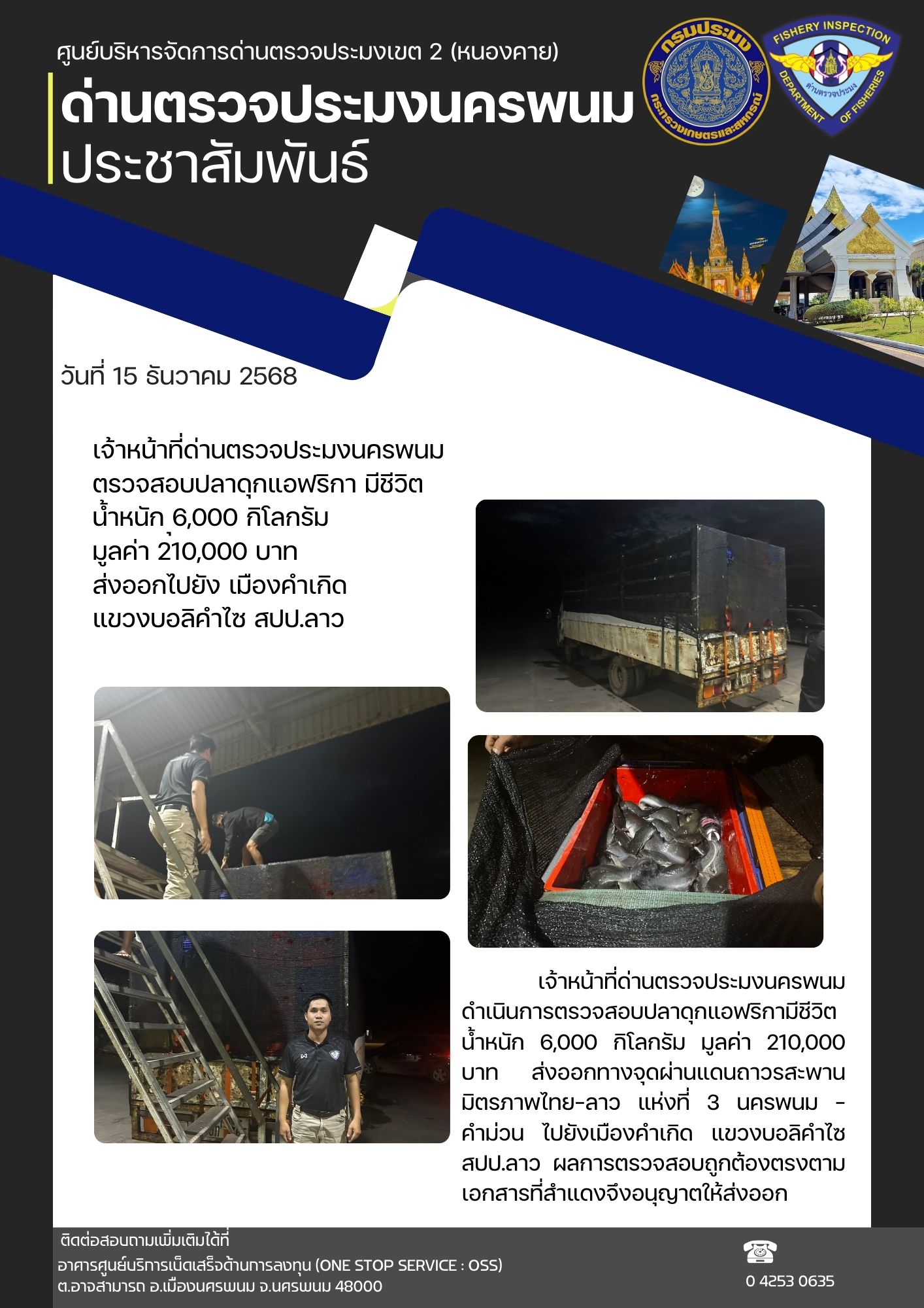 วันที่ 15 ธันวาคม 2568 เจ้าหน้าที่ด่านตรวจประมงนครพนม ดำเนินการตรวจสอบปลาดุกแอฟริกา มีชีวิต น้ำหนัก 7,500 กิโลกรัม มูลค่า 450,000 บาท ส่งออกทางจุดผ่านแดนถาวรสะพานมิตรภาพไทย-ลาว แห่งที่ 3 นครพนม -คำม่วน ไปยังมืองท่าแขก แขวงคำม่วน สปป.ลาว ผลการตรวจสอบถูกต้องตรงตามเอกสาร (DOF4) ที่สำแดงจึงอนุญาตให้ส่งออก