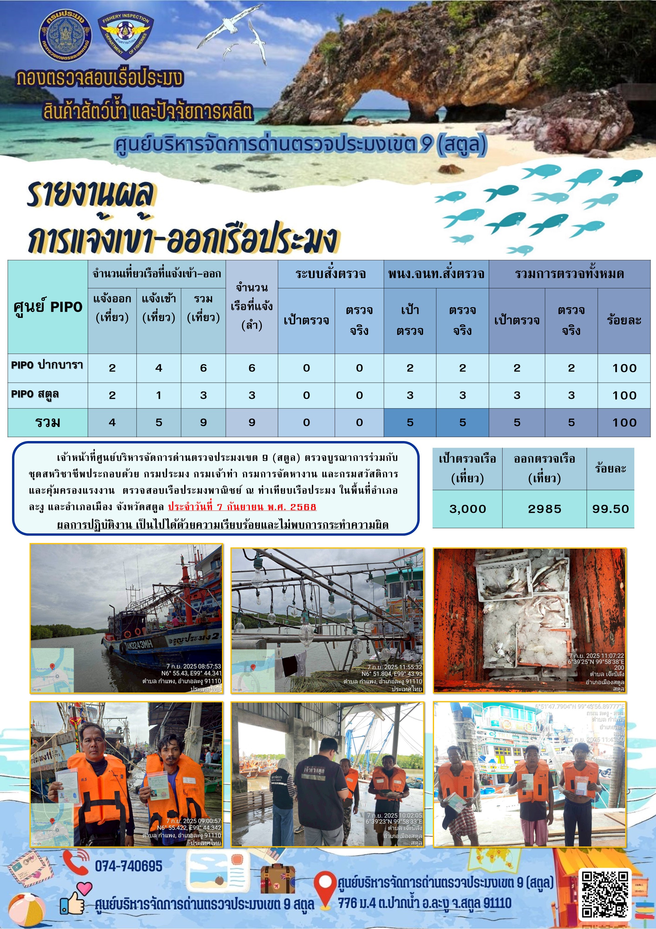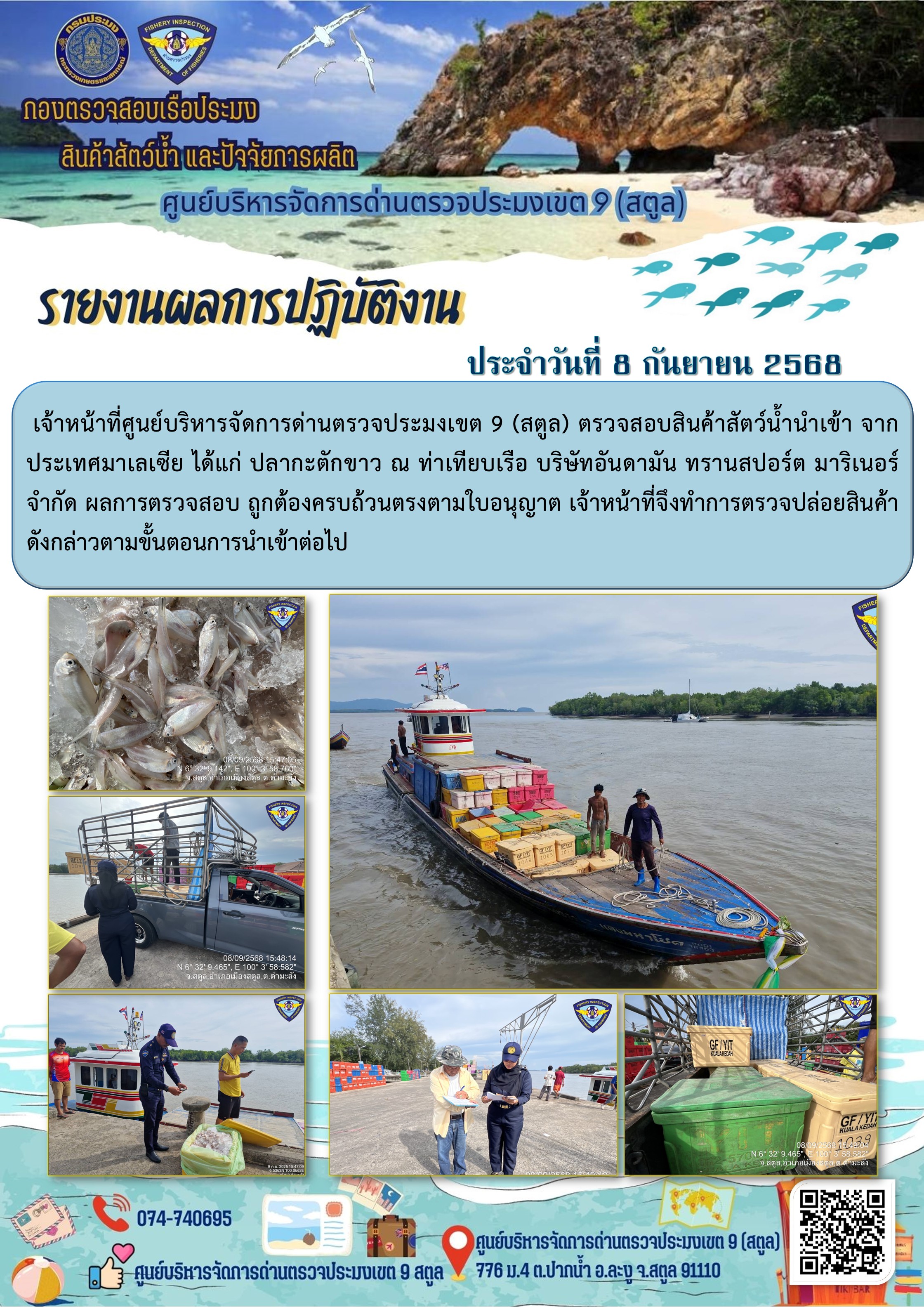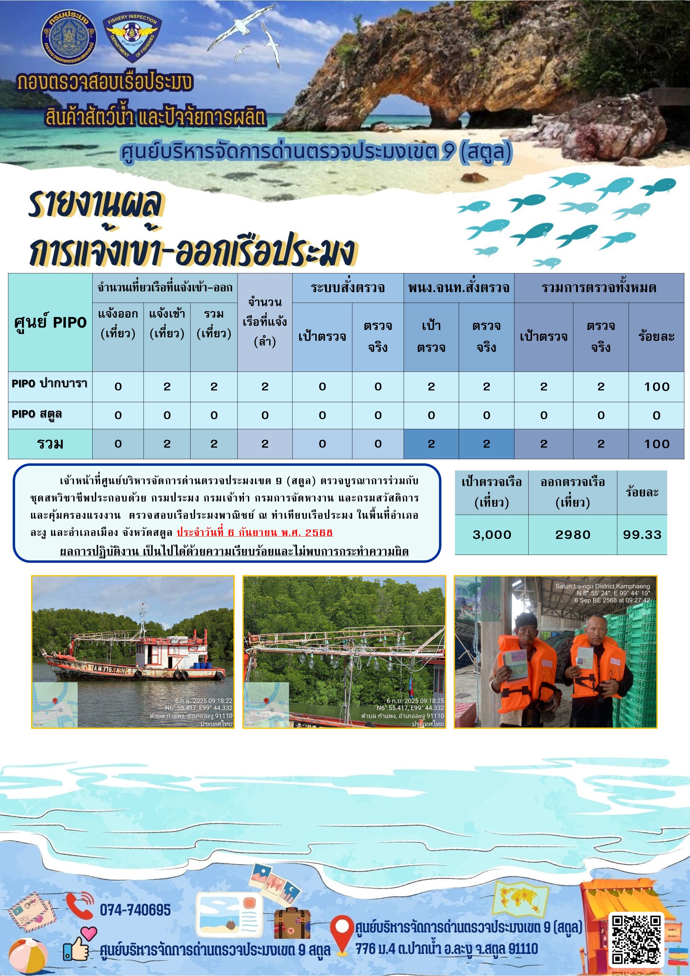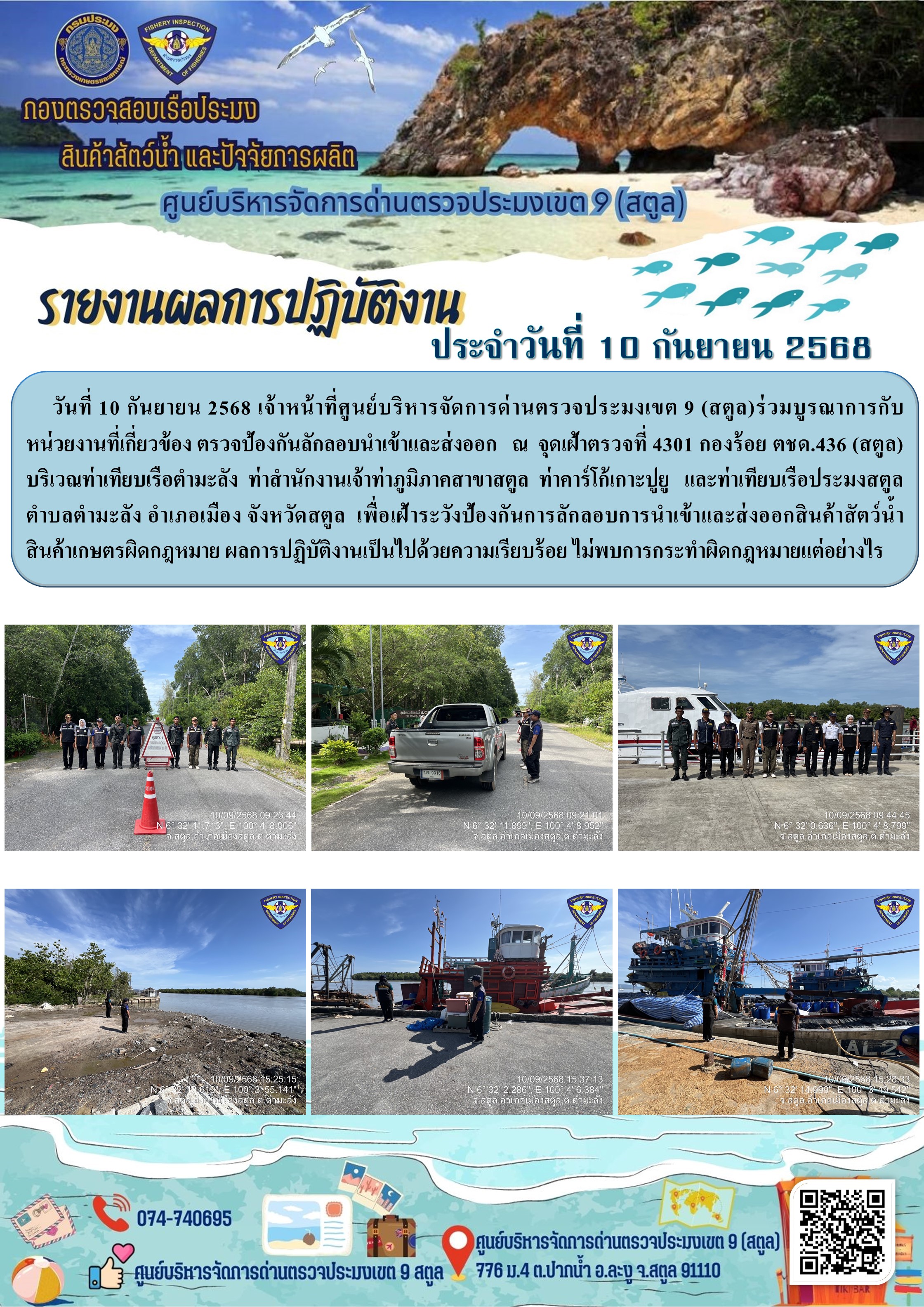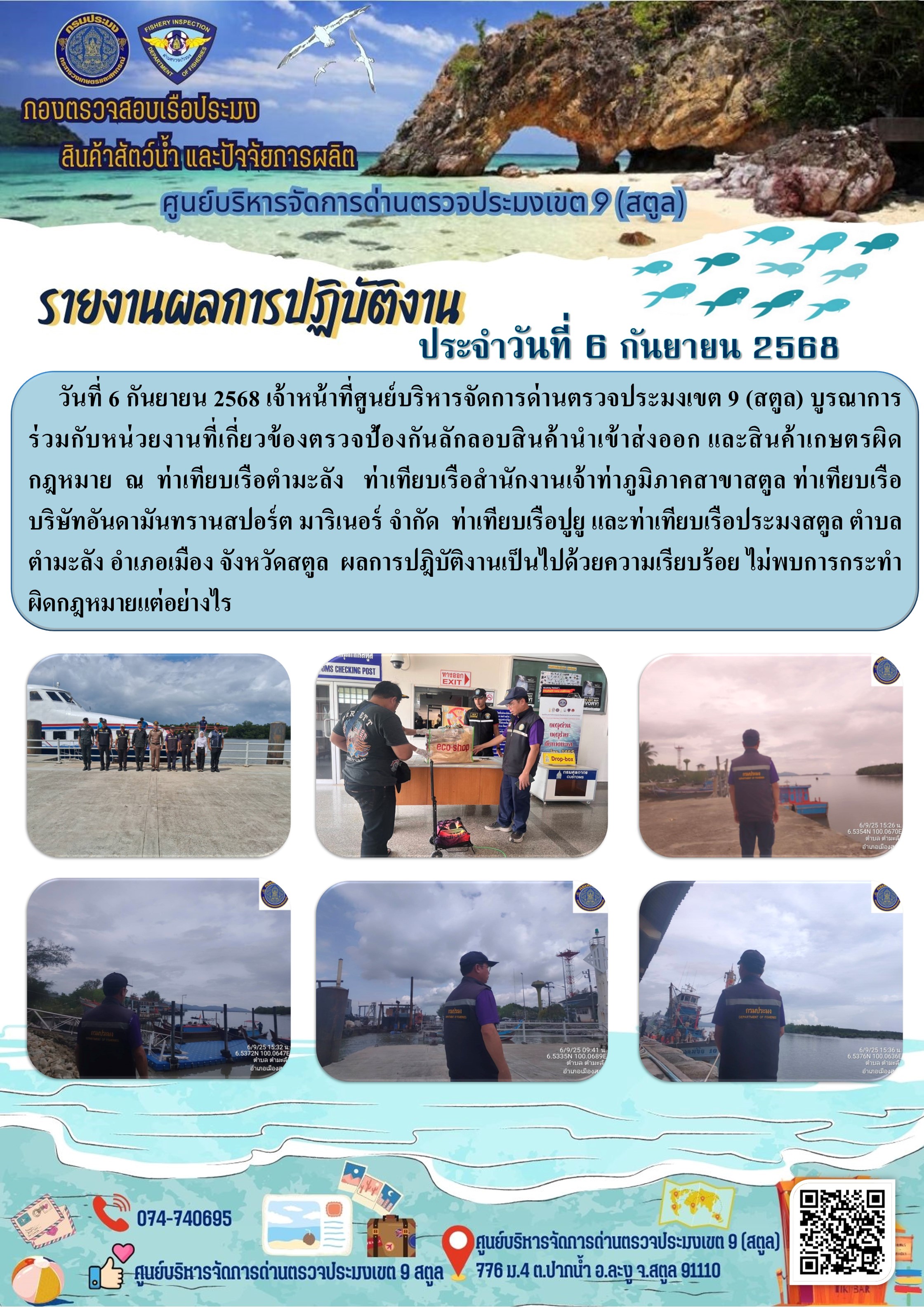 ประชาสัมพันธ์การปฏิบัติงานศูนย์บริหารจัดการด่านตรวจประมงเขต 9 (สตูล) ประจำวันที่ 6 - 10 กันยายน 2568
