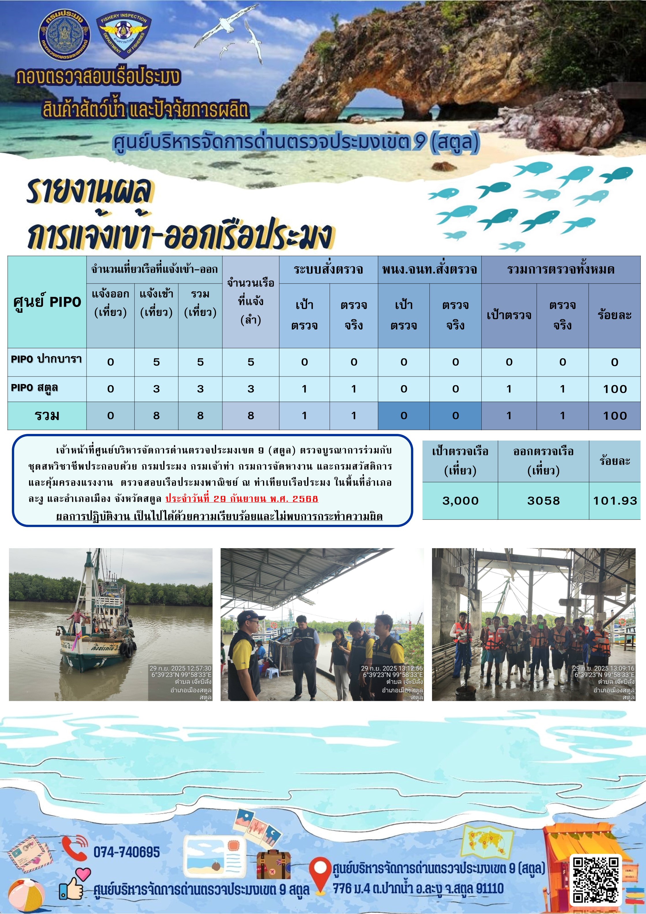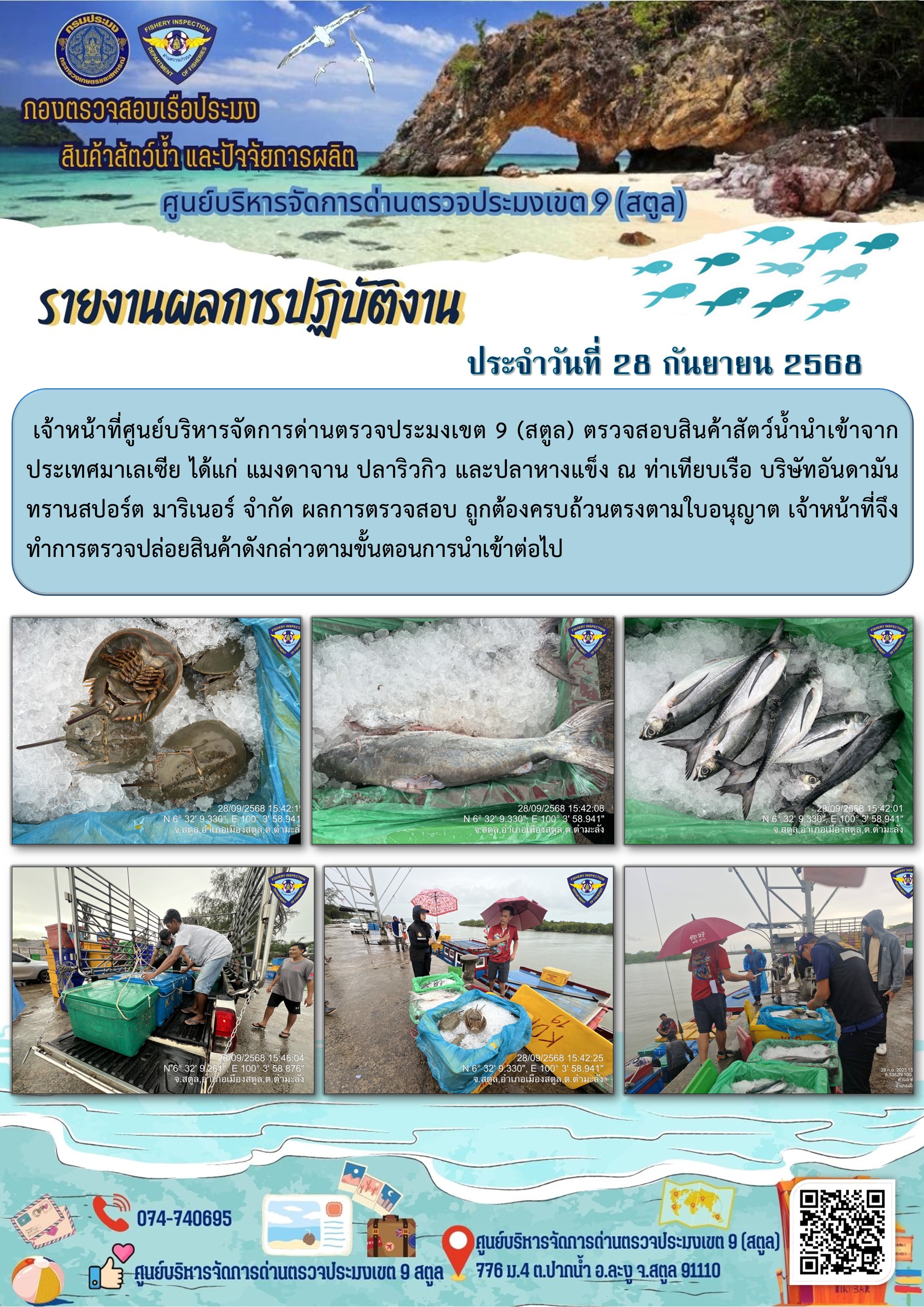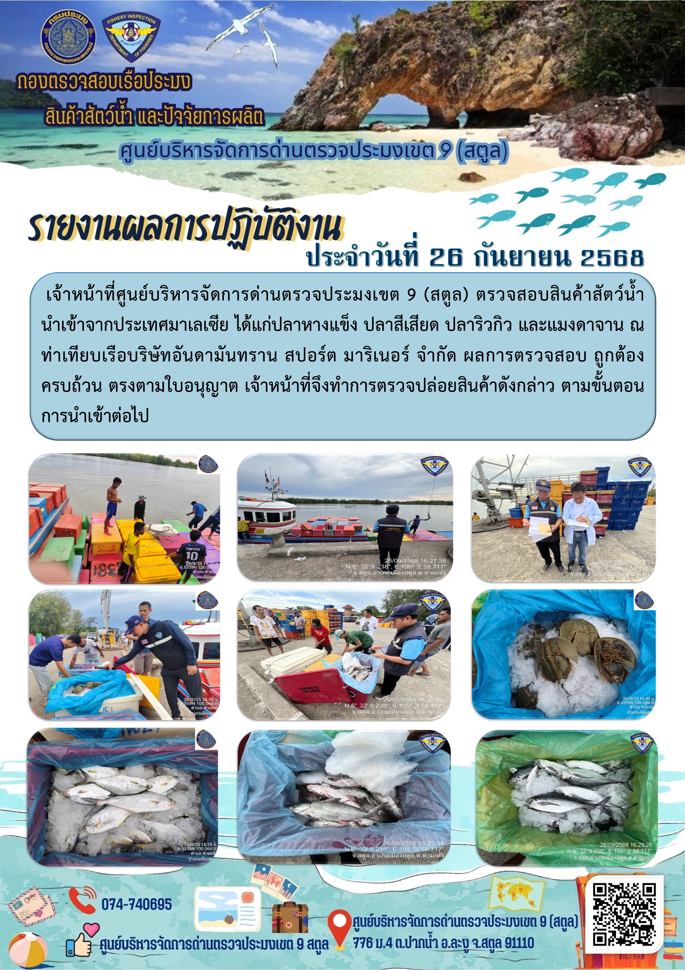 ประชาสัมพันธ์การปฏิบัติงานศูนย์บริหารจัดการด่านตรวจประมงเขต 9 (สตูล) ประจำวันที่ 26 - 30 กันยายน 2568