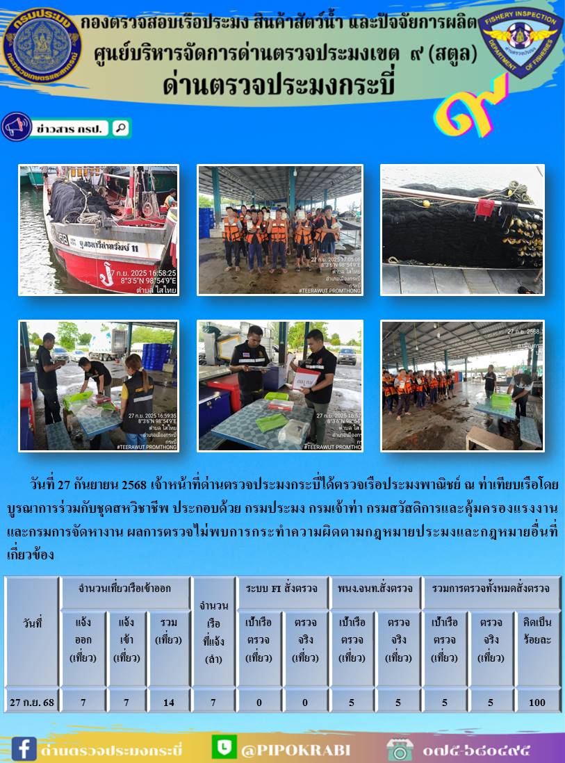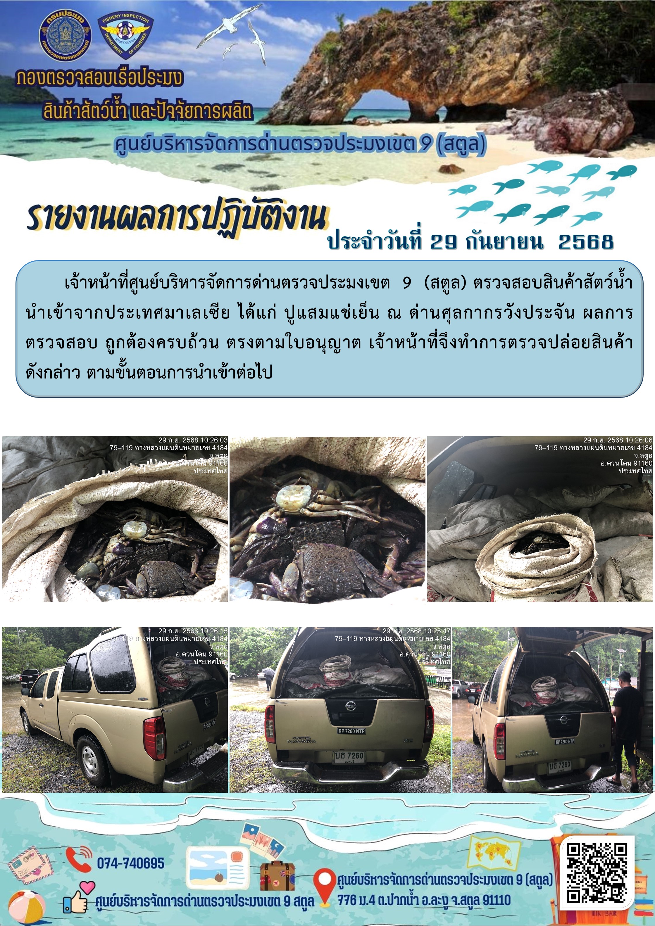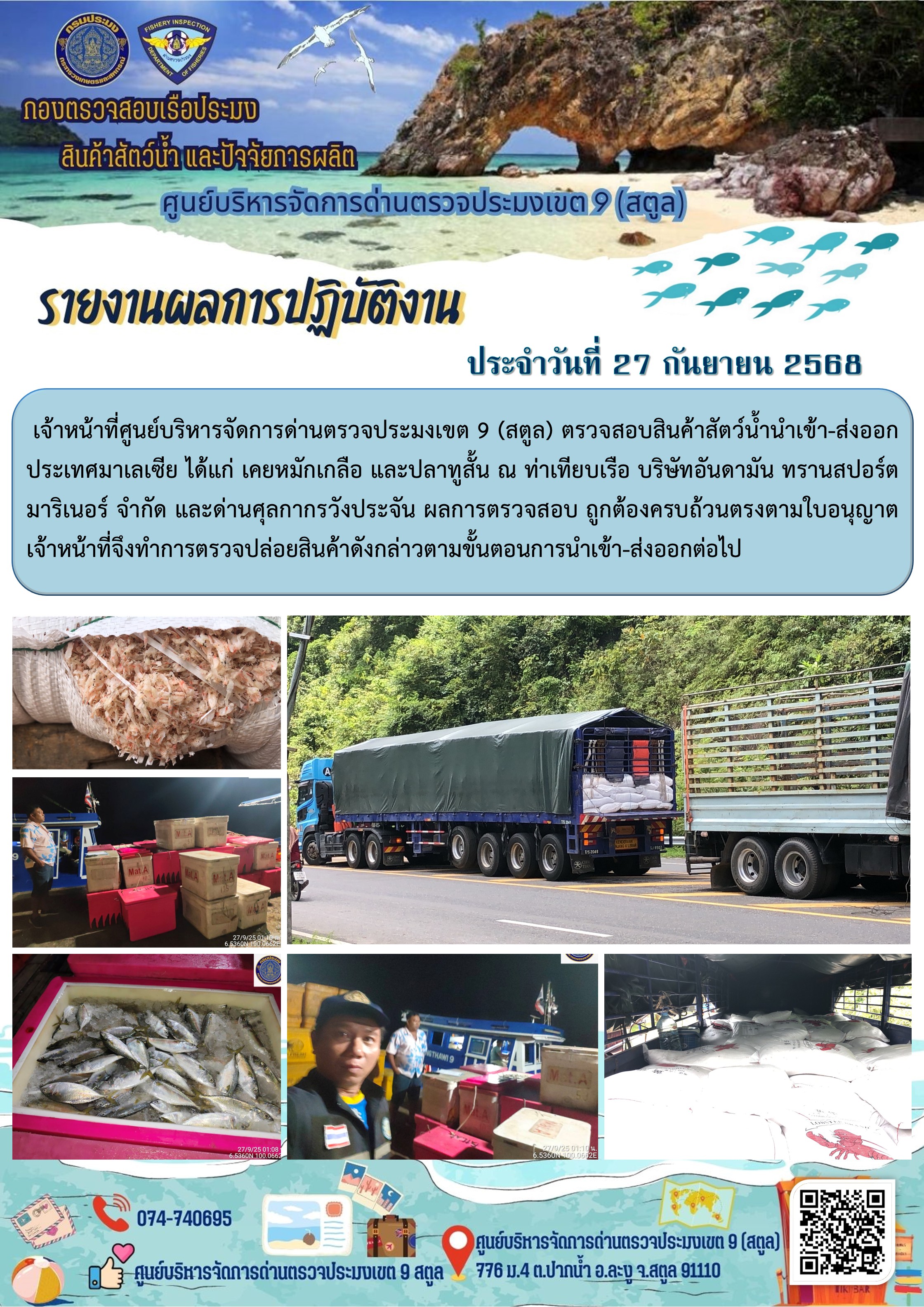 ประชาสัมพันธ์การปฏิบัติงานศูนย์บริหารจัดการด่านตรวจประมงเขต 9 (สตูล) ประจำวันที่ 26 - 30 กันยายน 2568