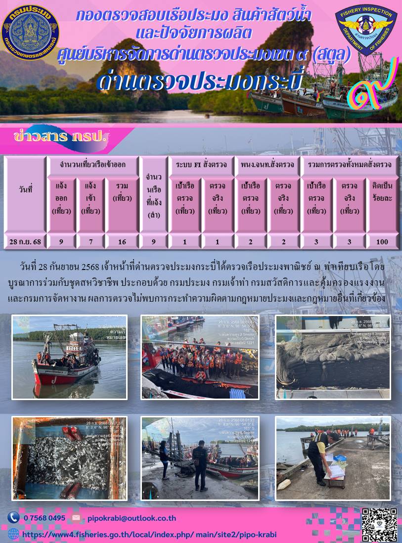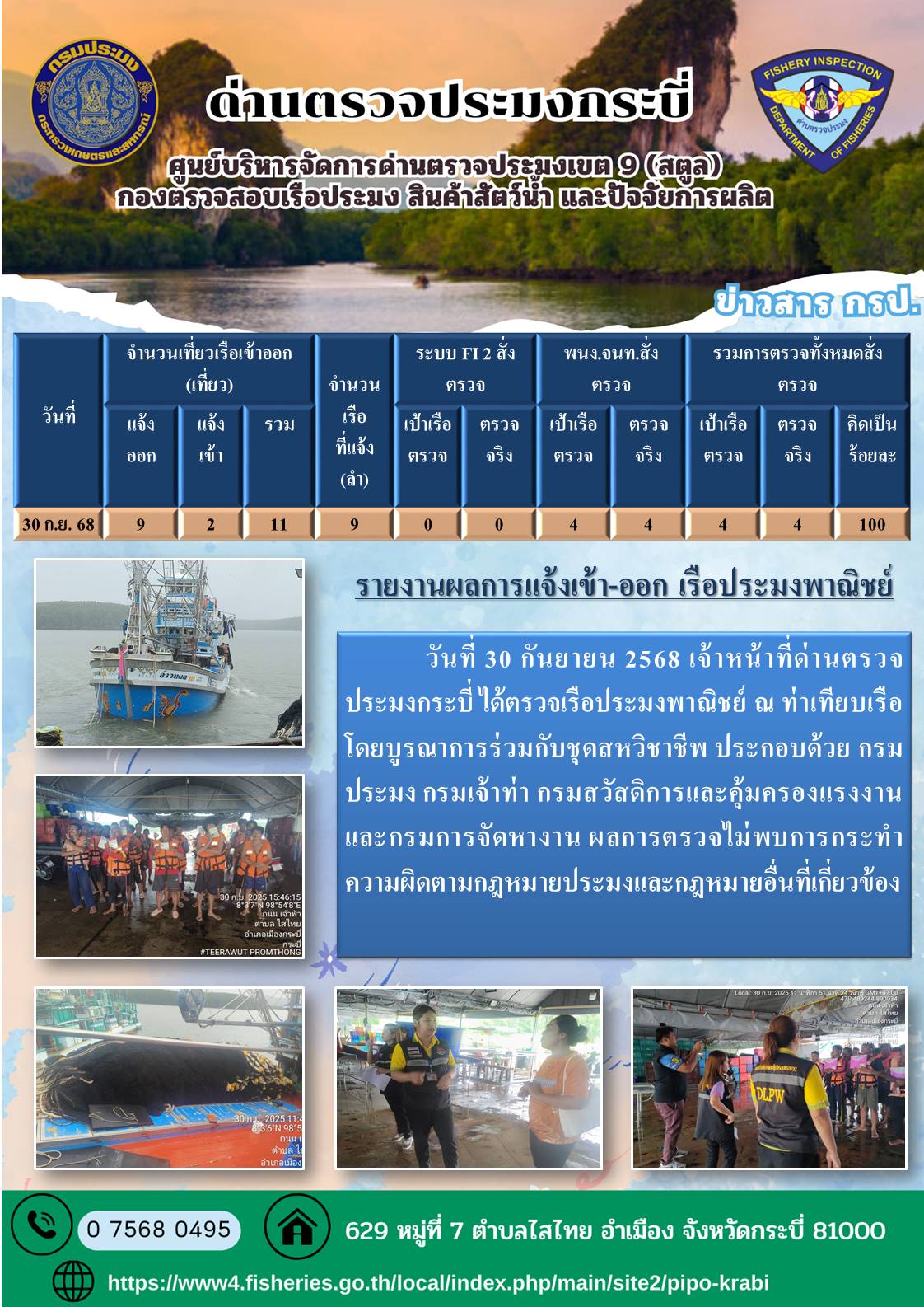 NEW ประชาสัมพันธ์การปฏิบัติงานศูนย์บริหารจัดการด่านตรวจประมงเขต 9 (สตูล) ประจำวันที่ 26 - 30 กันยายน 2568..คลิก