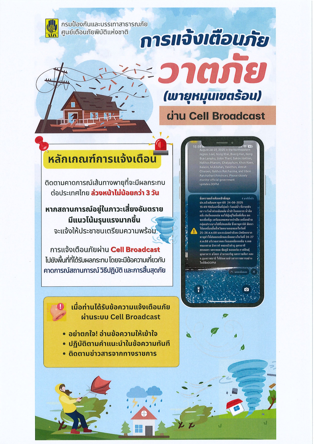 ขอแจ้งแนวทางปฏิบัติเตือนภัยผ่านสัญญาณโทรศัพท์เคลื่อนที่ (Cell Broadcast) โดยแบ่งการแจ้งเตือนภัยได้ 2 ประเภท