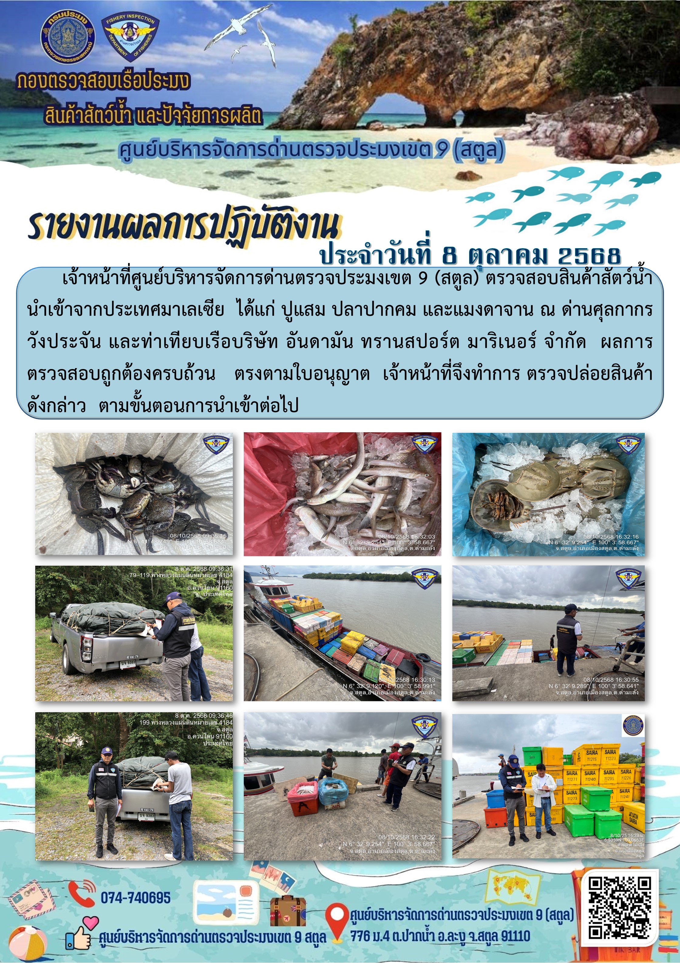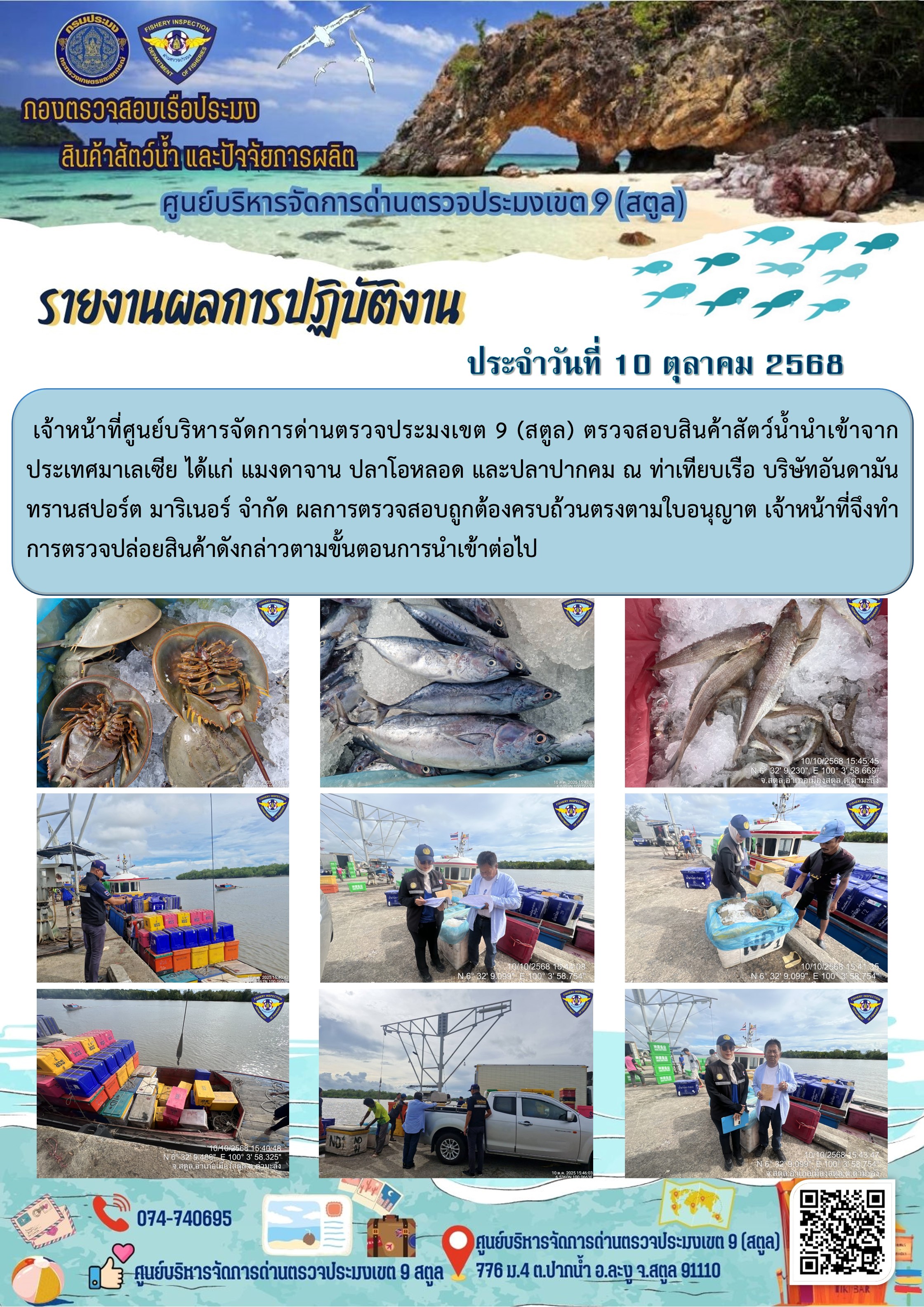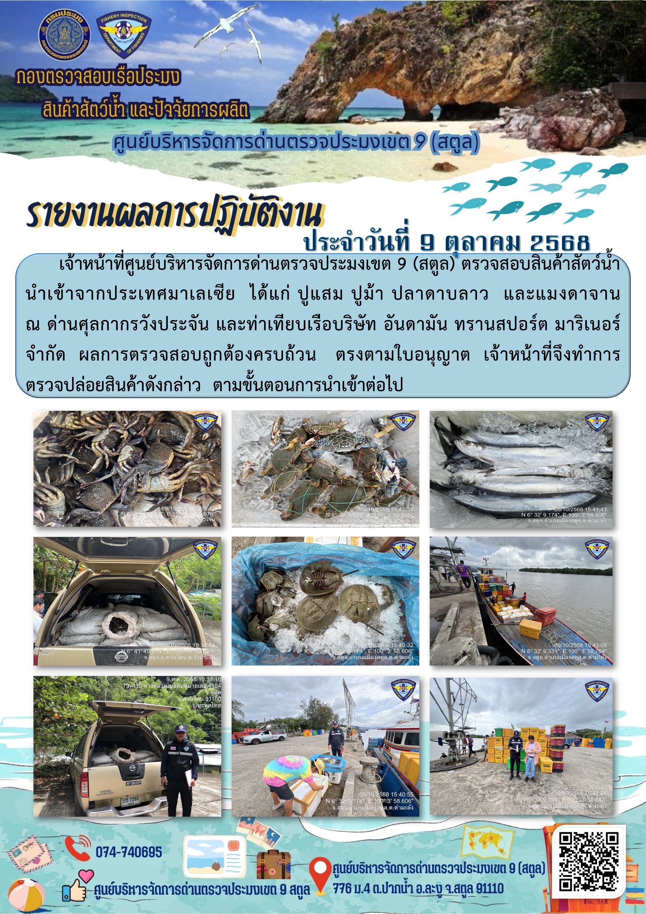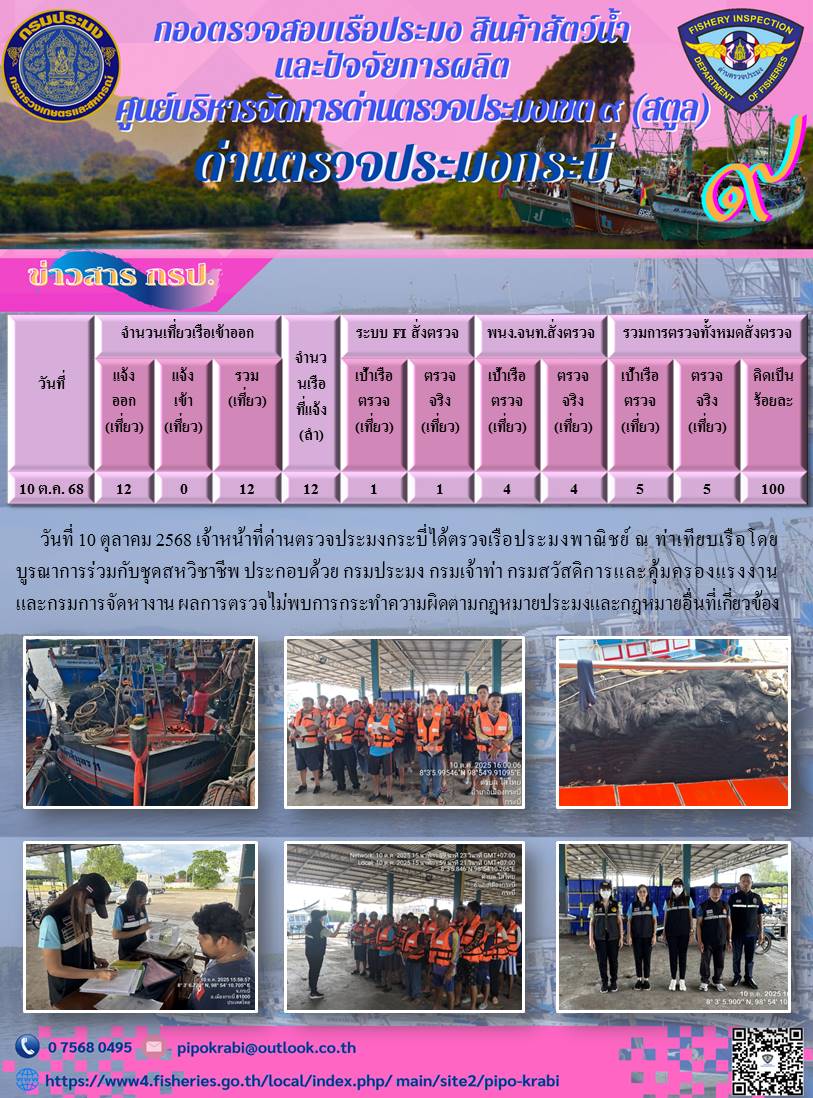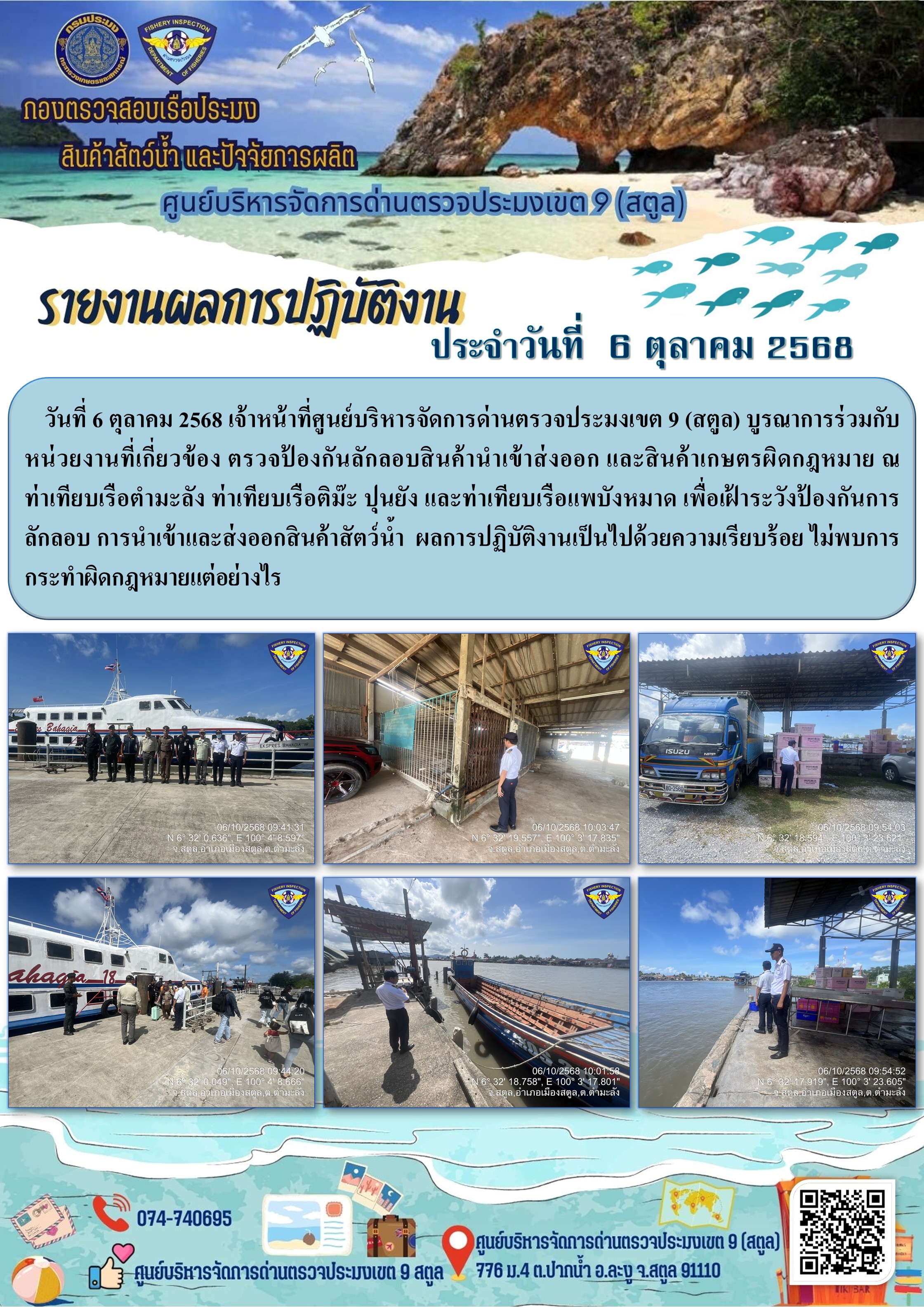 ประชาสัมพันธ์การปฏิบัติงานศูนย์บริหารจัดการด่านตรวจประมงเขต 9 (สตูล) ประจำวันที่ 6 - 10 ตุลาคม 2568