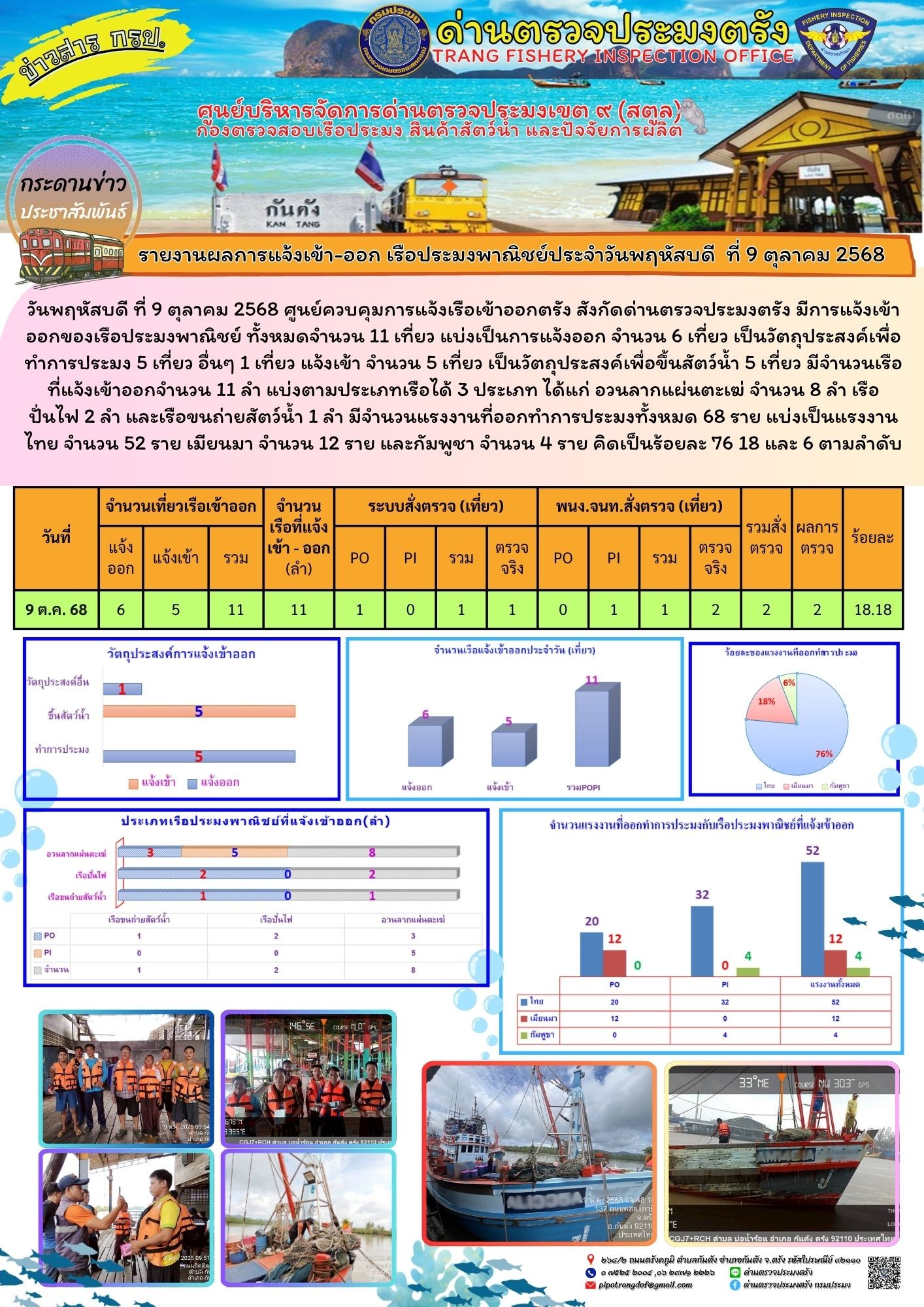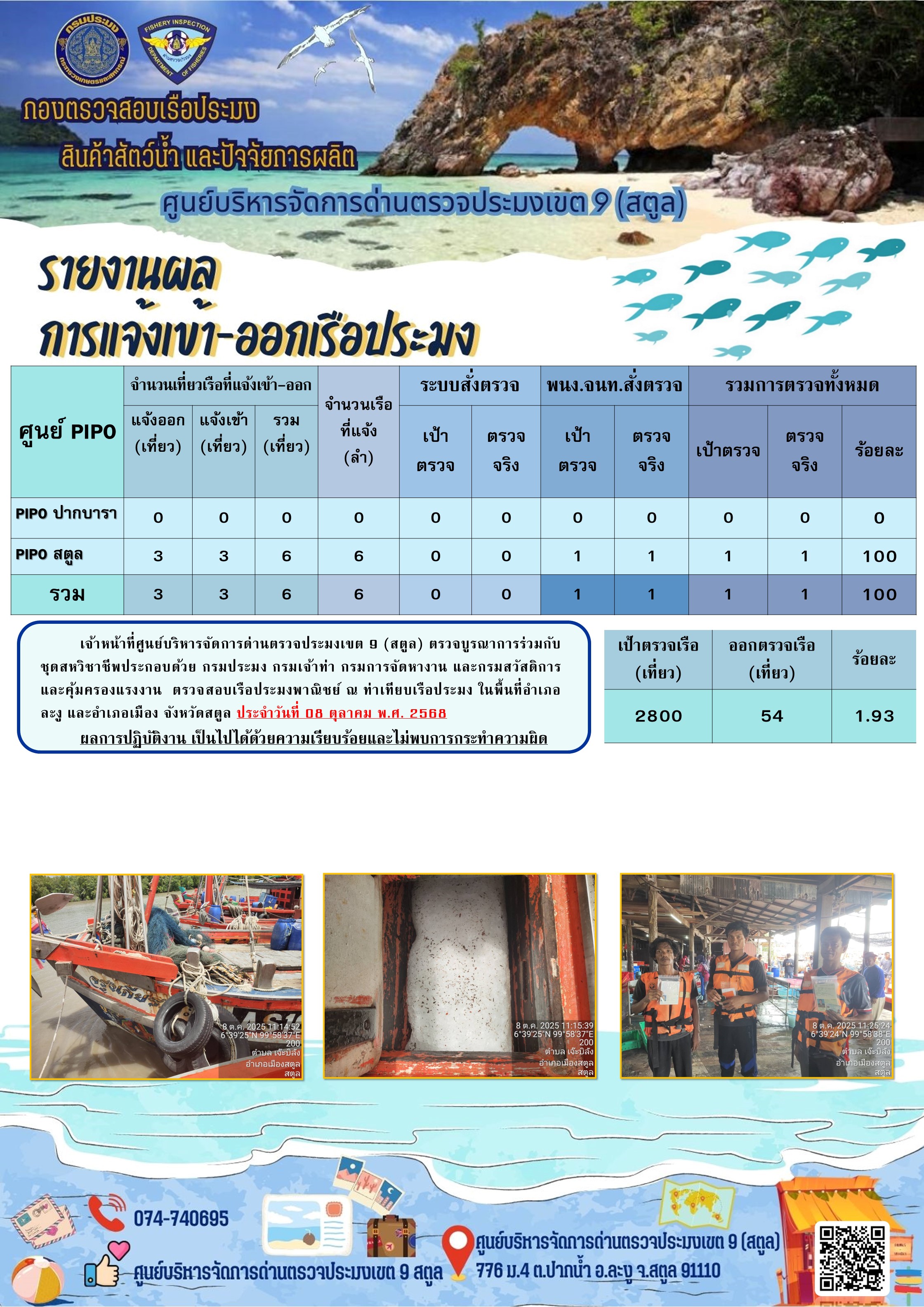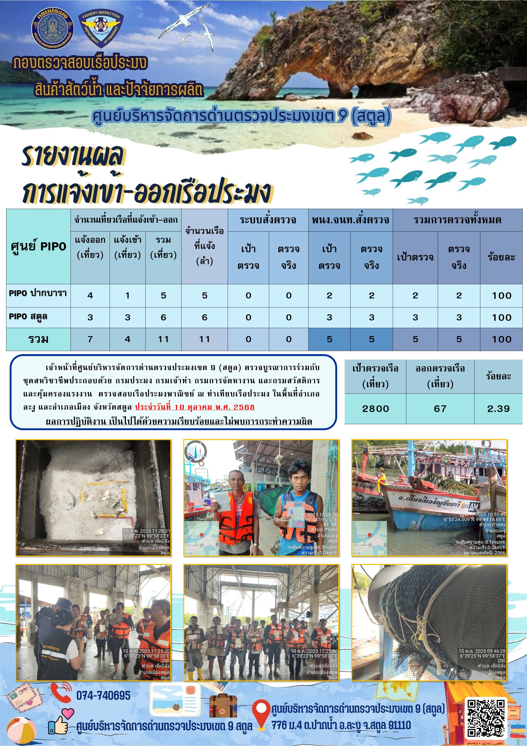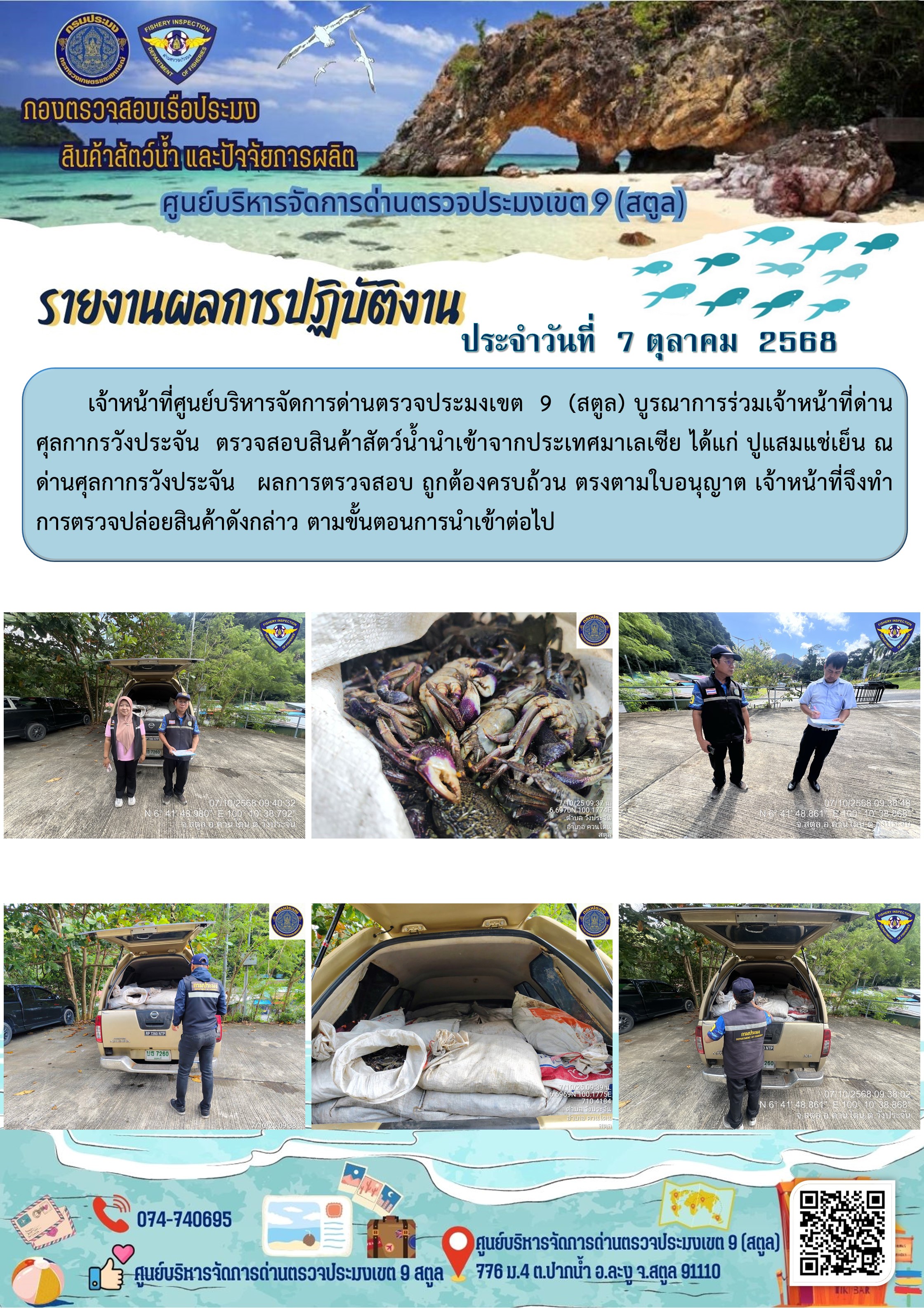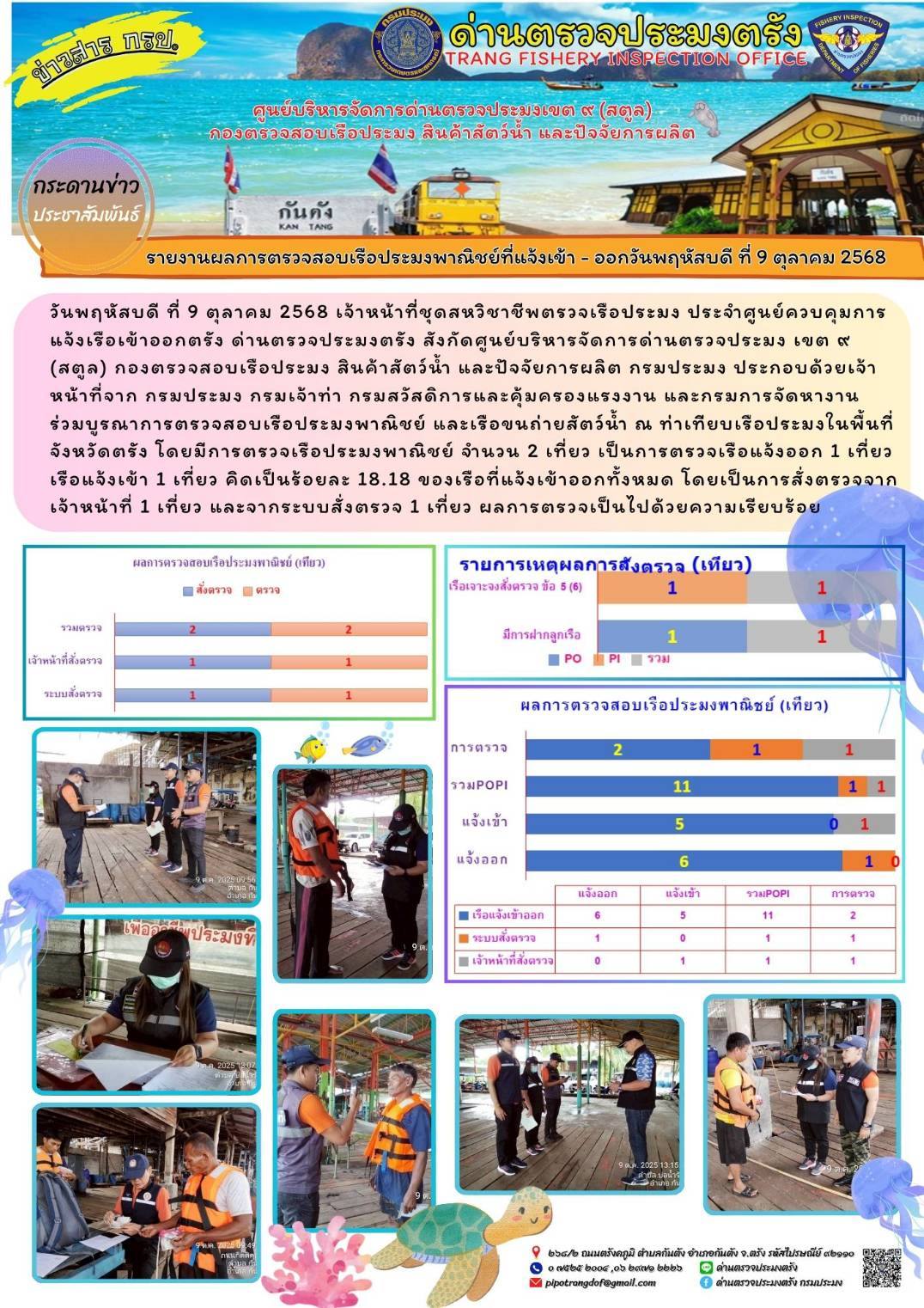 ประชาสัมพันธ์การปฏิบัติงานศูนย์บริหารจัดการด่านตรวจประมงเขต 9 (สตูล) ประจำวันที่ 6 - 10 ตุลาคม 2568