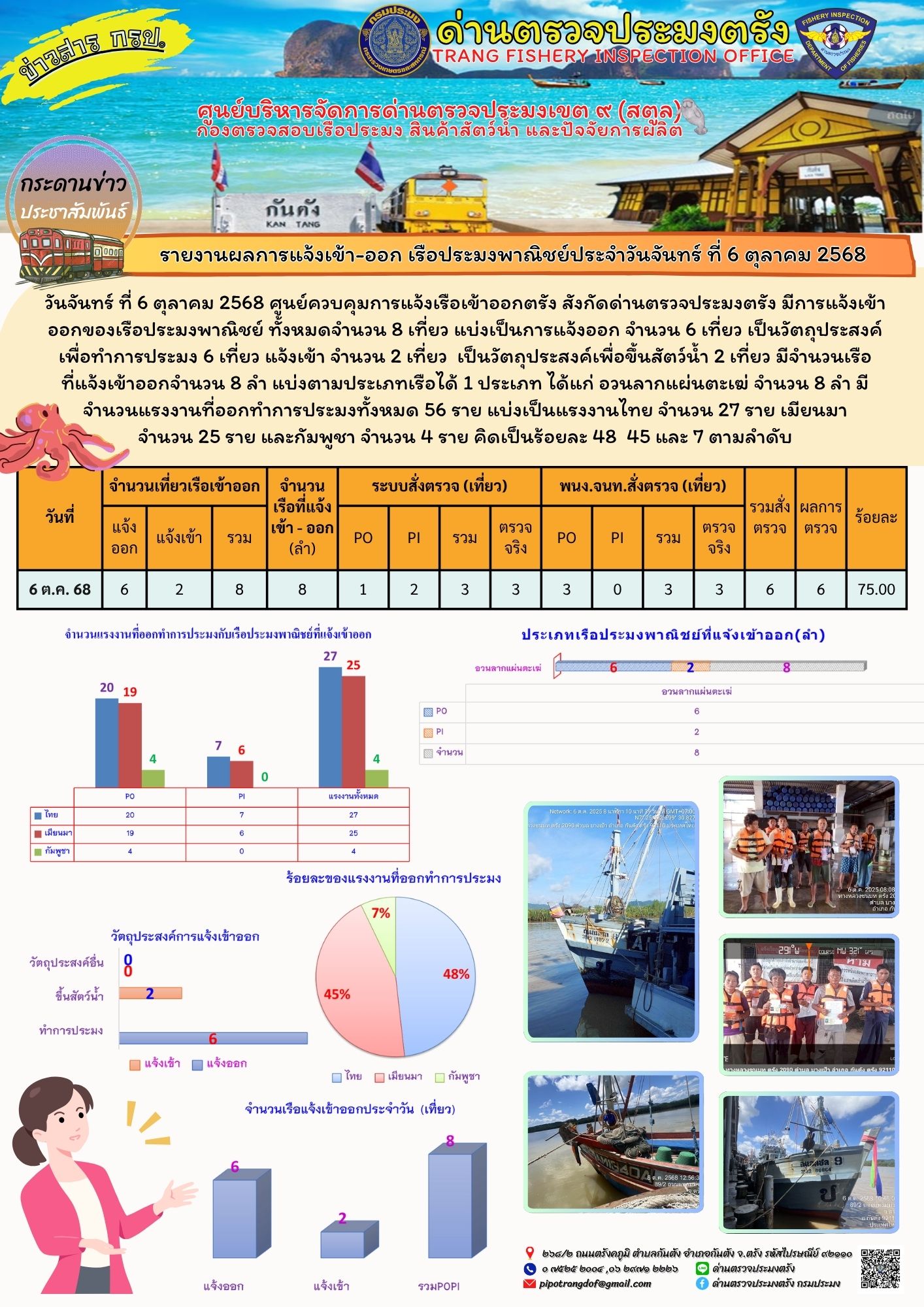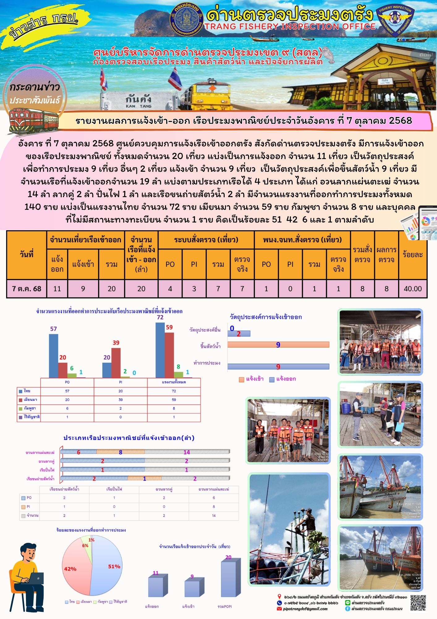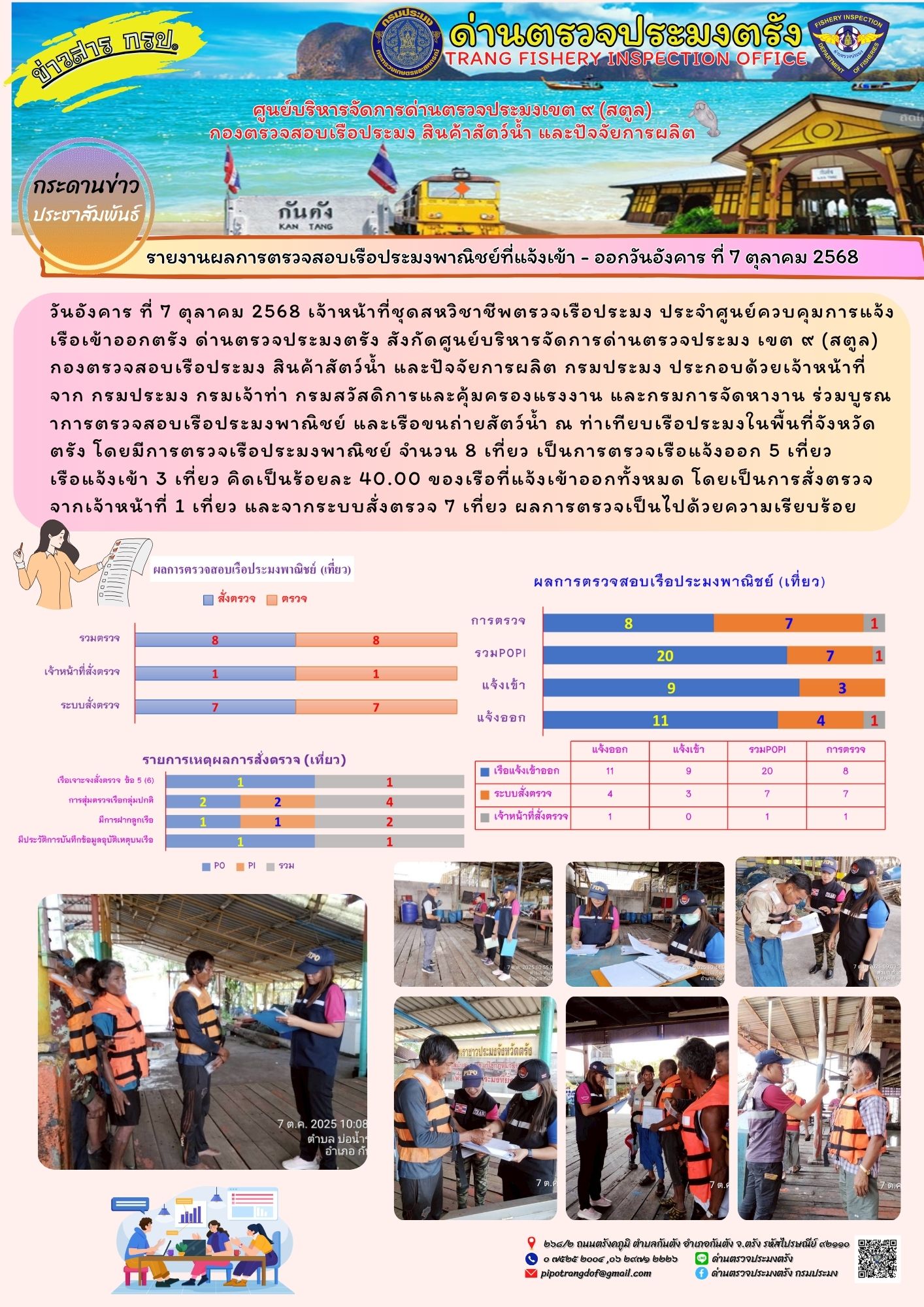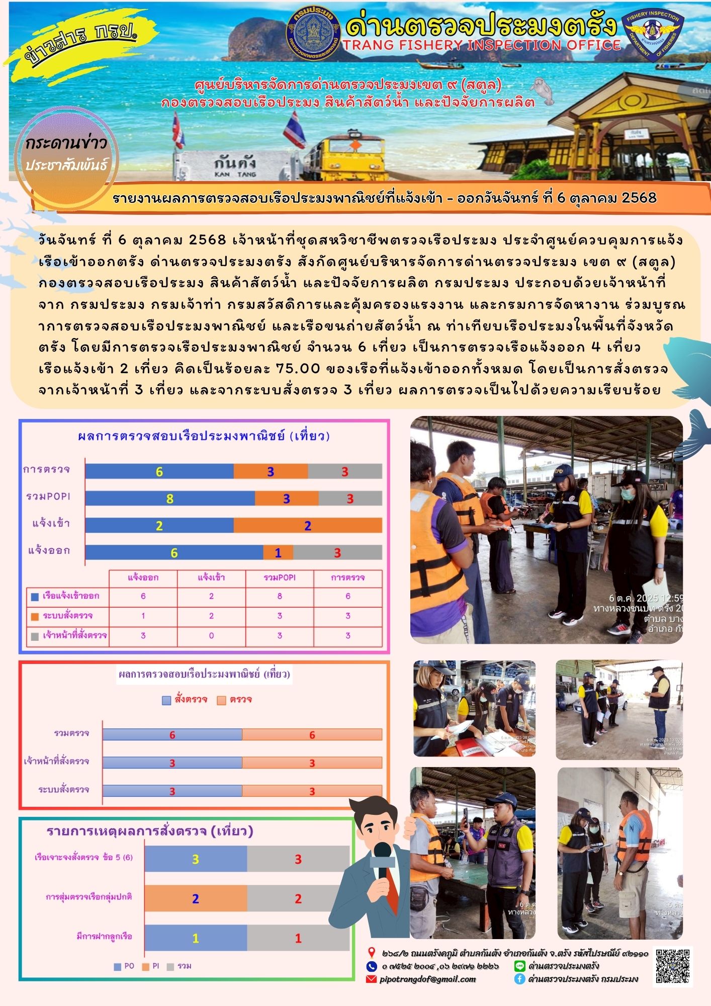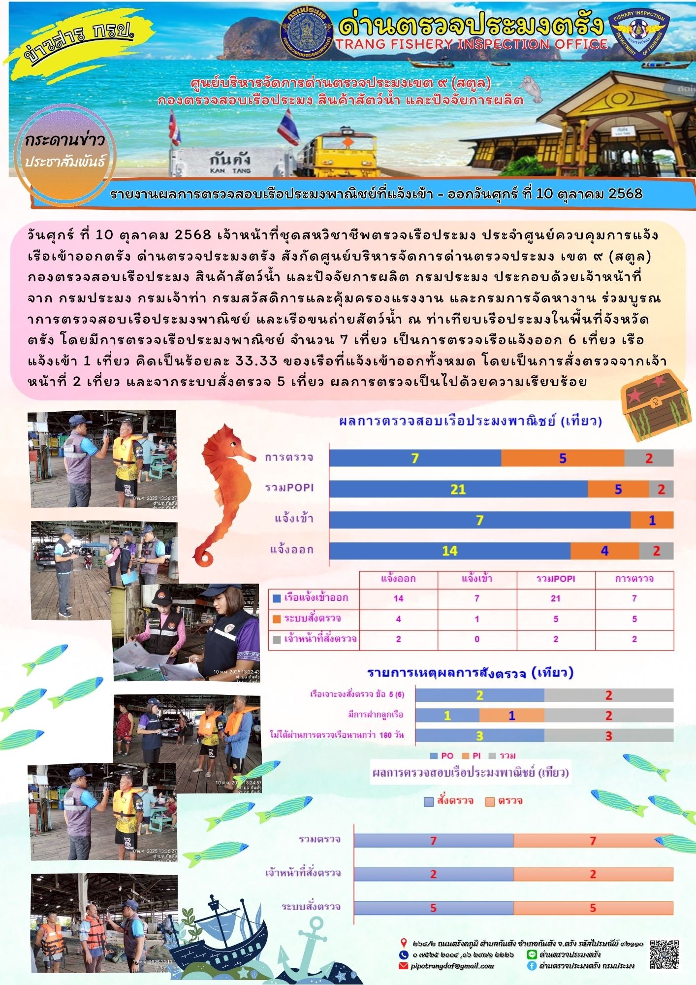 ประชาสัมพันธ์การปฏิบัติงานศูนย์บริหารจัดการด่านตรวจประมงเขต 9 (สตูล) ประจำวันที่ 6 - 10 ตุลาคม 2568